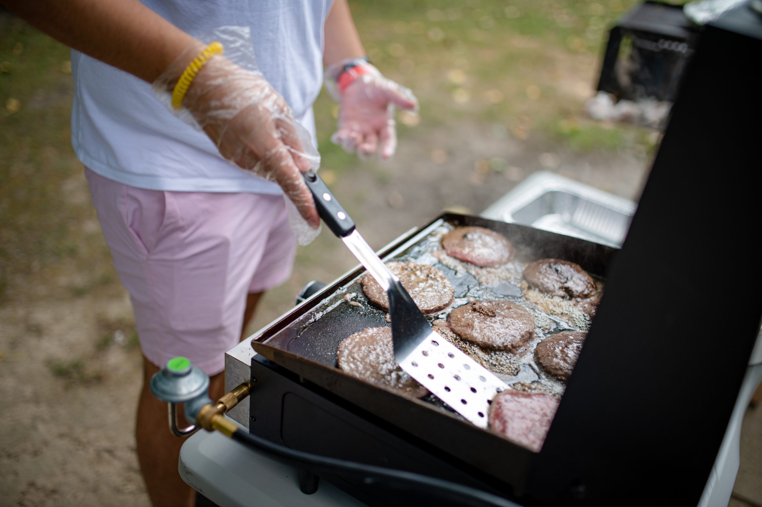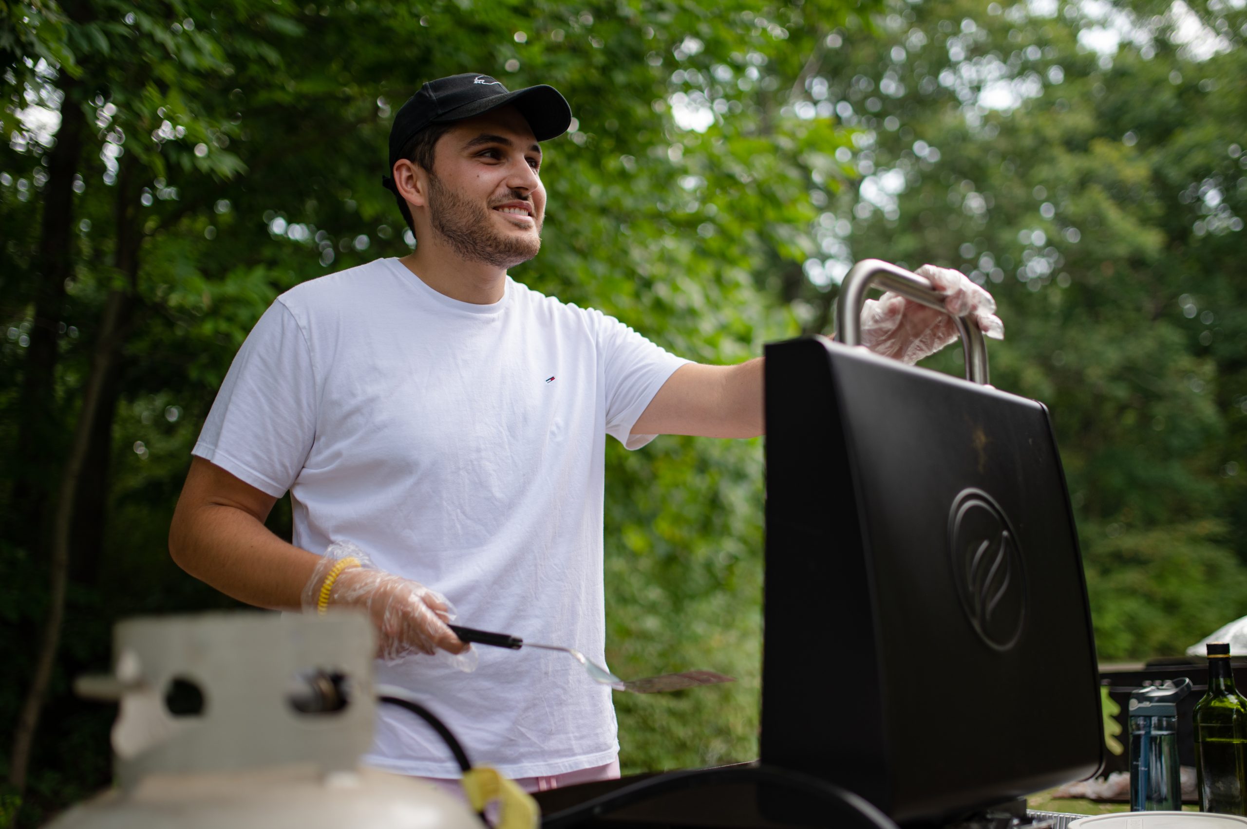 Zain Salman, a member of the Arab American Heritage Council’s leadership committee, grills burgers during the Arab American Heritage Council’s annual community picnic at Seven Lakes State Park in Holly, Mich. on Sunday, Aug. 28, 2022. (Michael Indriolo | Flint Beat)