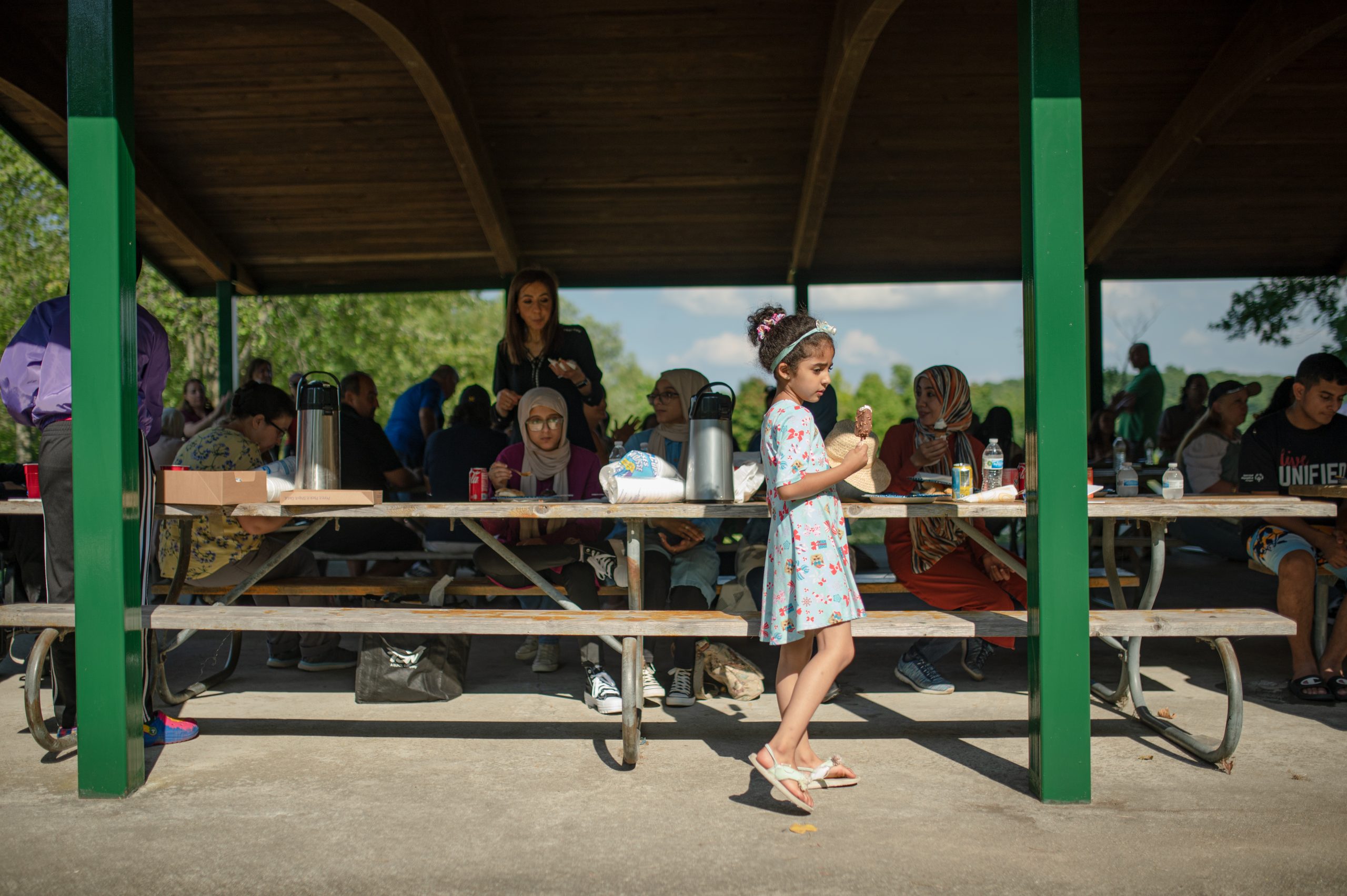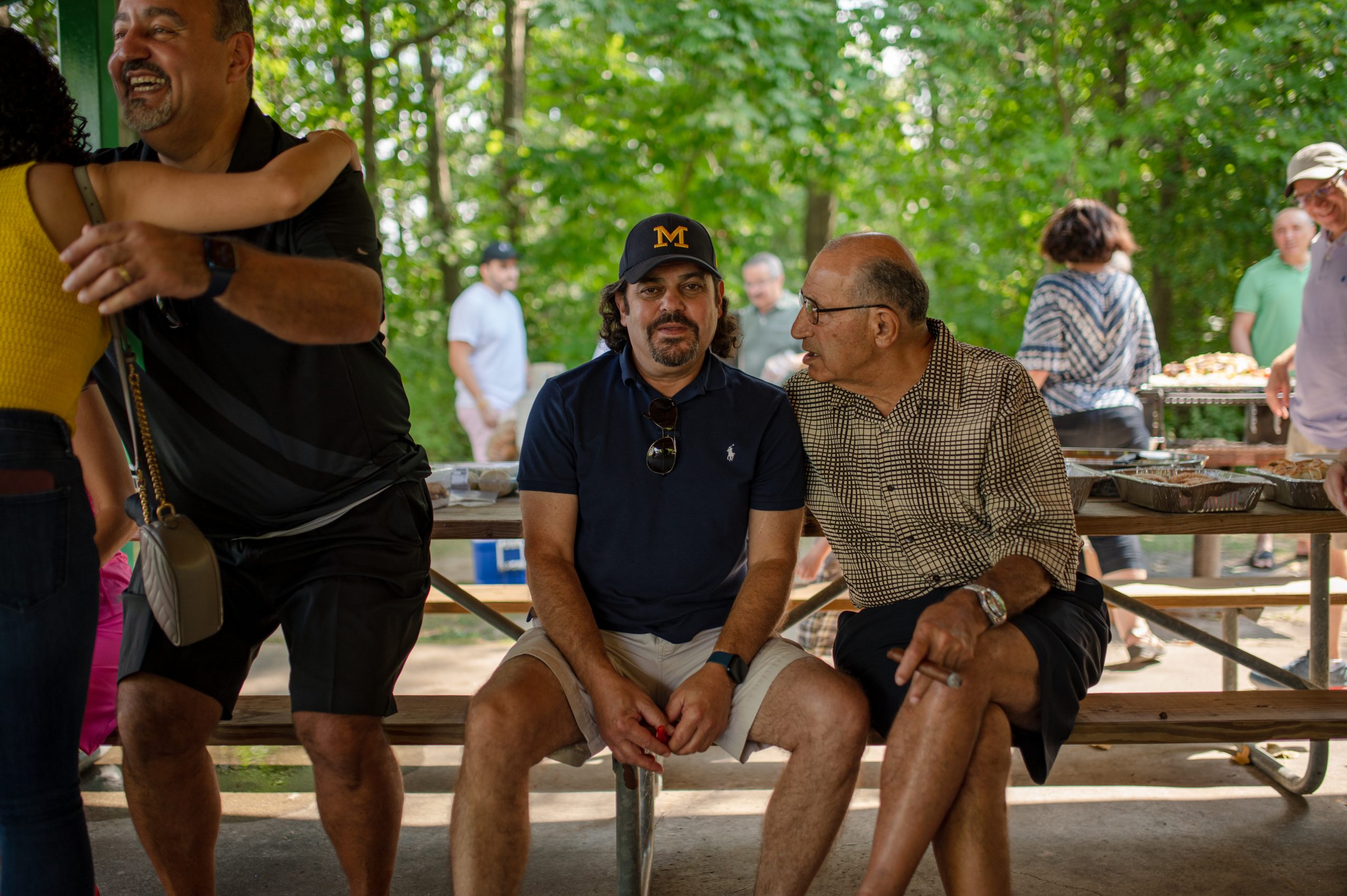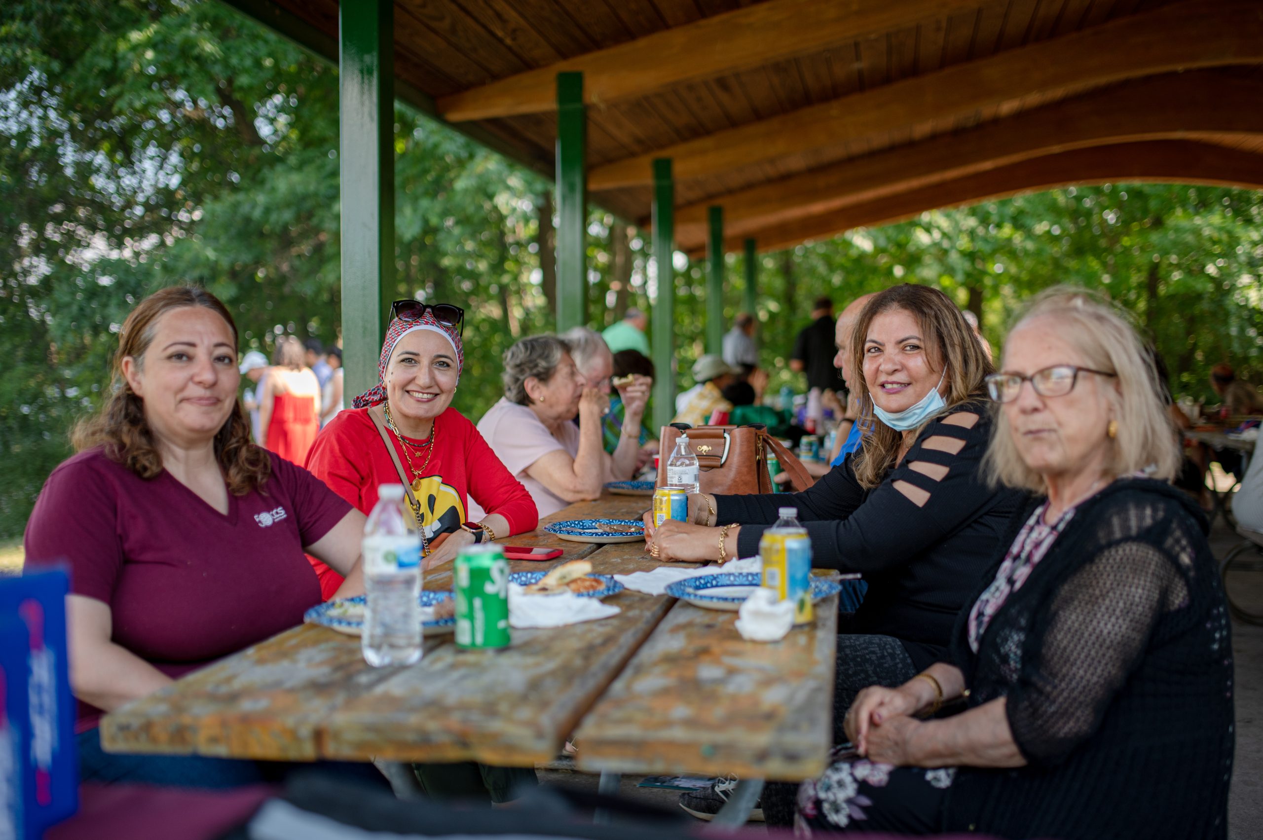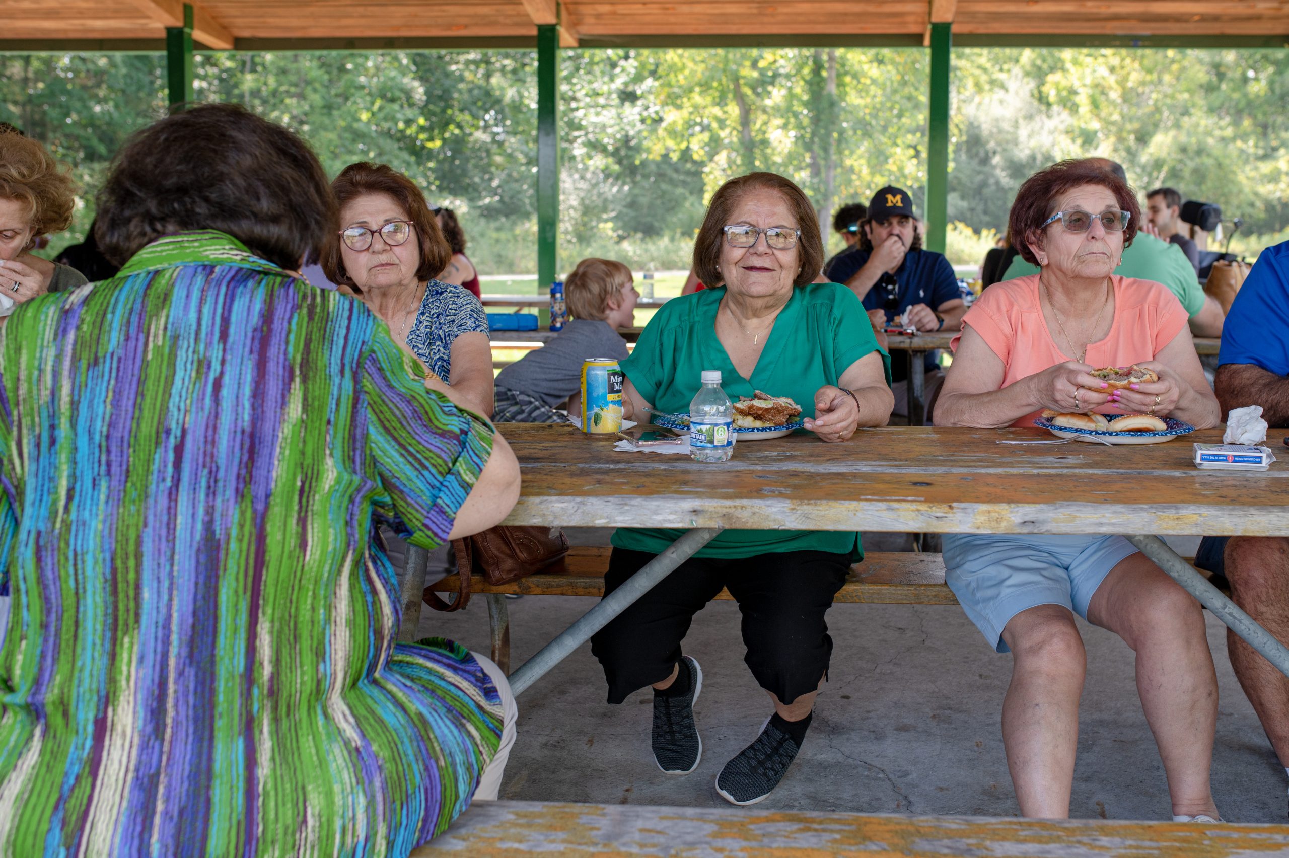 Hiam Andoni, Victoria Nassar and other picnic attendees sit down to eat in the Fisherman’s Cove Pavilion during the Arab American Heritage Council’s annual community picnic at Seven Lakes State Park in Holly, Mich. on Sunday, Aug. 28, 2022. (Michael Indriolo | Flint Beat)