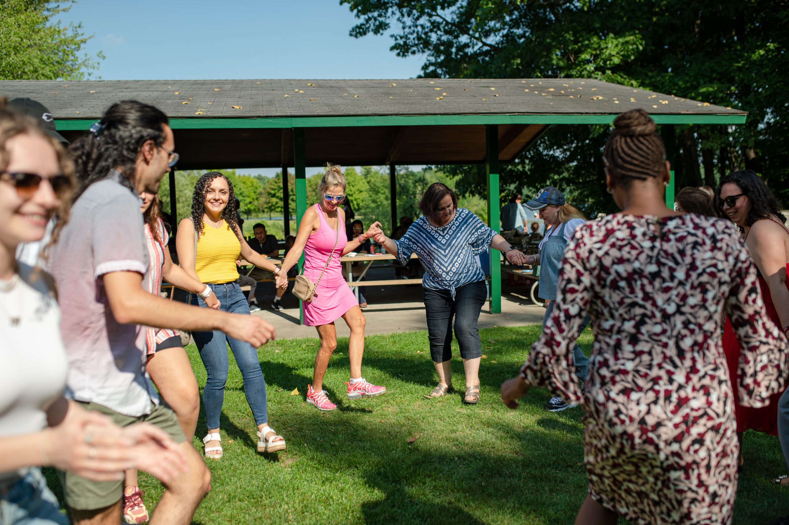 Ayman Haidar stands up to hug a friend while Saed Sahouri and Karam Nassar hang out at a picnic table in the Fisherman’s Cove Pavilion during the Arab American Heritage Council’s annual community picnic at Seven Lakes State Park in Holly, Mich. on Sunday, Aug. 28, 2022. (Michael Indriolo | Flint Beat)Picnic attendees sit down to eat in the Fisherman’s Cove Pavilion during the Arab American Heritage Council’s annual community picnic at Seven Lakes State Park in Holly, Mich. on Sunday, Aug. 28, 2022. (Michael Indriolo | Flint Beat)Picnic attendees try their hands at Dabke, a traditional Levantine folk dance performed at weddings and other celebrations in countries like Palestine, Syria, Lebanon and Jordan, during the Arab American Heritage Council’s annual community picnic at Seven Lakes State Park in Holly, Mich. on Sunday, Aug. 28, 2022. Nora Sharba and Deena Sukhon, who performed Dabke with a travel team throughout their time in college at the University of Michigan, taught the dance to picnic attendees. (Michael Indriolo | Flint Beat)Nora Sharba and Deena Sukhon practice a Dabke routine before teaching it to picnic attendees during the Arab American Heritage Council’s annual community picnic at Seven Lakes State Park in Holly, Mich. on Sunday, Aug. 28, 2022. Dabke is a traditional Levantine folk dance performed at weddings and other celebrations in countries like Palestine, Syria, Lebanon and Jordan. Sharba and Sukhon led a group of dancers while they studied at the University of Michigan, they said, eventually joining a travel team and performing across the state. (Michael Indriolo | Flint Beat)Hiba Saadeldin, Salih Mohammed and Jude Mohammed get plates of food from the spread laid out on a picnic table in the Fisherman’s Cove Pavilion during the Arab American Heritage Council’s annual community picnic at Seven Lakes State Park in Holly, Mich. on Sunday, Aug. 28, 2022. (Michael Indriolo | Flint Beat)