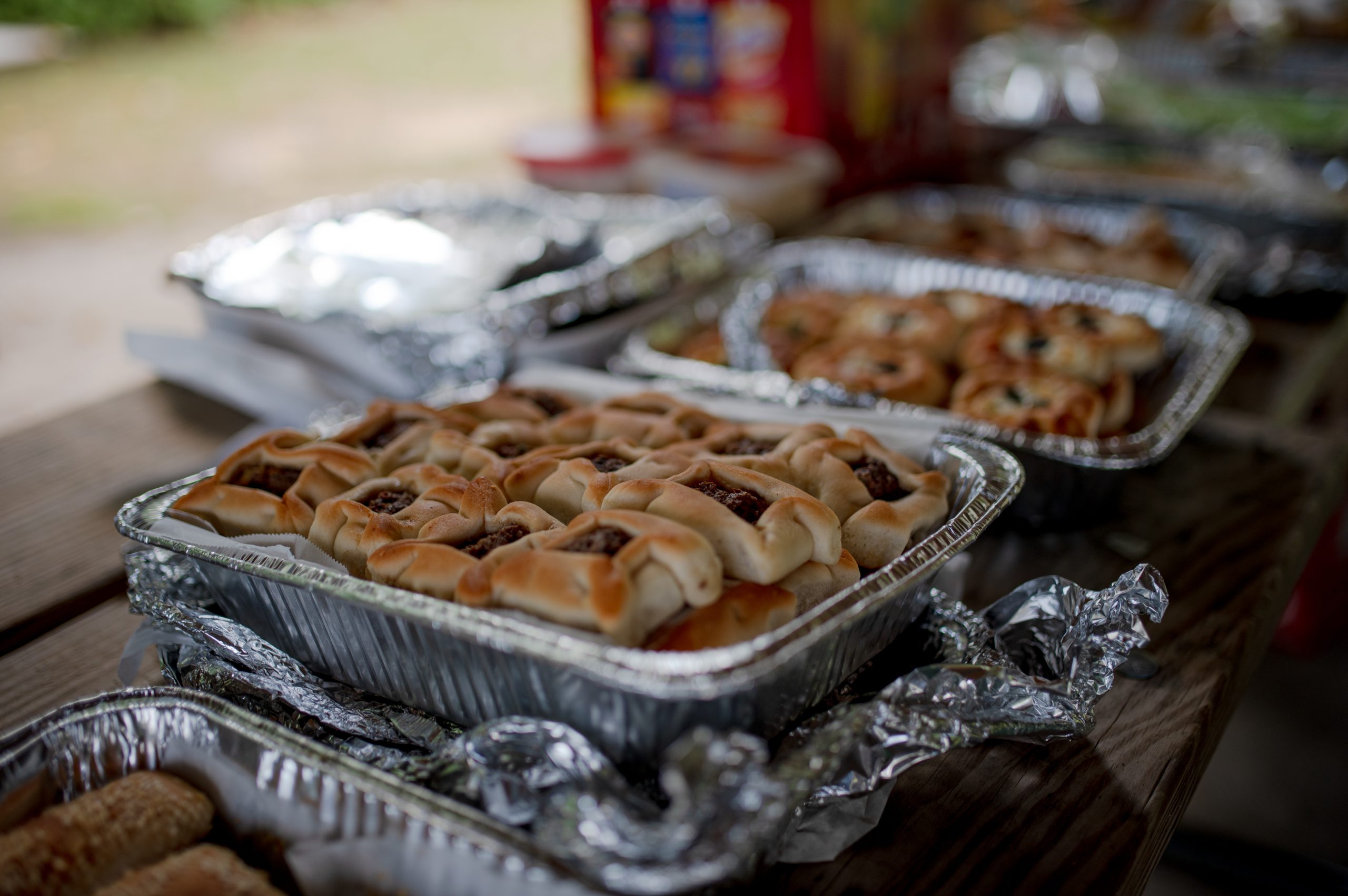 Homemade sfiha, or meat pies, rest on a picnic table during the Arab American Heritage Council’s annual community picnic at Seven Lakes State Park in Holly, Mich. on Sunday, Aug. 28, 2022. (Michael Indriolo | Flint Beat)