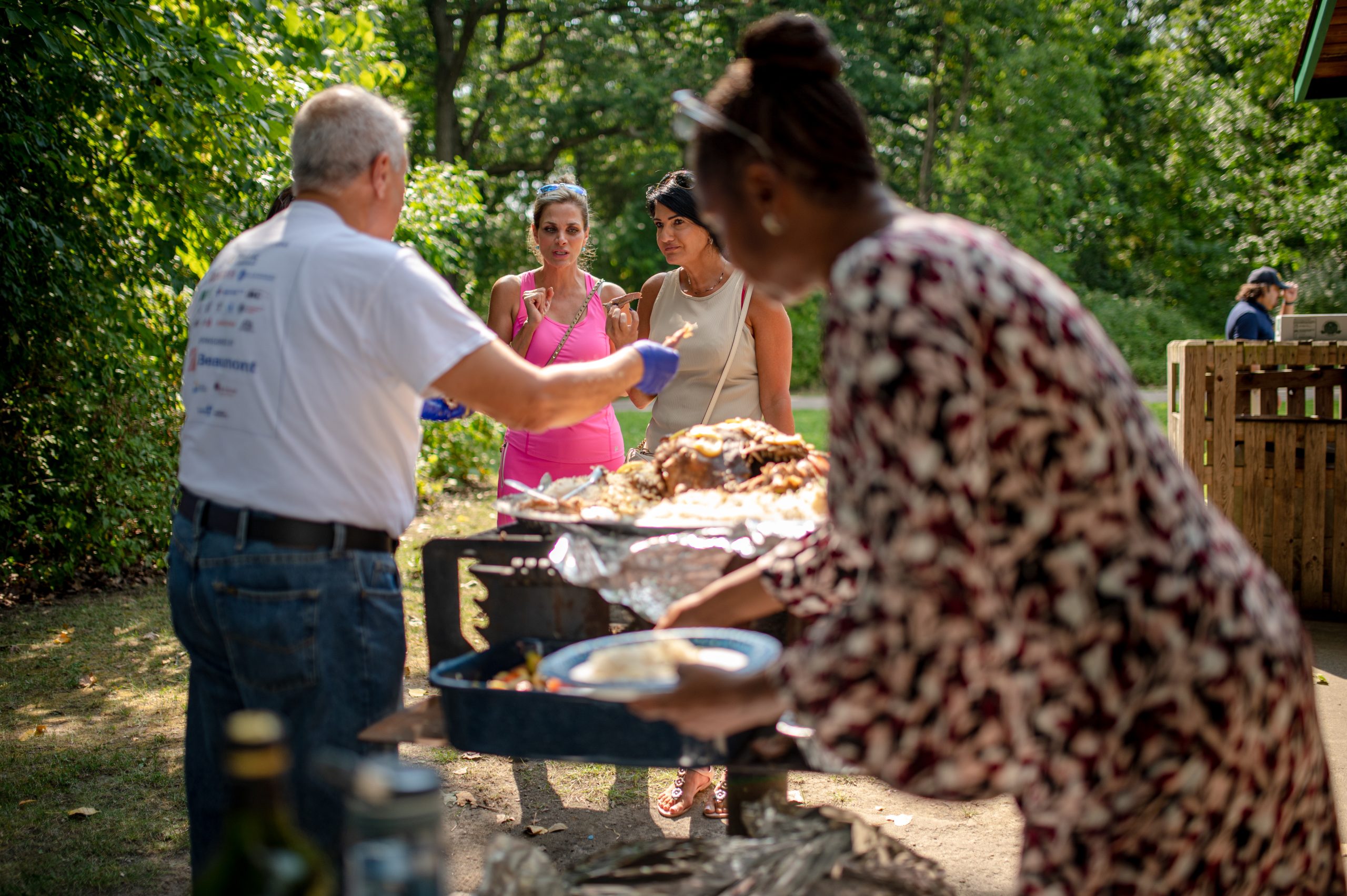 Dr. Abd Alghanem, Vice president of the Arab American Heritage Council’s board, prepares individual plates of roasted lamb with rice and veggies during the Arab American Heritage Council’s annual community picnic at Seven Lakes State Park in Holly, Mich. on Sunday, Aug. 28, 2022. Alghanem is a former president of the Arab American Heritage Council. He now serves as an assistant clinical professor at Michigan State University, and he has practiced medicine in Flint, Mich. since 1989, according to the Arab American Heritage Council’s website. (Michael Indriolo | Flint Beat)