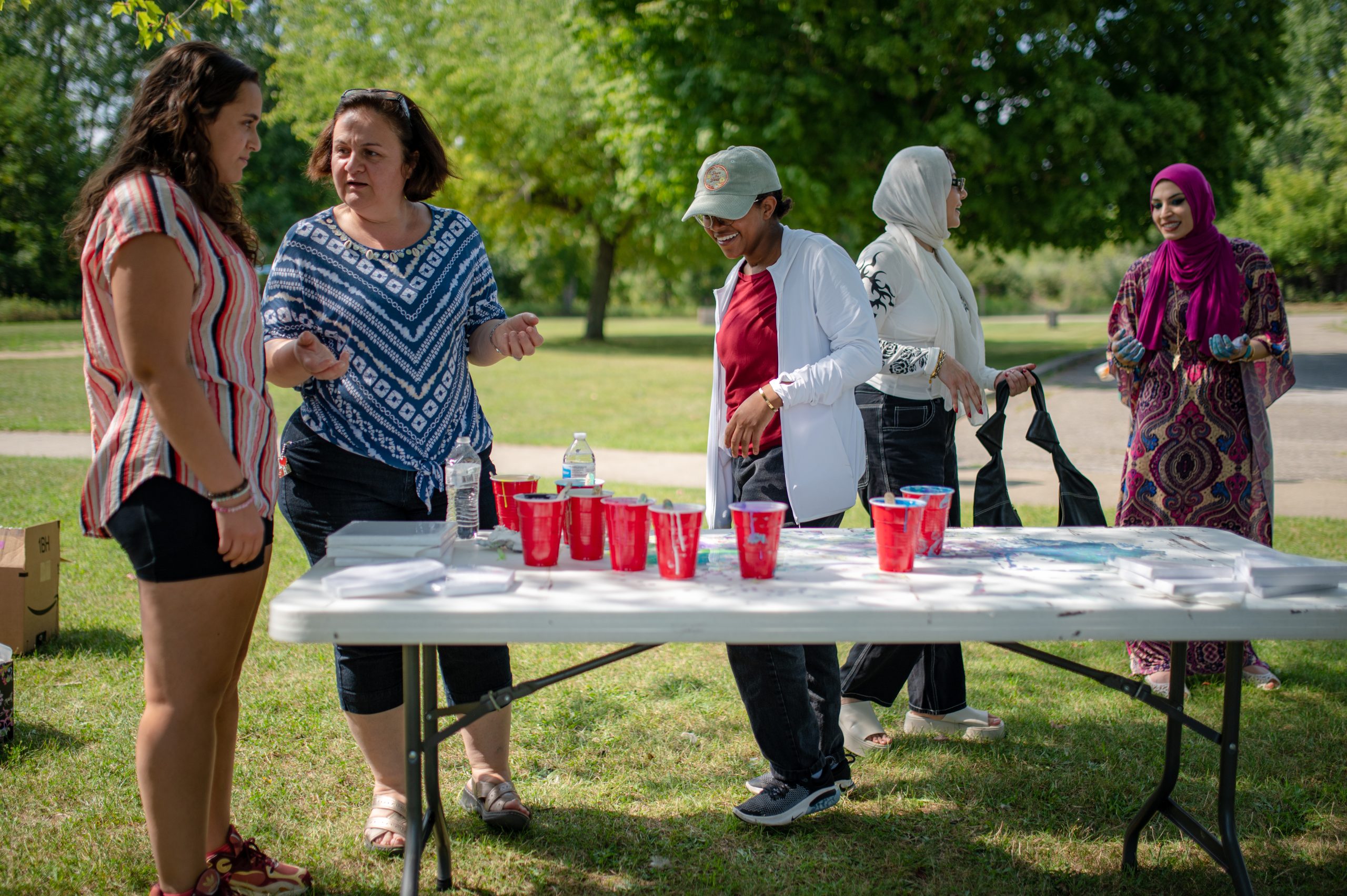 Summer Salman, Reem Salman, Rayna Ahmed, Iaman Khrais and Zhraa Mohammed chat while they create marble paintings during the Arab American Heritage Council’s annual community picnic at Seven Lakes State Park in Holly, Mich. on Sunday, Aug. 28, 2022. (Michael Indriolo | Flint Beat)