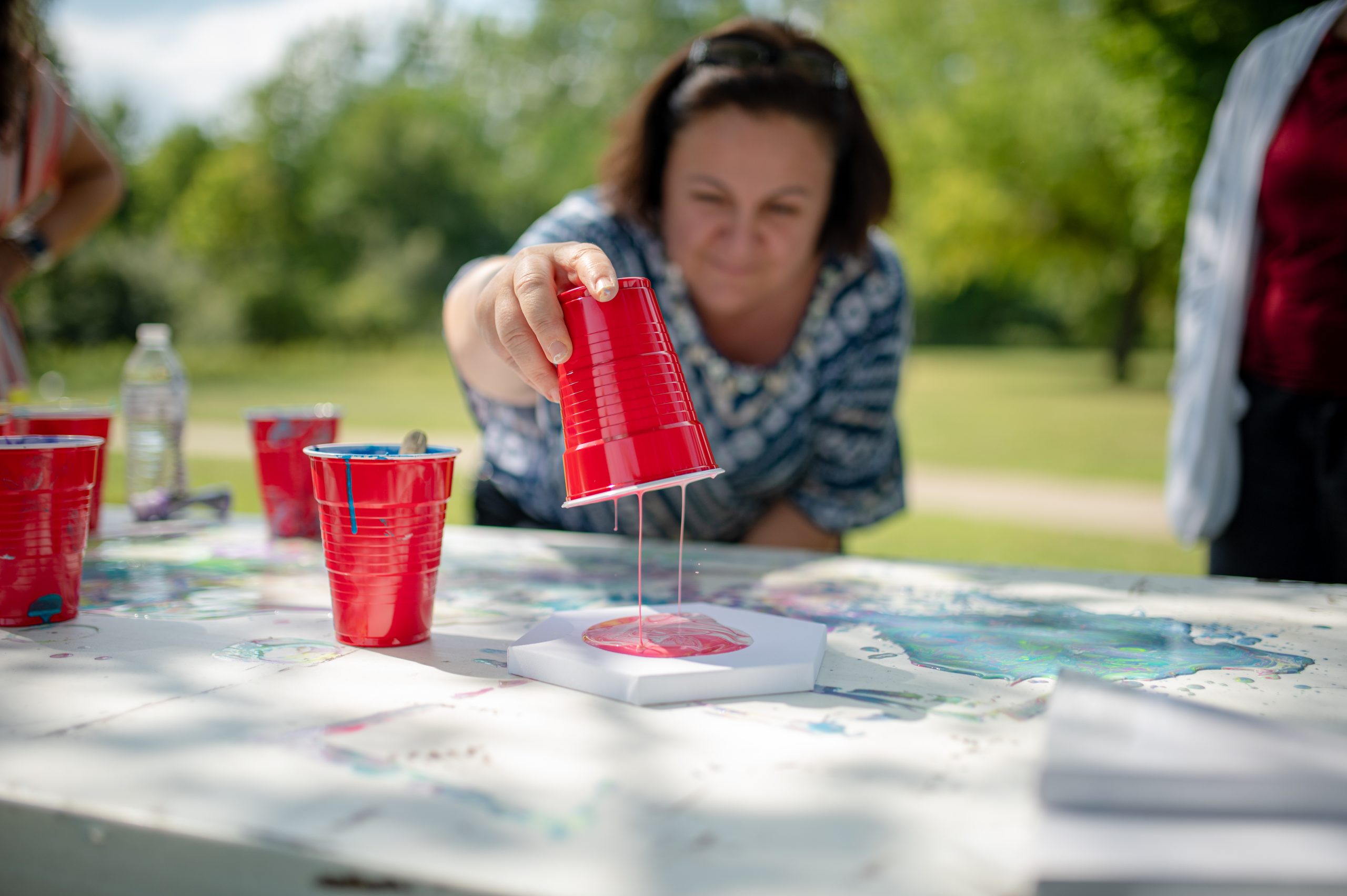 Reem Salman lifts a cup filled with paint, a technique Zhraa Mohammed taught her, to create a marble painting during the Arab American Heritage Council’s annual community picnic at Seven Lakes State Park in Holly, Mich. on Sunday, Aug. 28, 2022. (Michael Indriolo | Flint Beat)