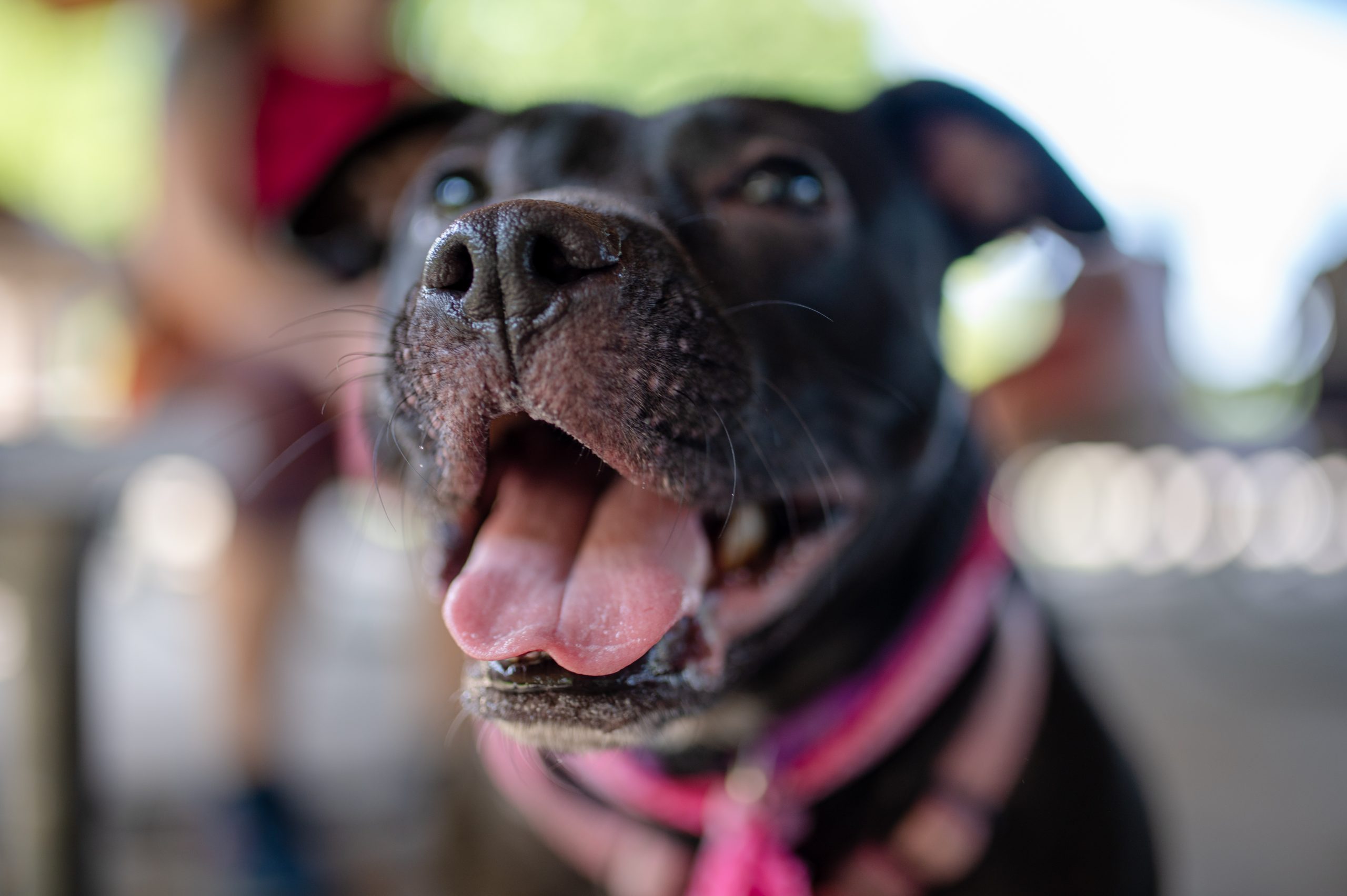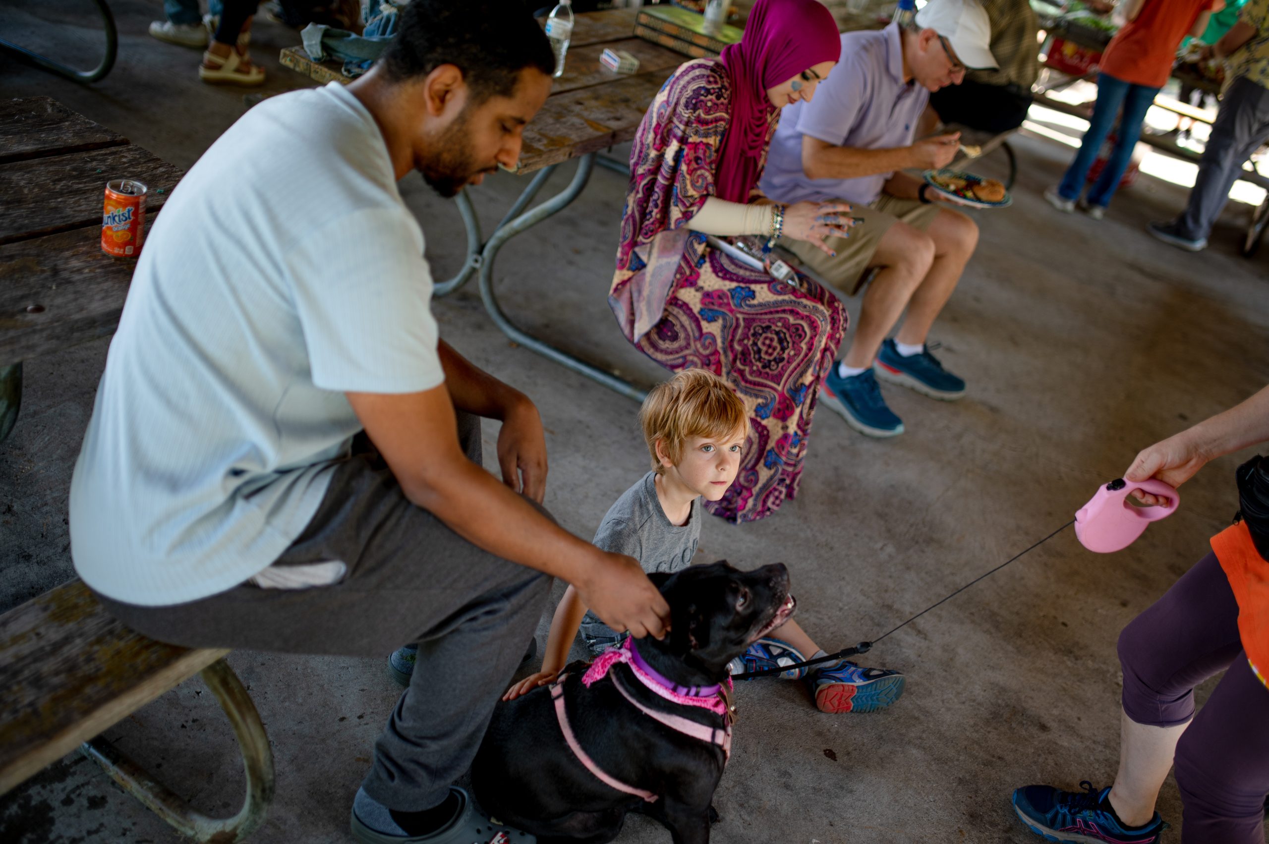 Money the dog, brought to the picnic by Faith Groesbeck, sits patiently in the shade of the Fisherman’s Cove Pavilion during the Arab American Heritage Council’s annual community picnic at Seven Lakes State Park in Holly, Mich. on Sunday, Aug. 28, 2022. (Michael Indriolo | Flint Beat)