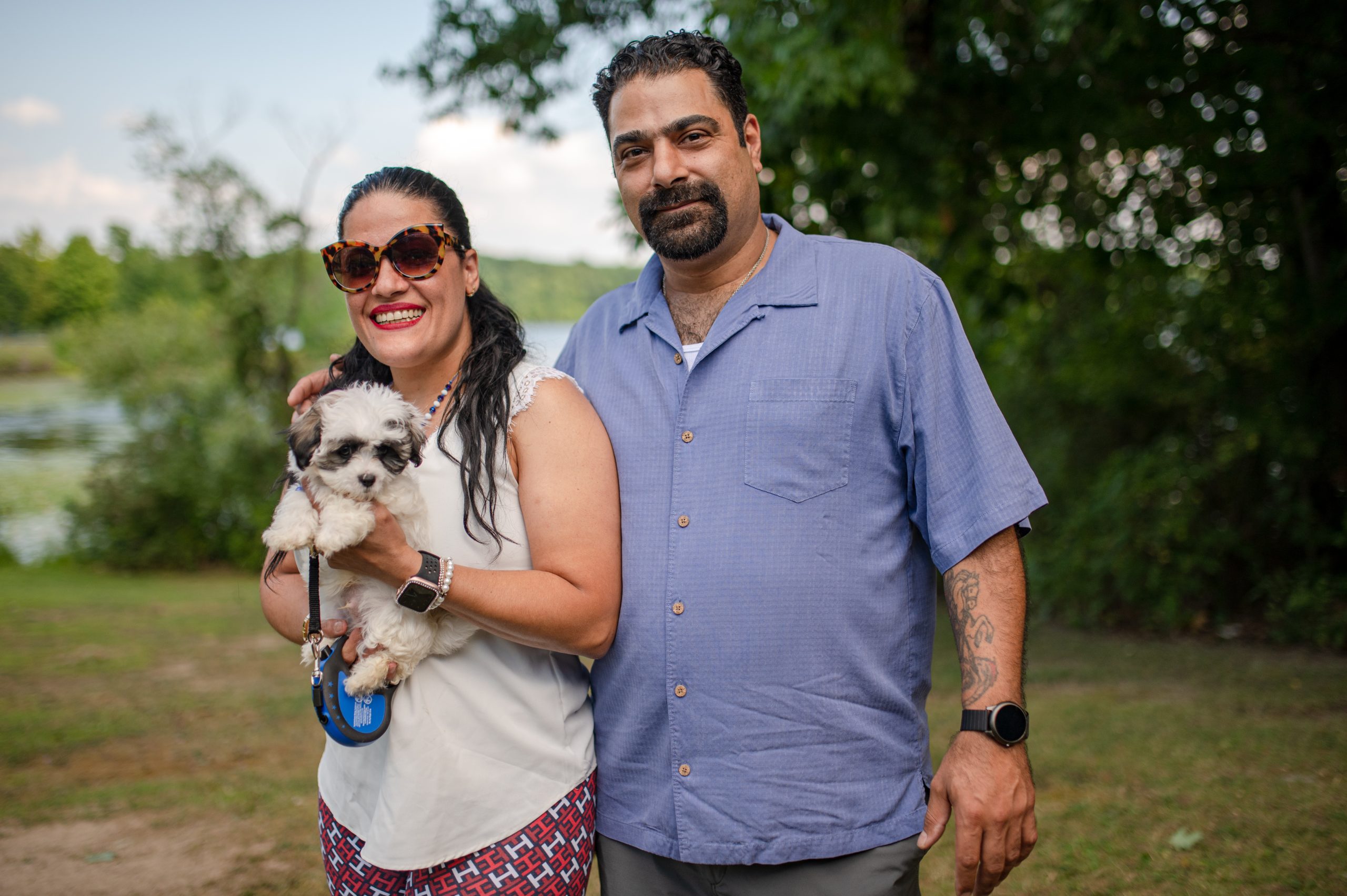 Maygela Nassar and George Nassar pose for a photo with their puppy Niko during the Arab American Heritage Council’s annual community picnic at Seven Lakes State Park in Holly, Mich. on Sunday, Aug. 28, 2022. (Michael Indriolo | Flint Beat)
