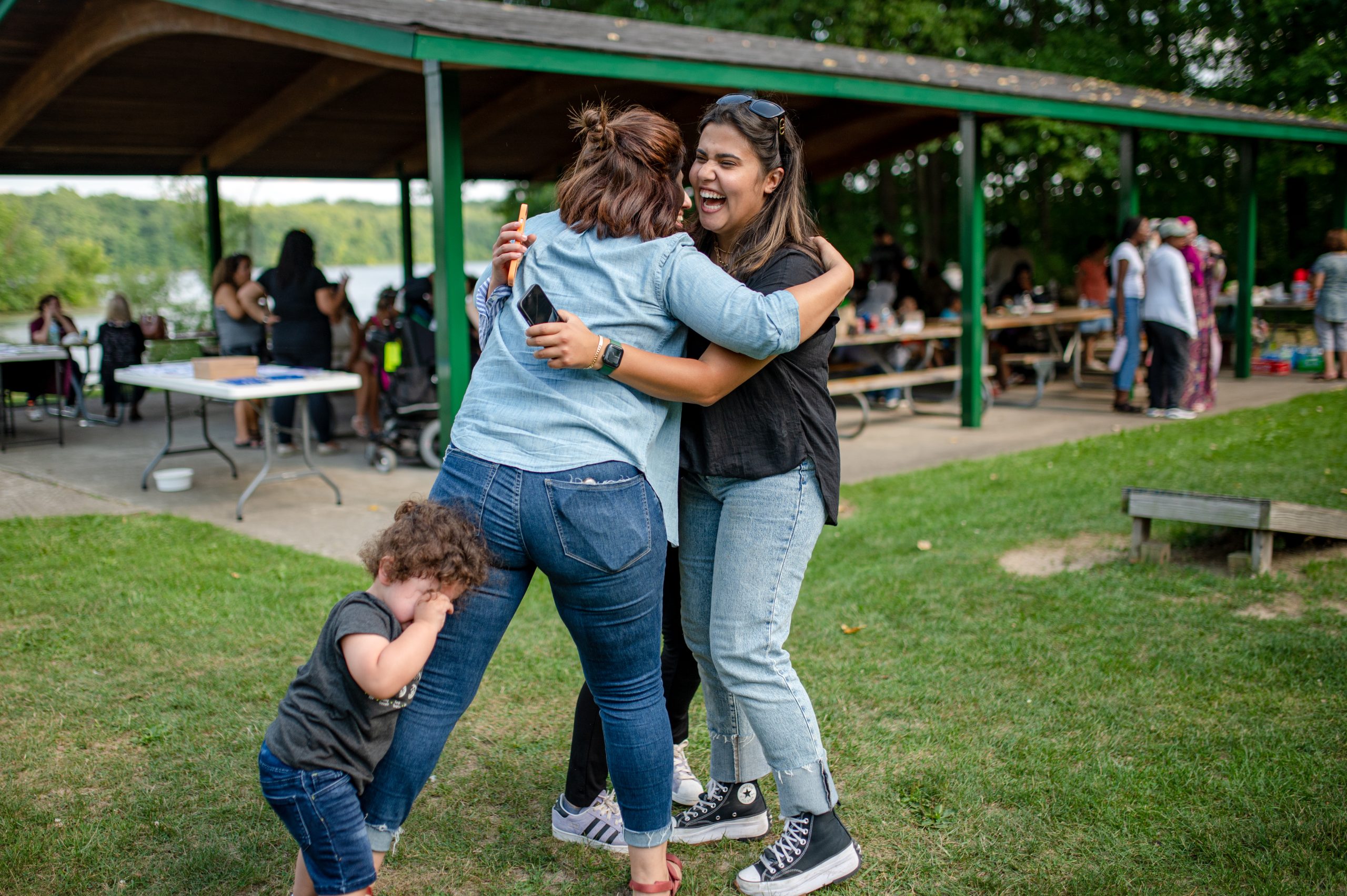Lucine Jarrah, executive director of the Arab American Heritage Council, hugs Naglaa Alnajjar and Sabrina Jarrah during the Arab American Heritage Council’s annual community picnic at Seven Lakes State Park in Holly, Mich. on Sunday, Aug. 28, 2022. (Michael Indriolo | Flint Beat)