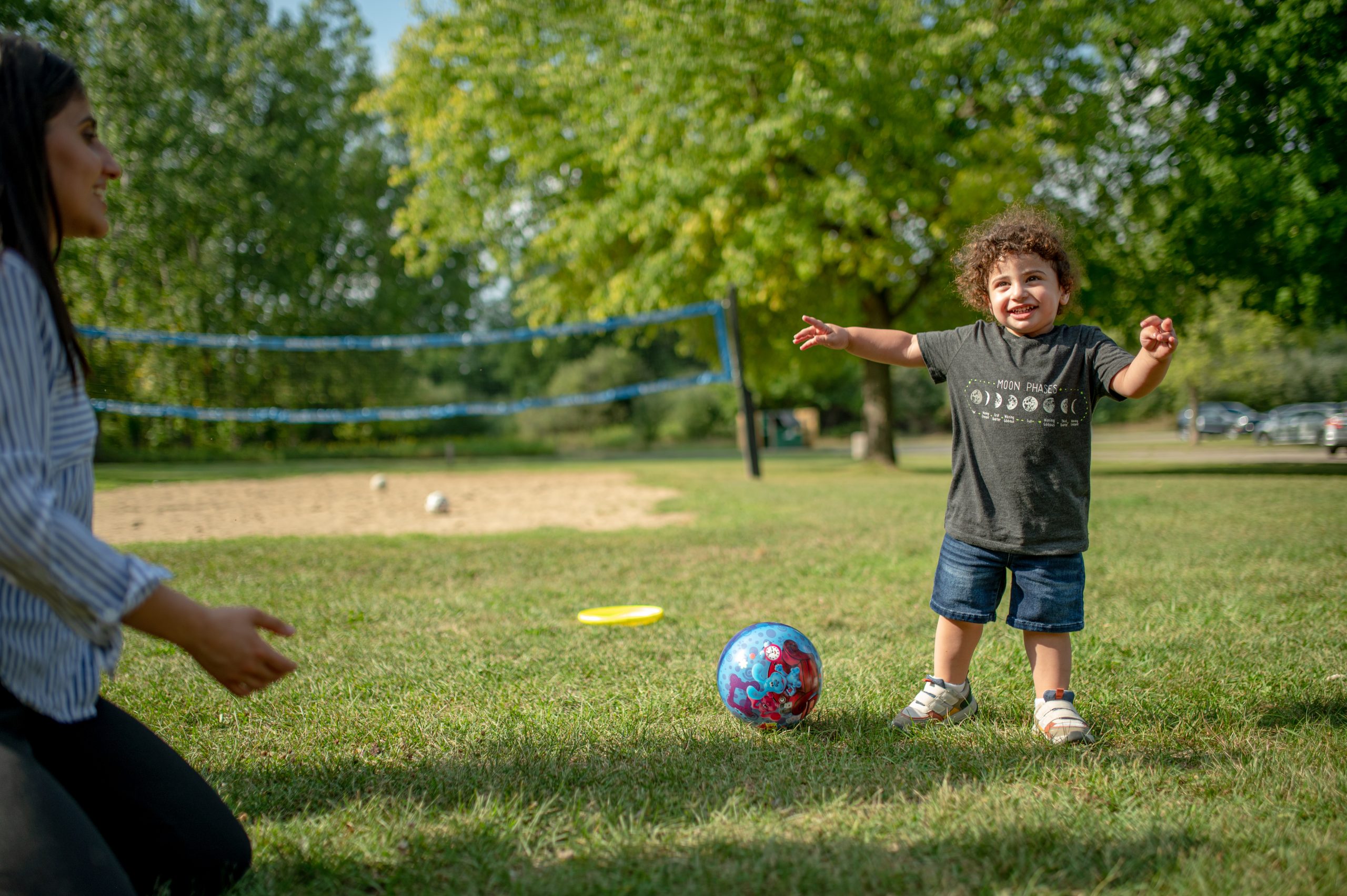 Sabrina Jarrah tosses a ball to Sanad Yacoub during the Arab American Heritage Council’s annual community picnic at Seven Lakes State Park in Holly, Mich. on Sunday, Aug. 28, 2022. (Michael Indriolo | Flint Beat)
