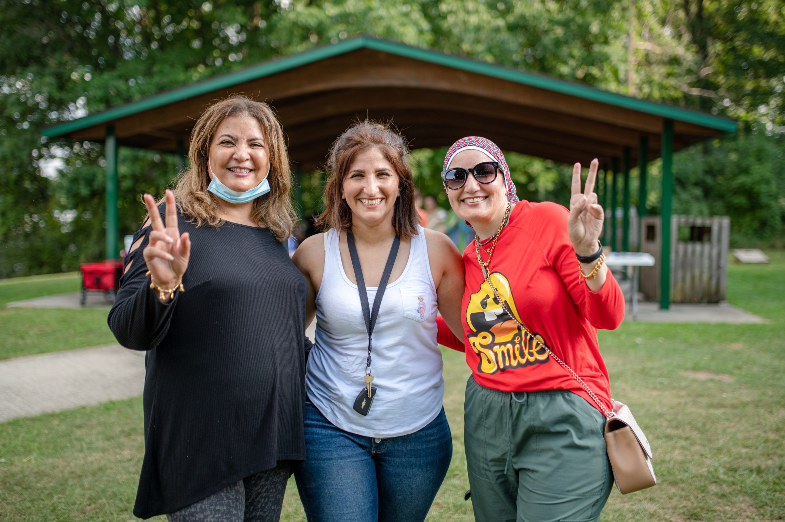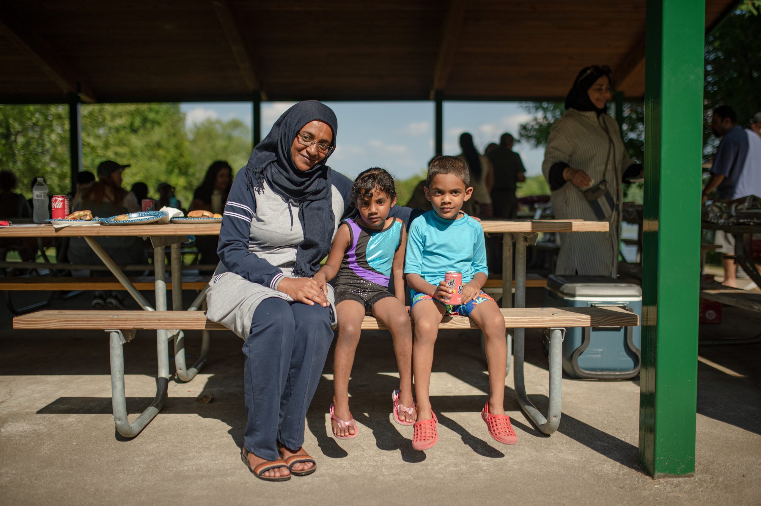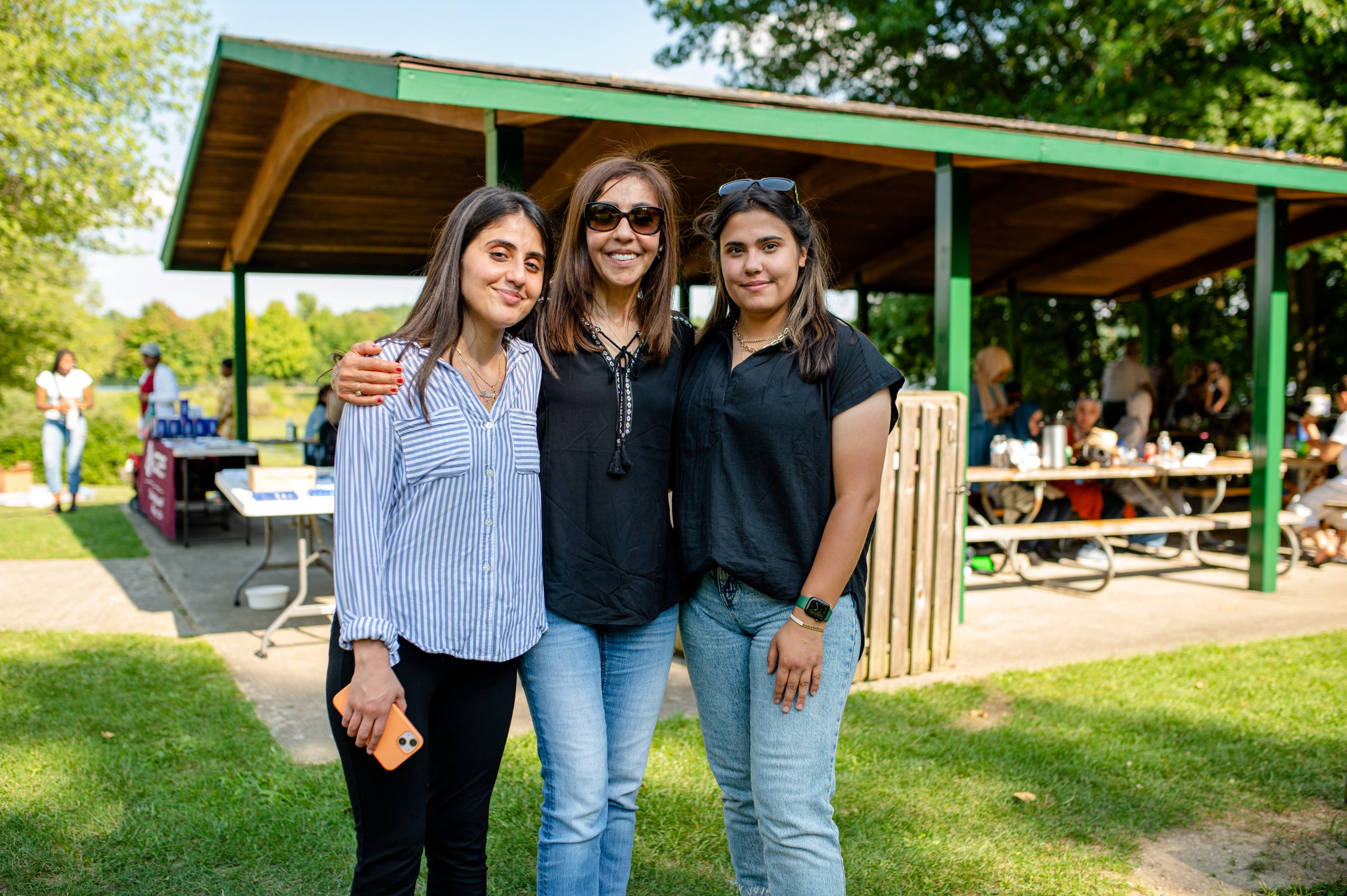 Hiba Saadeldin, Jude Mohammed and Salih Mohammed pose for a photo in the Fisherman’s Cove Pavilion during the Arab American Heritage Council’s annual community picnic at Seven Lakes State Park in Holly, Mich. on Sunday, Aug. 28, 2022. (Michael Indriolo | Flint Beat)