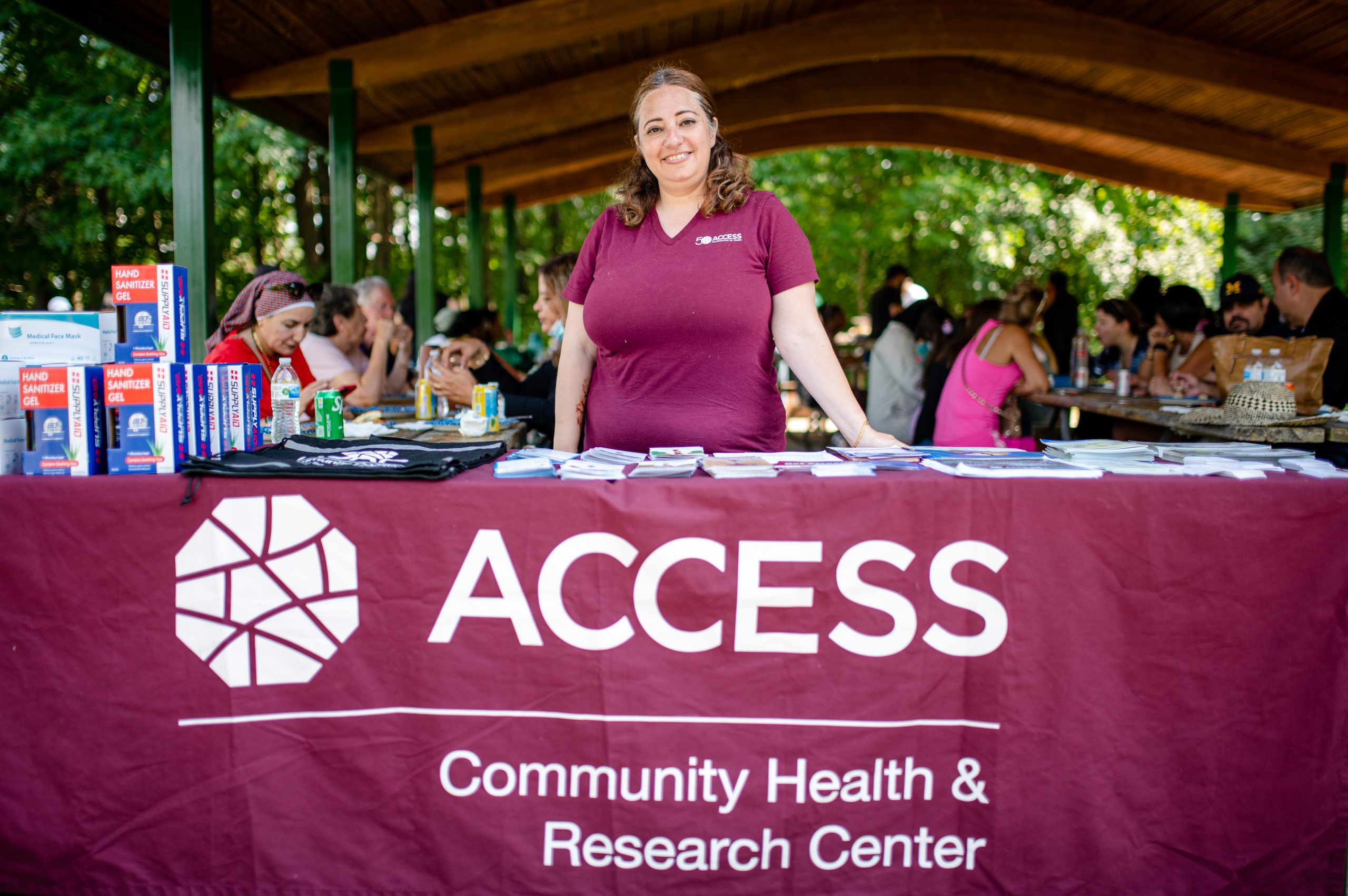 Reem Ahmed, a case worker with ACCESS Healthcare, poses for a photo in front of the table she set up during the Arab American Heritage Council’s annual community picnic at Seven Lakes State Park in Holly, Mich. on Sunday, Aug. 28, 2022. ACCESS Healthcare caters its services toward Arab Americans throughout Mich., connecting people with health insurance and education, according to the organization’s website. (Michael Indriolo | Flint Beat)