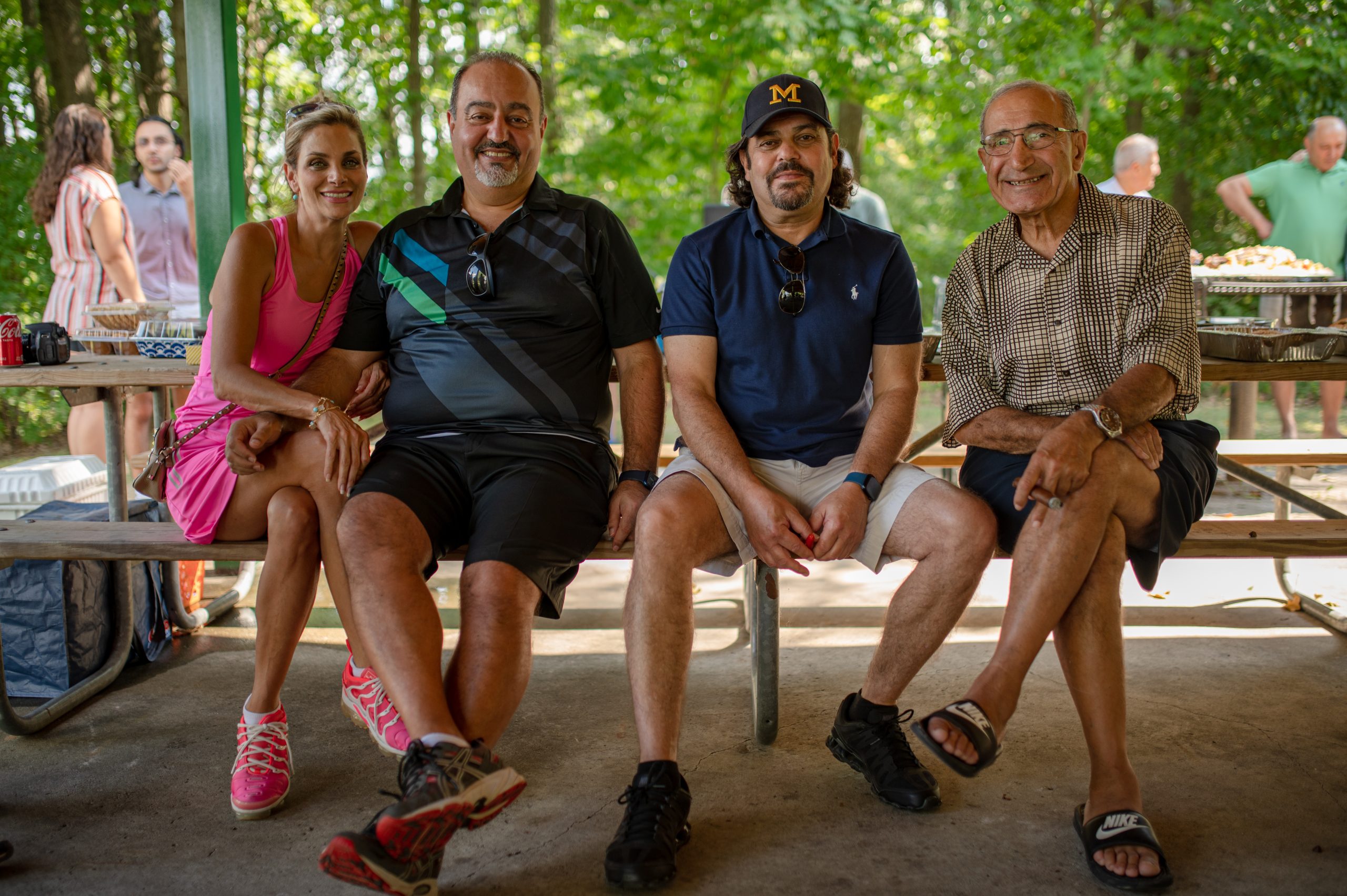 Abir Haidar, Ayman Haidar, Saed Sahouri and Karam Nassar pose for a photo in the Fisherman’s Cove Pavilion during the Arab American Heritage Council’s annual community picnic at Seven Lakes State Park in Holly, Mich. on Sunday, Aug. 28, 2022. (Michael Indriolo | Flint Beat)