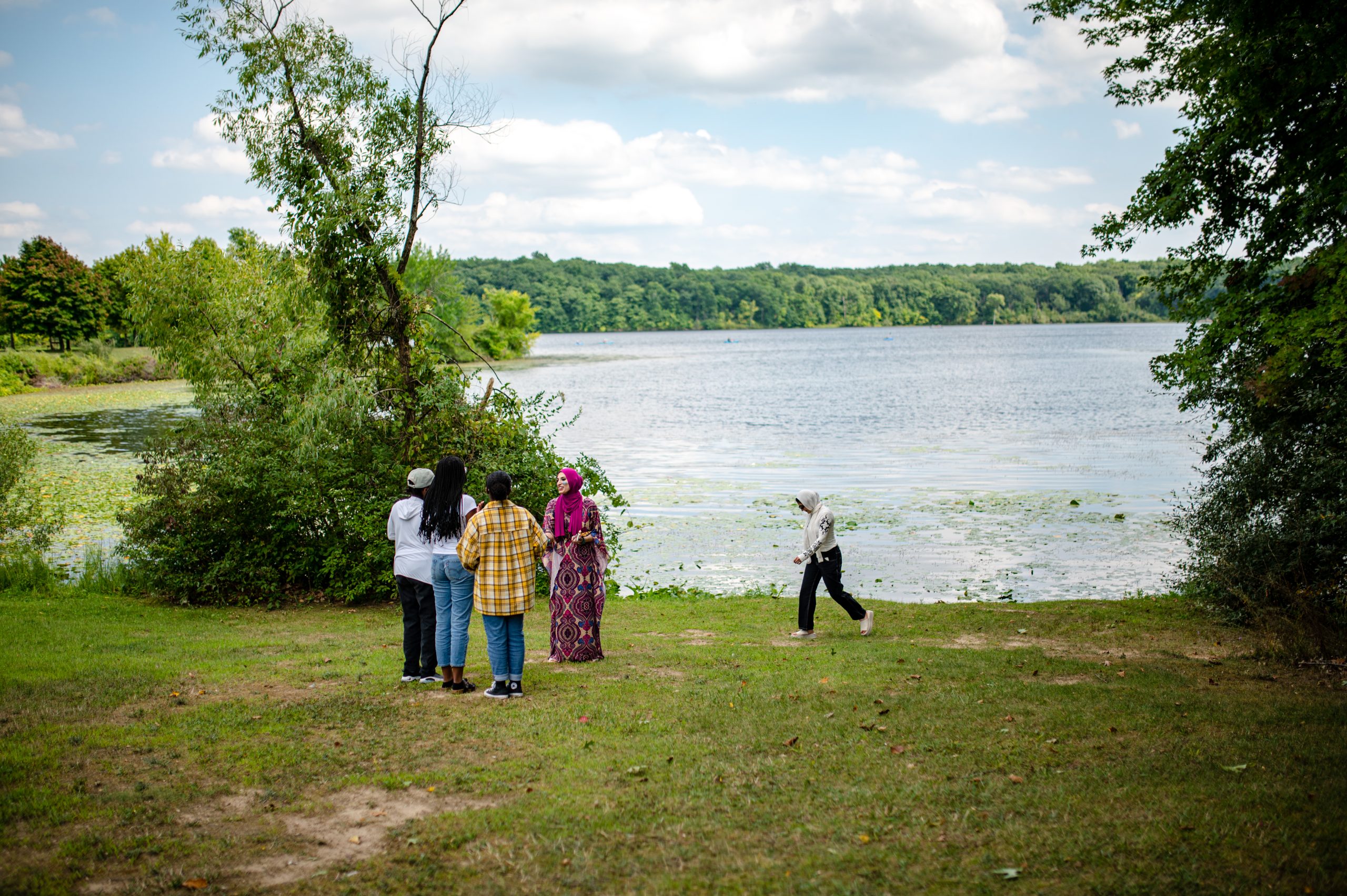 Rayna Ahmed, Zeena Ahmed, Jinan Ahmed, Zhraa Mohammed and Iaman Khrais chat by the lake during the Arab American Heritage Council’s annual community picnic at Seven Lakes State Park in Holly, Mich. on Sunday, Aug. 28, 2022. (Michael Indriolo | Flint Beat)