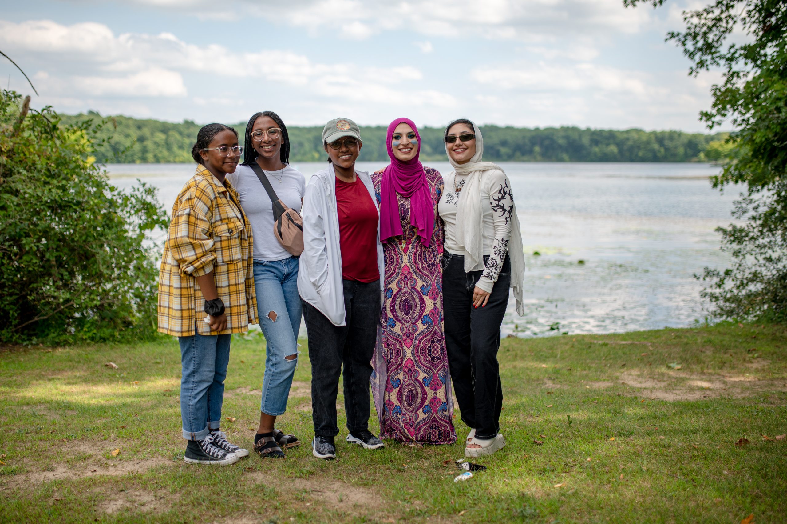Jinan Ahmed, Zeena Ahmed, Rayna Ahmed, Zhraa Mohammed and Iaman Khrais pose for a photo by the lake during the Arab American Heritage Council’s annually community picnic at Seven Lakes State Park in Holly, Mich. on Sunday, Aug. 28, 2022. (Michael Indriolo | Flint Beat)