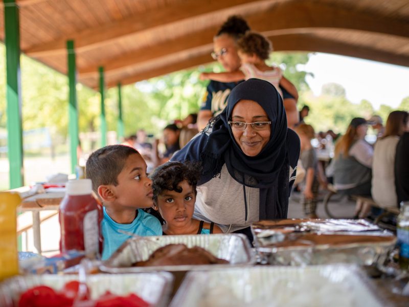 Hiba Saadeldin, Salih Mohammed and Jude Mohammed get plates of food from the spread laid out on a picnic table in the Fisherman’s Cove Pavillion during the Arab American Heritage Council’s annual community picnic at Seven Lakes State Park in Holly, Mich. on Sunday, Aug. 28, 2022. (Michael Indriolo