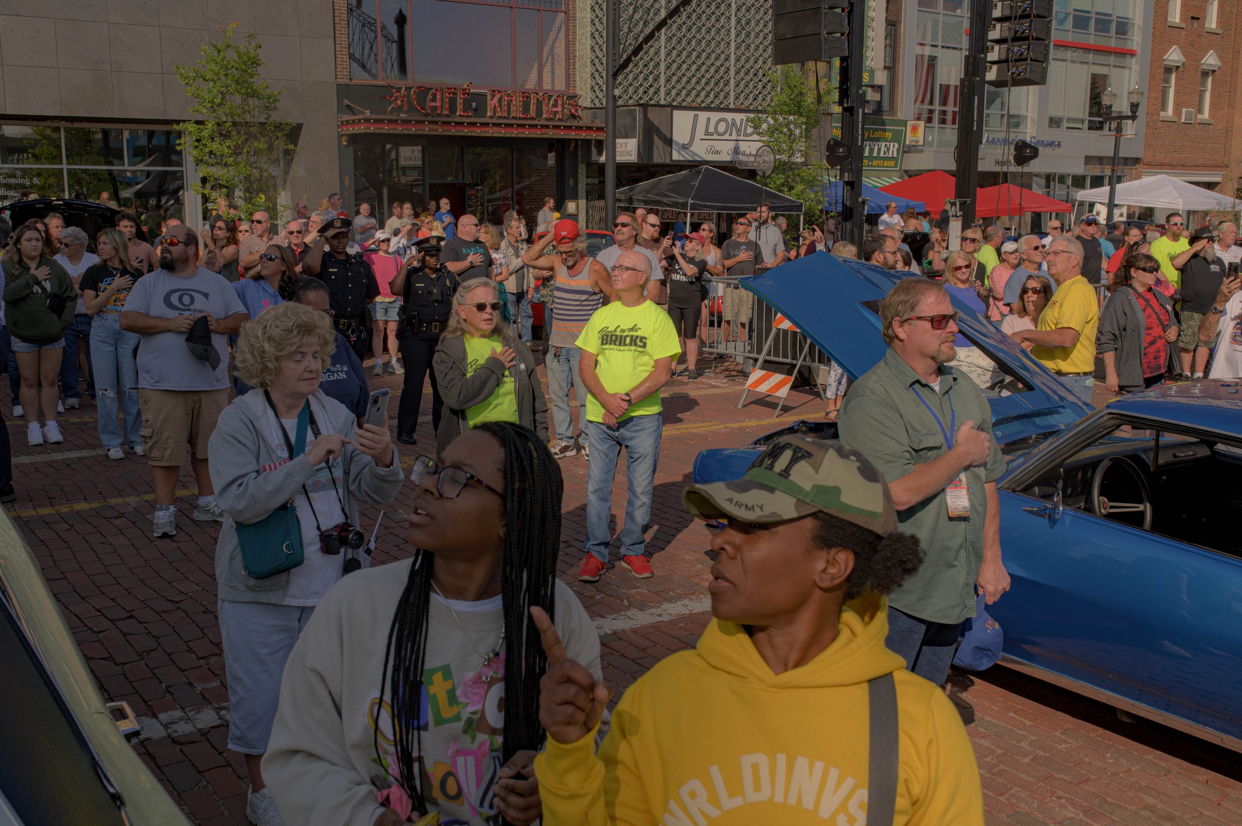The Genesee County Sheriff’s Office Color Guard raise the American flag during the opening ceremony of the 19th annual Back to the Bricks car show in Flint, Mich. on Saturday, Aug. 19, 2023. (Michael Indriolo | Flint Beat)Show-goers walk vintage cars lined up on the bricks of Saginaw Street during the 19th annual Back to the Bricks car show in Flint, Mich. on Saturday, Aug. 19, 2023. (Michael Indriolo | Flint Beat)