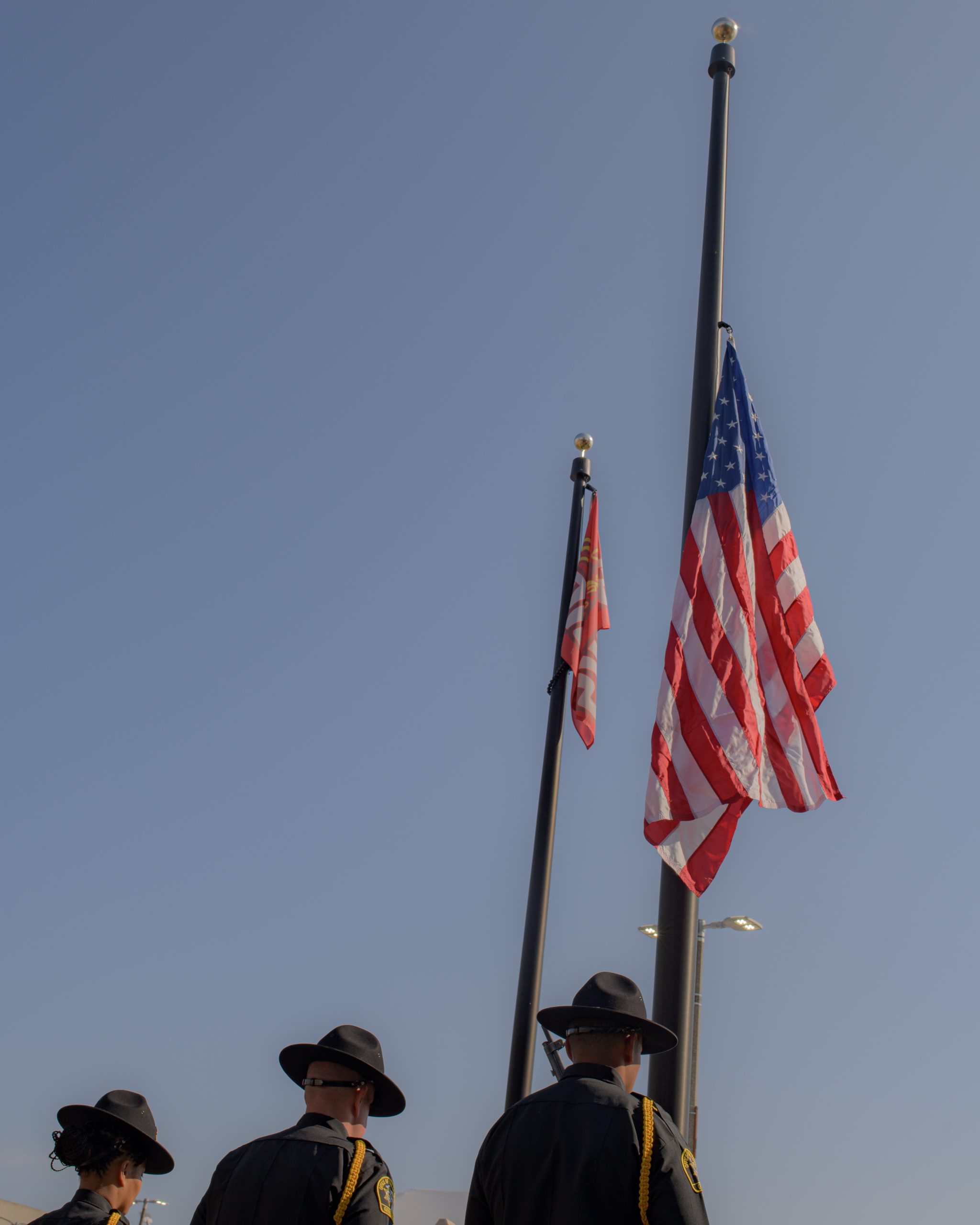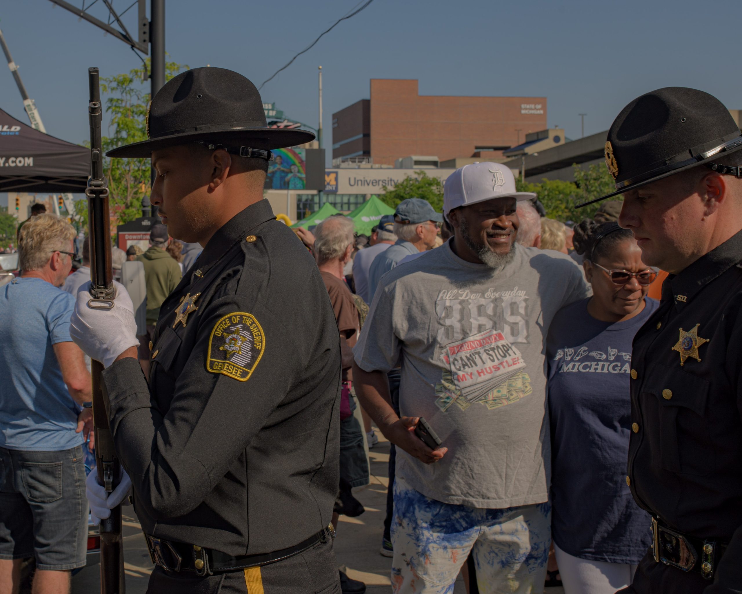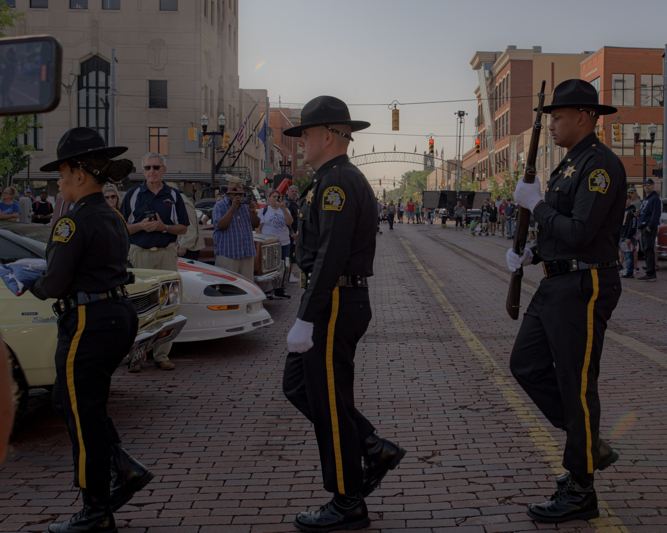 The Genesee County Sheriff’s Office Color Guard walk down Saginaw Street during the opening ceremony of the 19th annual Back to the Bricks car show in Flint, Mich. on Saturday, Aug. 19, 2023. (Michael Indriolo | Flint Beat)