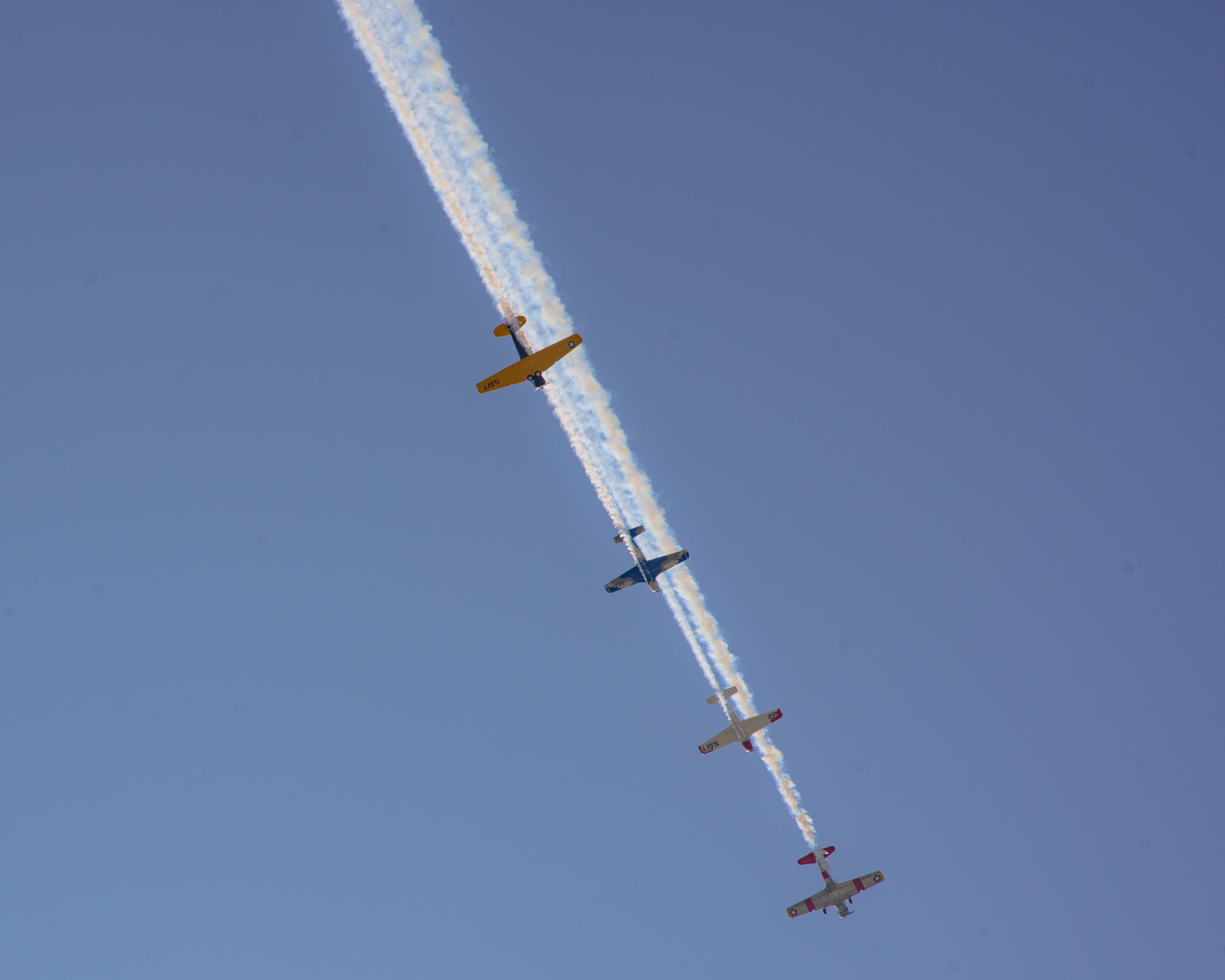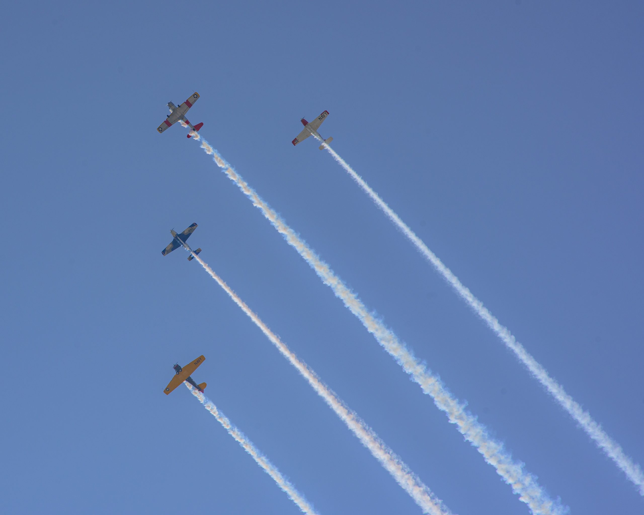 Vintage aircraft fly over Saginaw Street during the opening ceremony of the 19th annual Back to the Bricks car show in Flint, Mich. on Saturday, Aug. 19, 2023. (Michael Indriolo | Flint Beat)