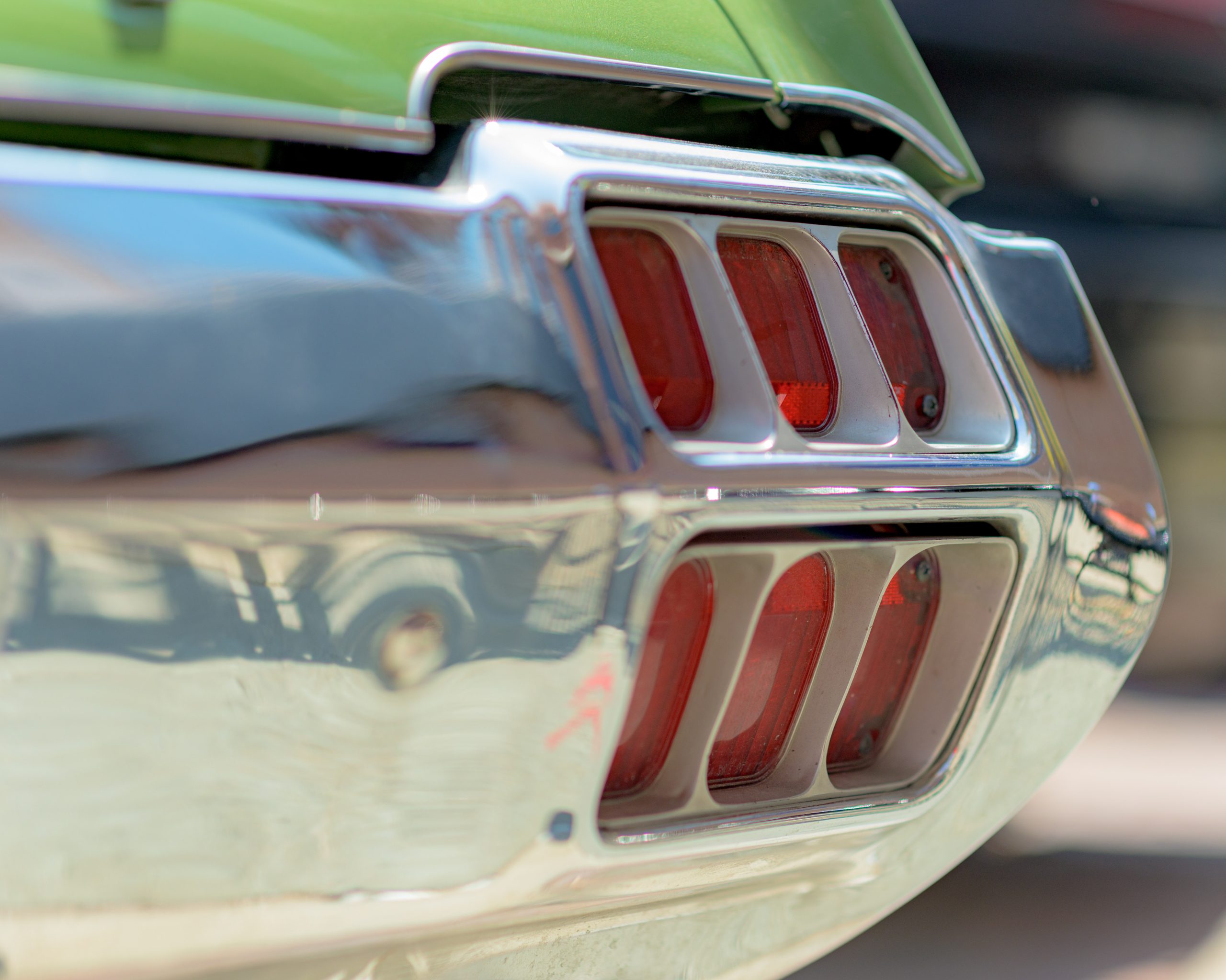The tail light of a vintage Oldsmobile Cutlass shines in the sun during the 19th annual Back to the Bricks car show in Flint, Mich. on Saturday, Aug. 19, 2023. (Michael Indriolo | Flint Beat)