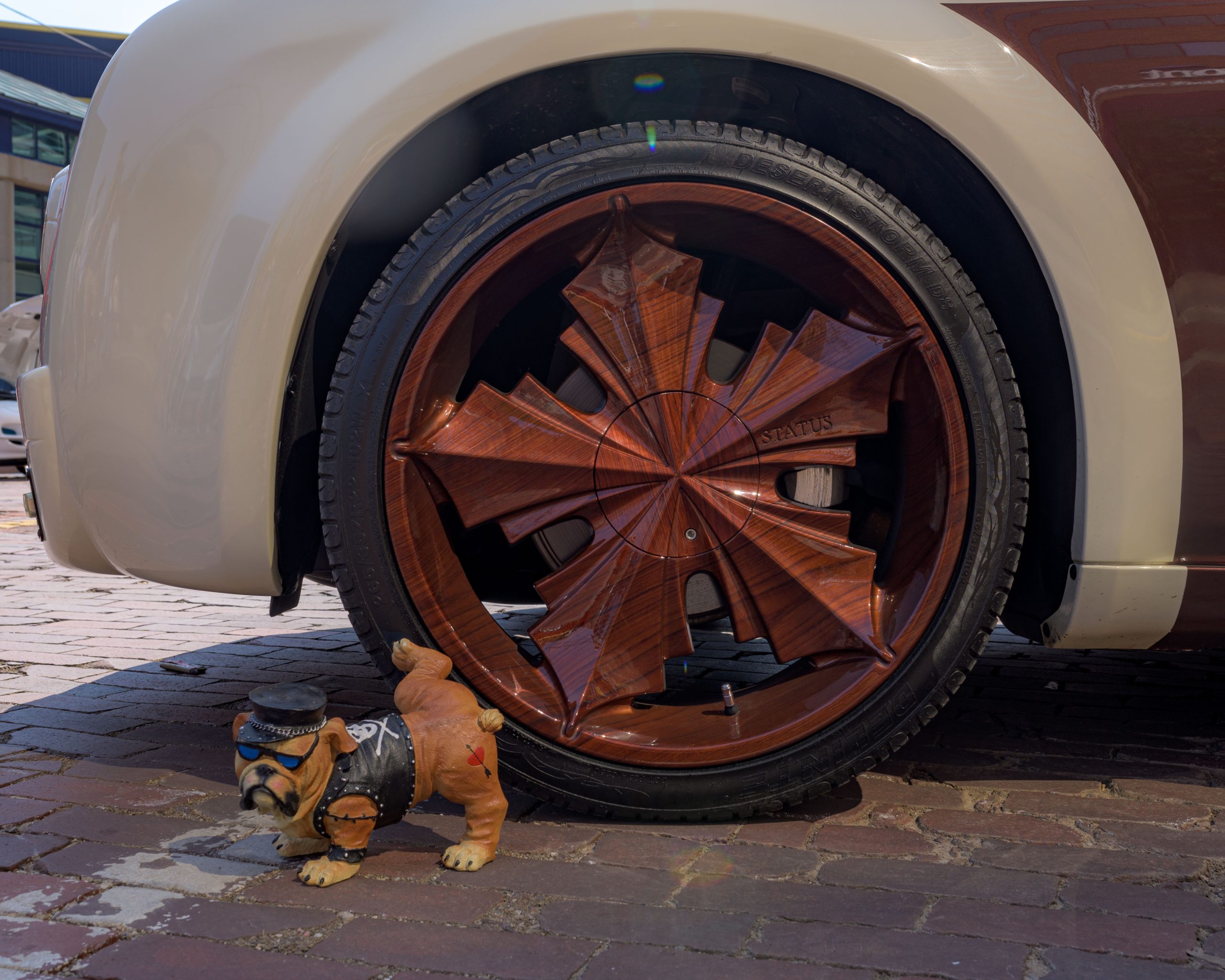 A toy dog sits next to the wheel of a Bentley during the 19th annual Back to the Bricks car show in Flint, Mich. on Saturday, Aug. 19, 2023. (Michael Indriolo | Flint Beat)