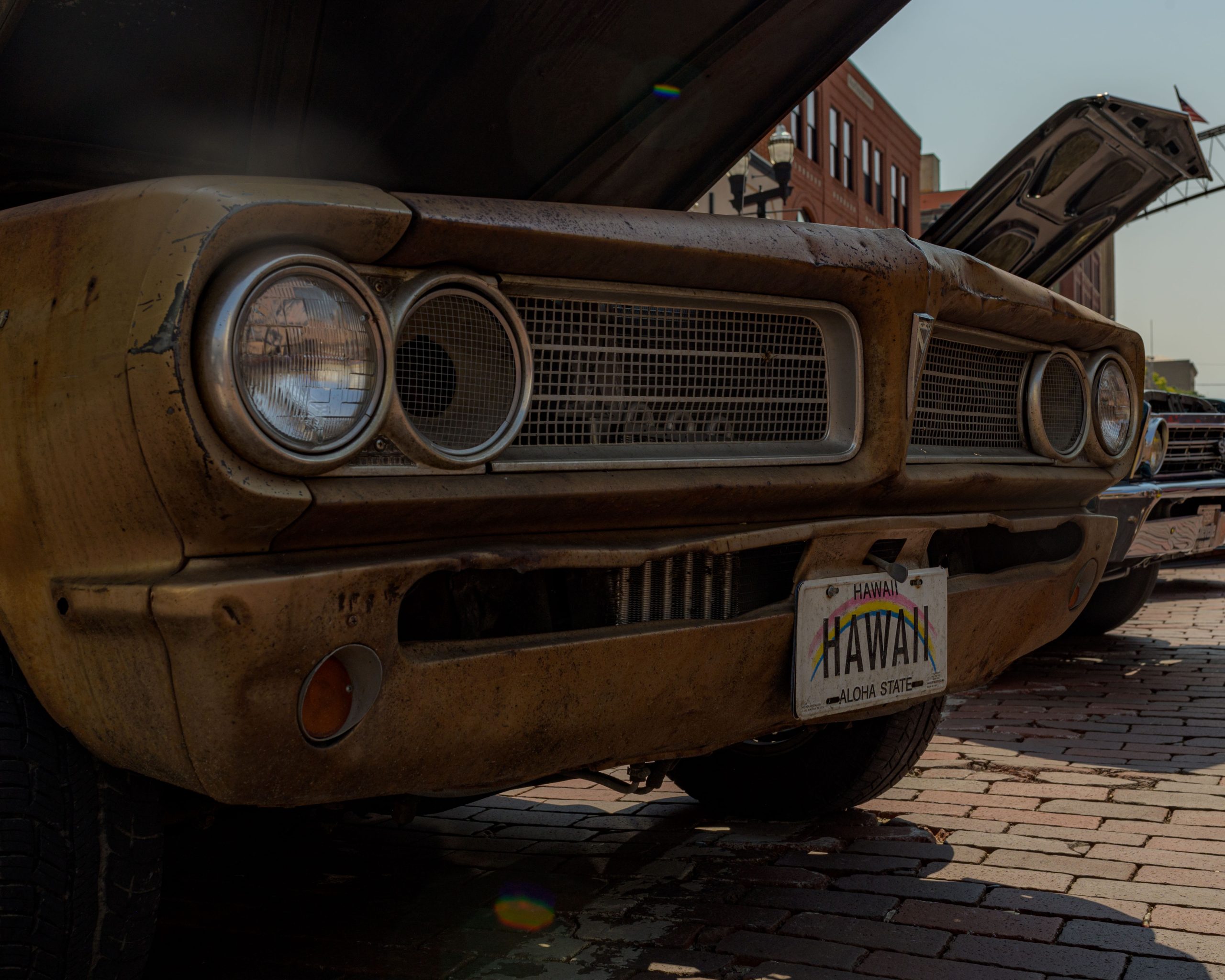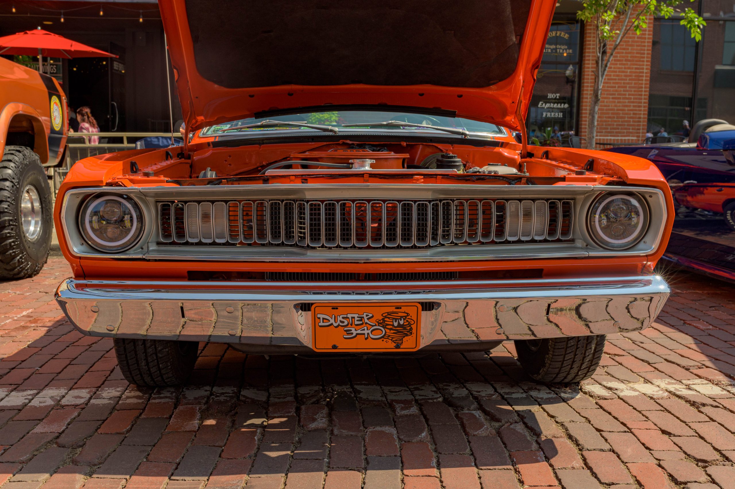 A vintage Plymouth Duster 340 is parked on the bricks of Saginaw Street during the 19th annual Back to the Bricks car show in Flint, Mich. on Saturday, Aug. 19, 2023. (Michael Indriolo | Flint Beat)