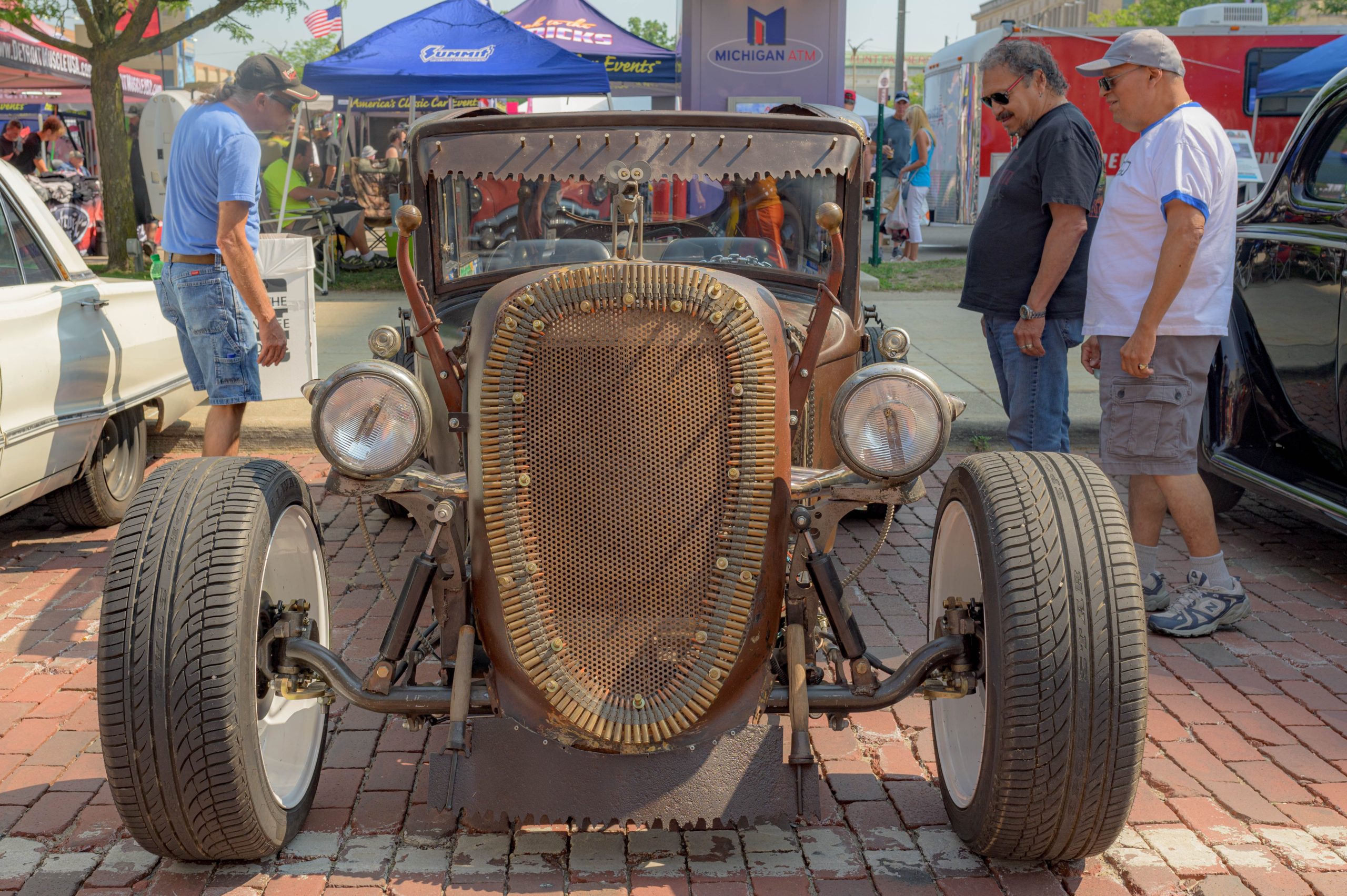 Show-goers stop to look at a rat rod during the 19th annual Back to the Bricks car show in Flint, Mich. on Saturday, Aug. 19, 2023. (Michael Indriolo | Flint Beat)