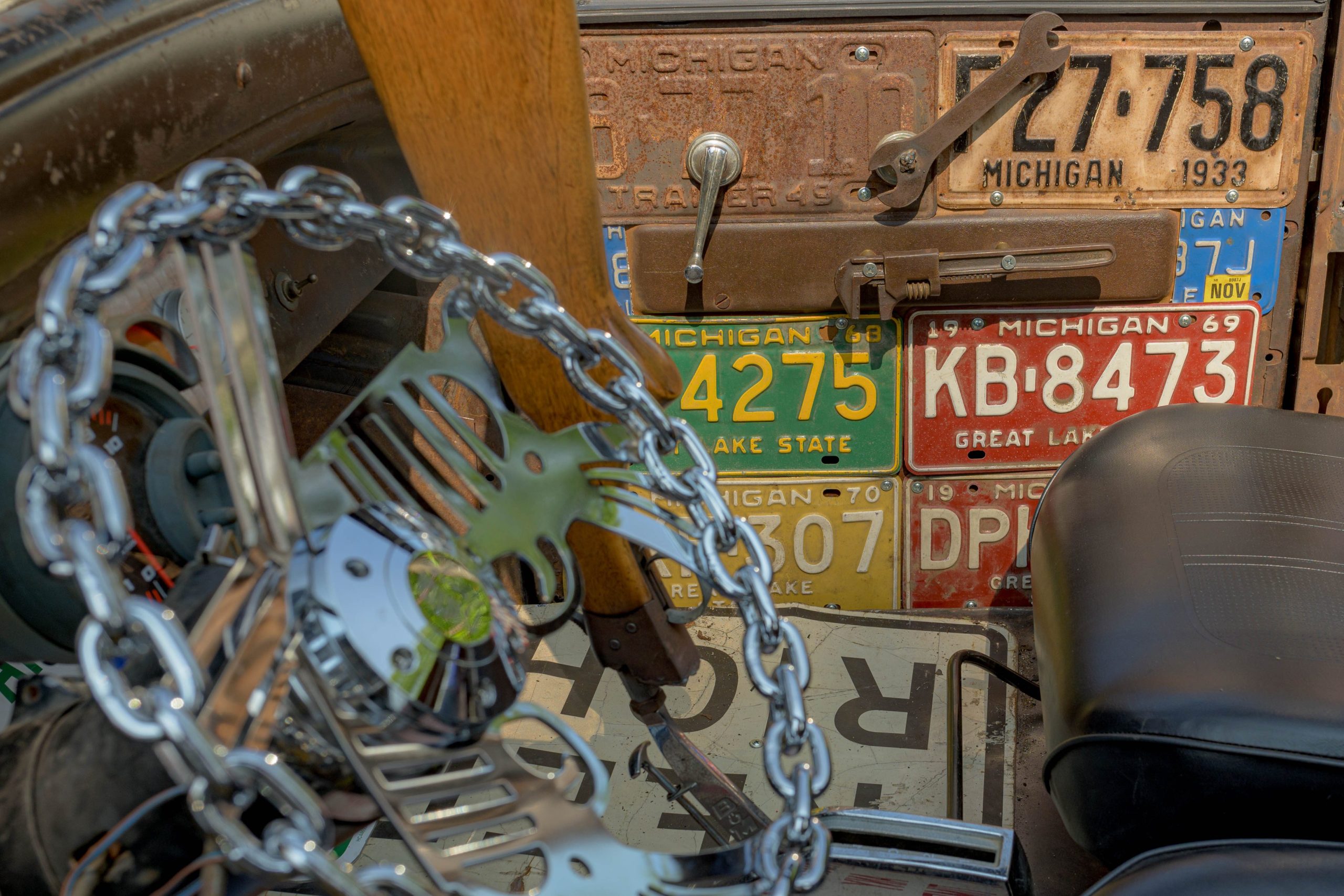 Vintage license plates, street signs and tools line the inside of a rat rod during the 19th annual Back to the Bricks car show in Flint, Mich. on Saturday, Aug. 19, 2023. (Michael Indriolo | Flint Beat)