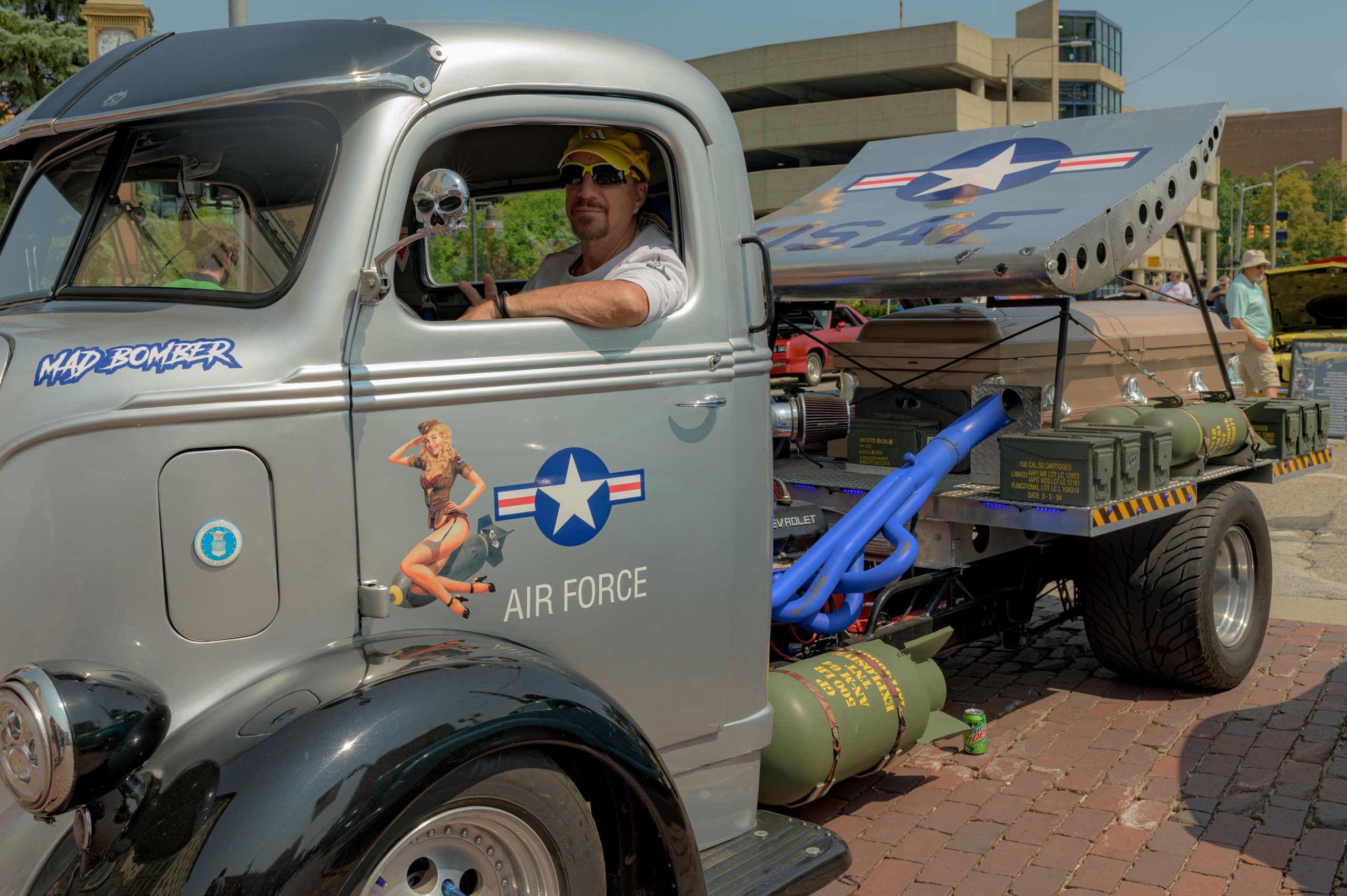 Neil Helmkay poses for a portrait in the “Mad Bomber,” a custom-built truck to honor military veterans, during the 19th annual Back to the Bricks car show in Flint, Mich. on Saturday, Aug. 19, 2023. (Michael Indriolo | Flint Beat)