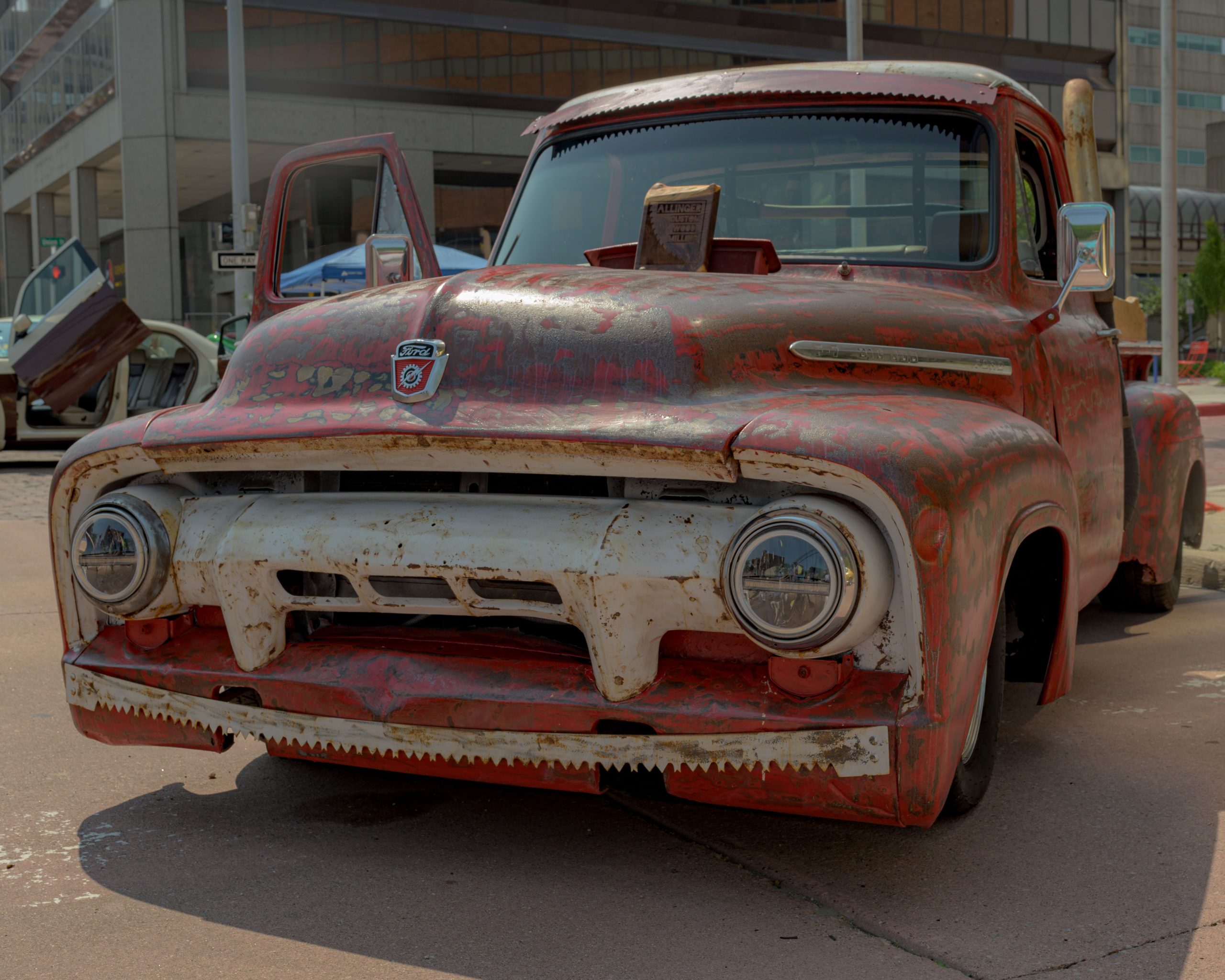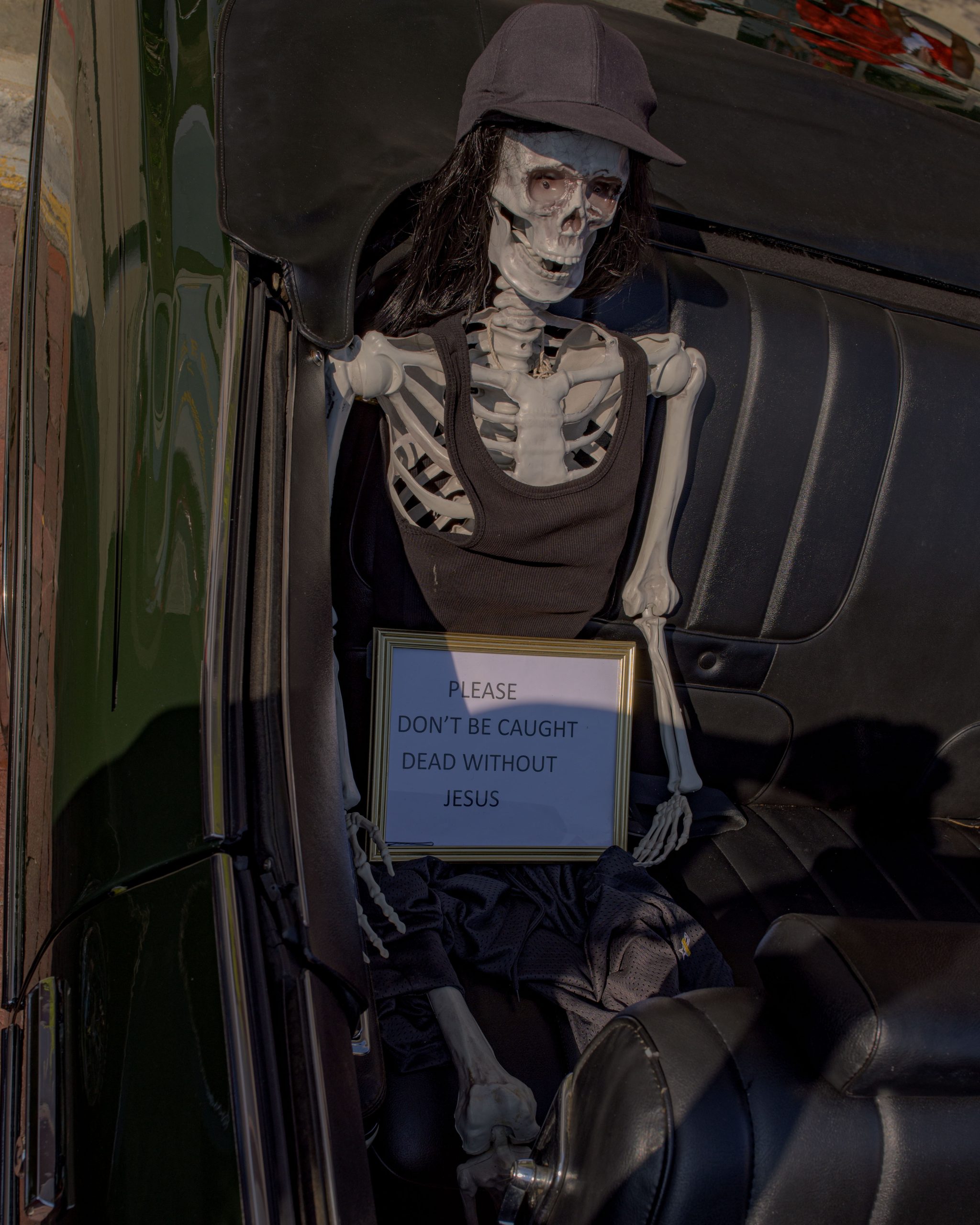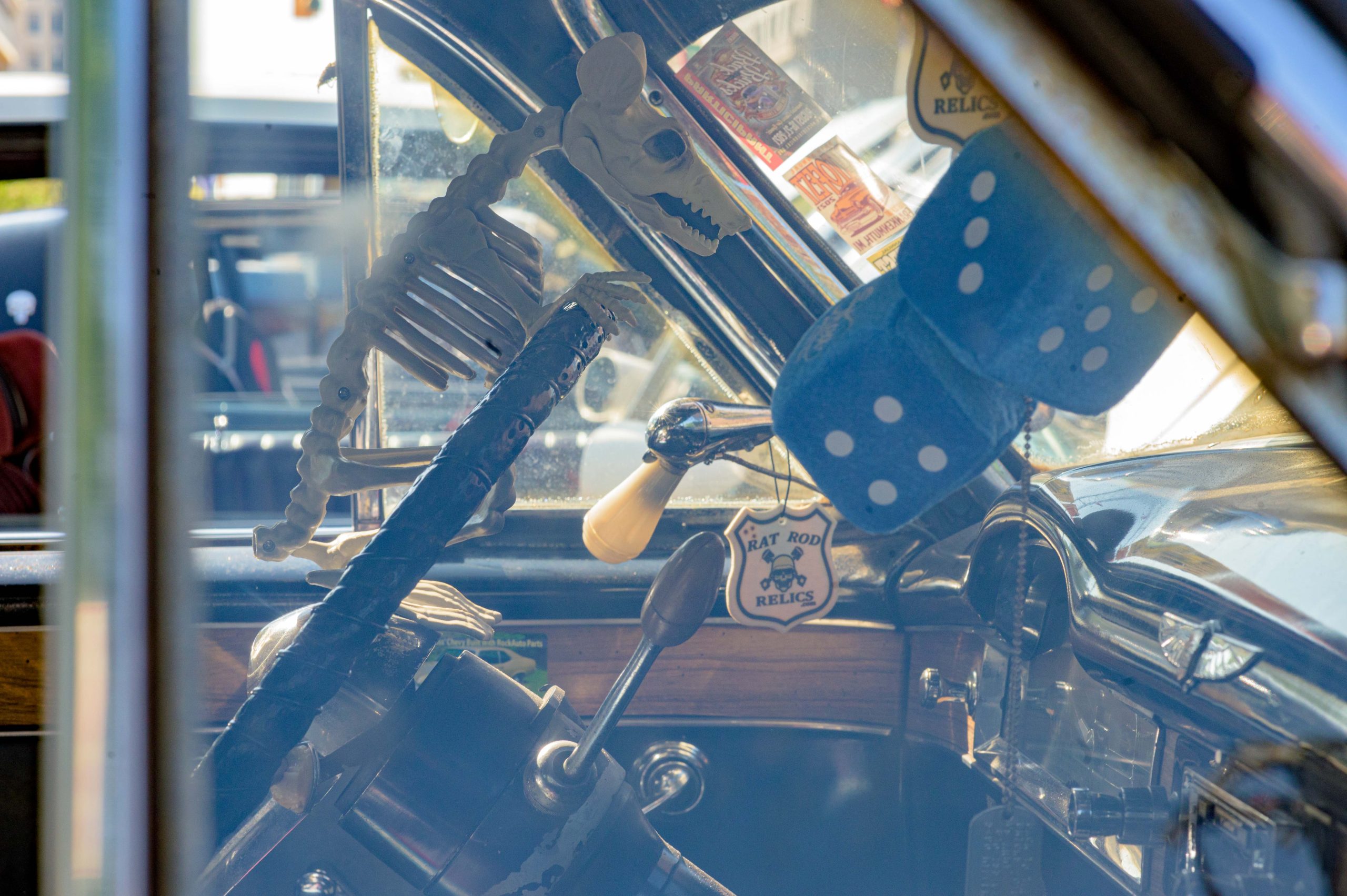 A vintage Ford truck is parked on Saginaw Street during the 19th annual Back to the Bricks car show in Flint, Mich. on Saturday, Aug. 19, 2023. (Michael Indriolo | Flint Beat)A toy skeleton sits in the back seat of a vintage 1971 Pontiac Grandville convertable during the 19th annual Back to the Bricks car show in Flint, Mich. on Saturday, Aug. 19, 2023. (Michael Indriolo | Flint Beat)