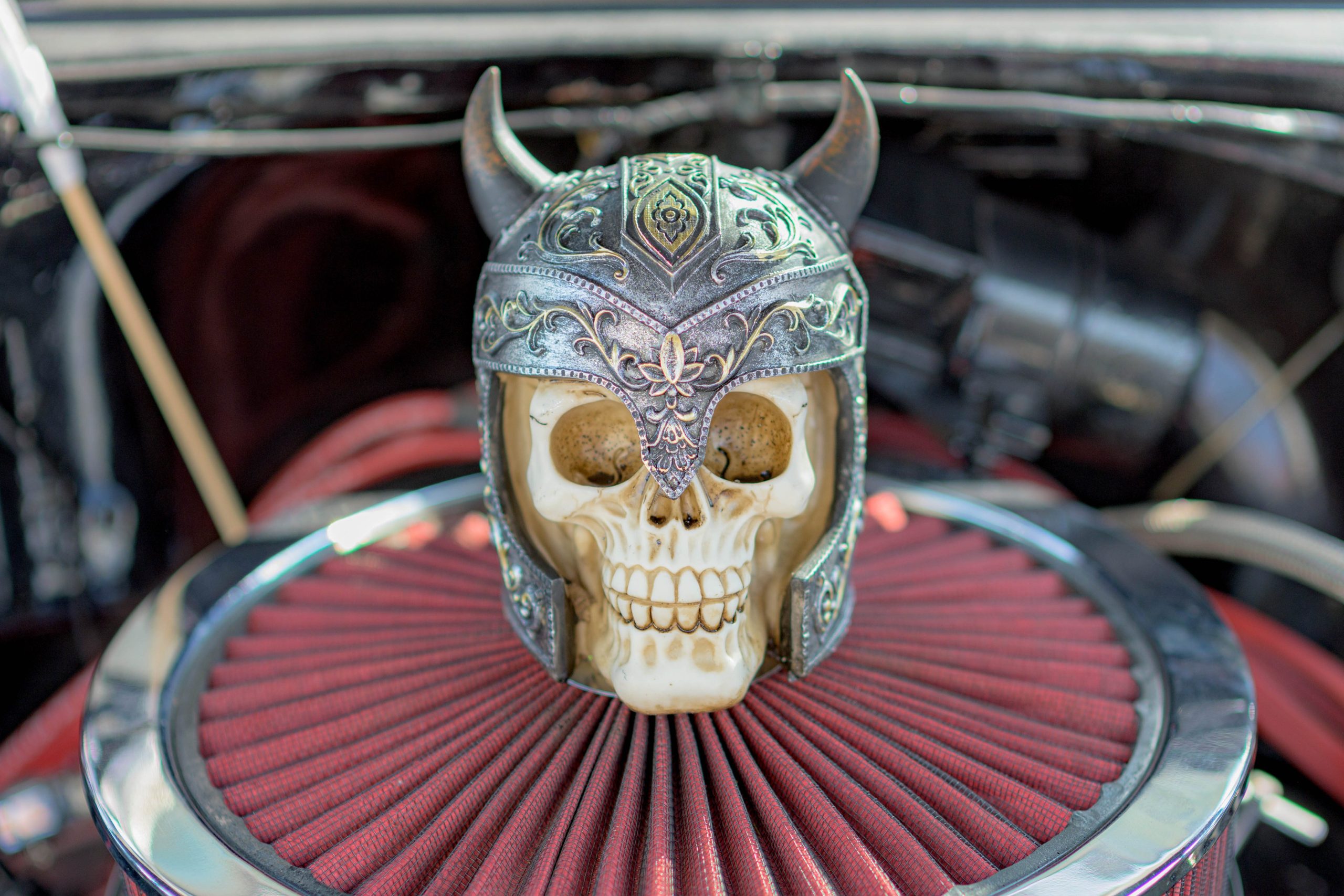 A toy skull wearing a horned helmet rests atop a car’s radiator during the 19th annual Back to the Bricks car show in Flint, Mich. on Saturday, Aug. 19, 2023. (Michael Indriolo | Flint Beat)