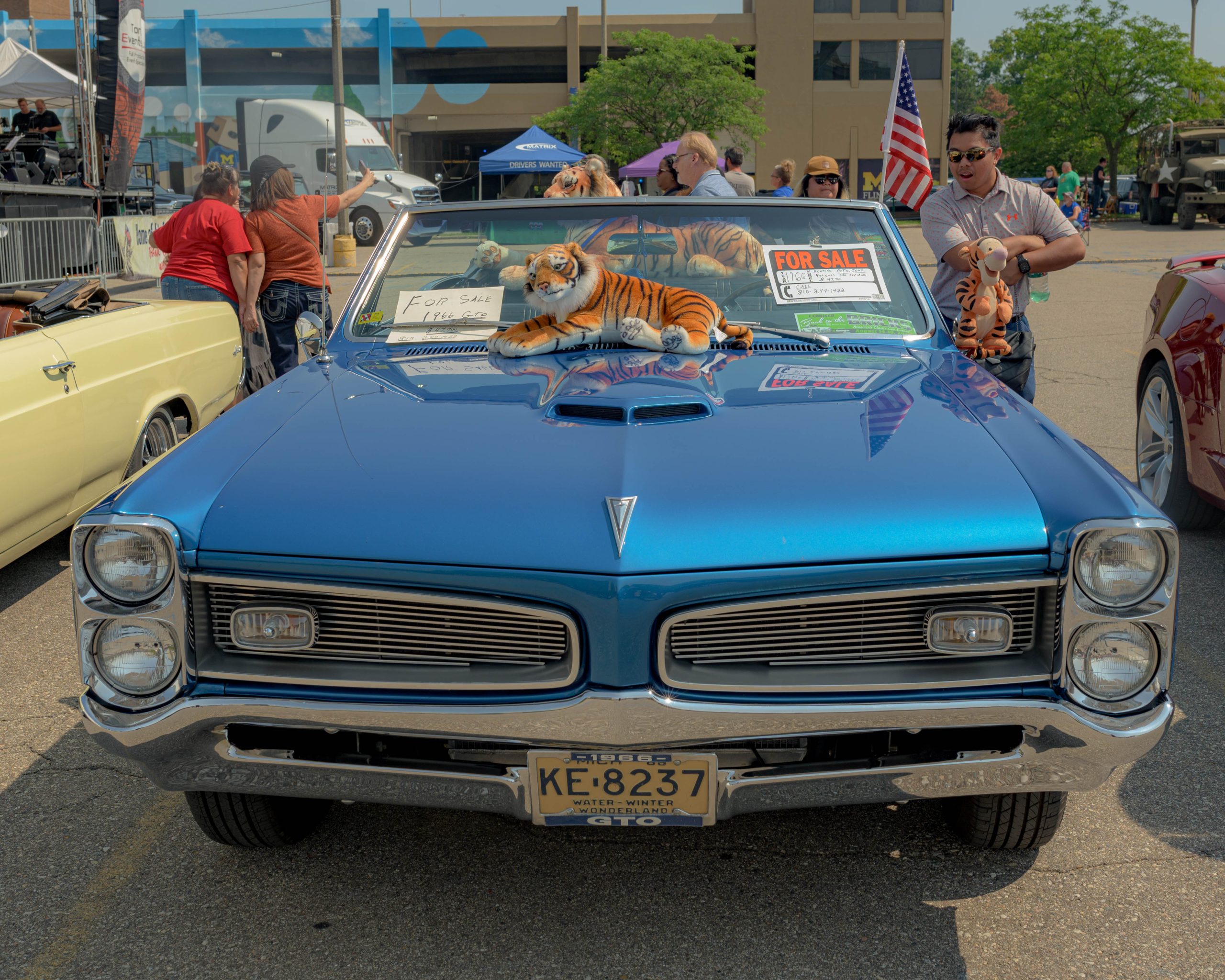 Tiger stuffed animals rest on a vintage Pontiac GTO during the 19th annual Back to the Bricks car show in Flint, Mich. on Saturday, Aug. 19, 2023. (Michael Indriolo | Flint Beat)
