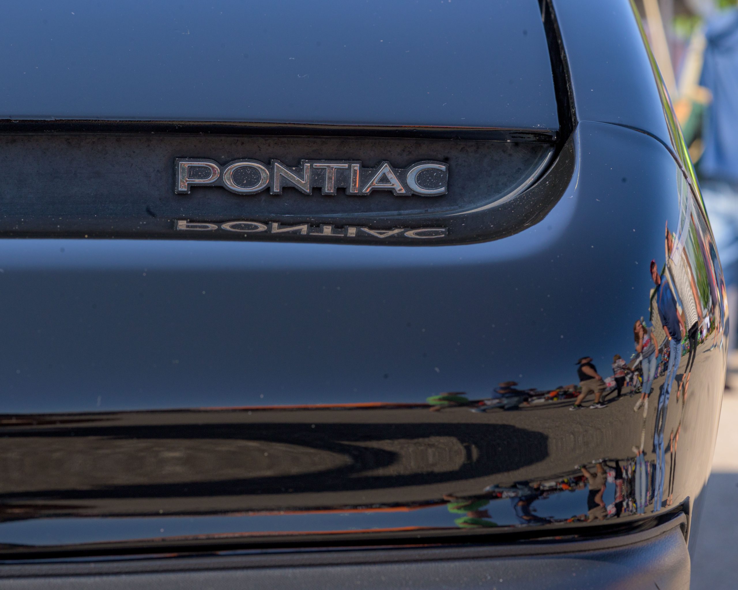Show-goers are reflected in the front bumper of a vintage Pontiac Firebird during the 19th annual Back to the Bricks car show in Flint, Mich. on Saturday, Aug. 19, 2023. (Michael Indriolo | Flint Beat)