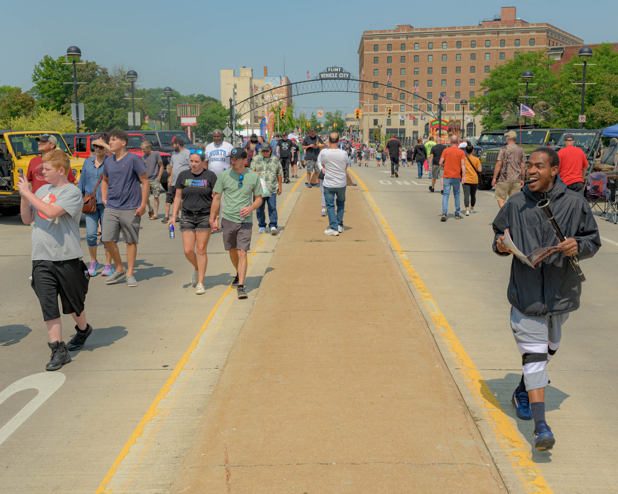 Bernadette Kathryn and the Lonely Days Band performs during the 19th annual Back to the Bricks car show in Flint, Mich. on Saturday, Aug. 19, 2023. (Michael Indriolo | Flint Beat)Show-goers walk down the bricks of Saginaw Street during the 19th annual Back to the Bricks car show in Flint, Mich. on Saturday, Aug. 19, 2023. (Michael Indriolo | Flint Beat)Show-goers walk past Jeeps lined up on the Saginaw Street bridge over the Flint River during the 19th annual Back to the Bricks car show in Flint, Mich. on Saturday, Aug. 19, 2023. (Michael Indriolo | Flint Beat)