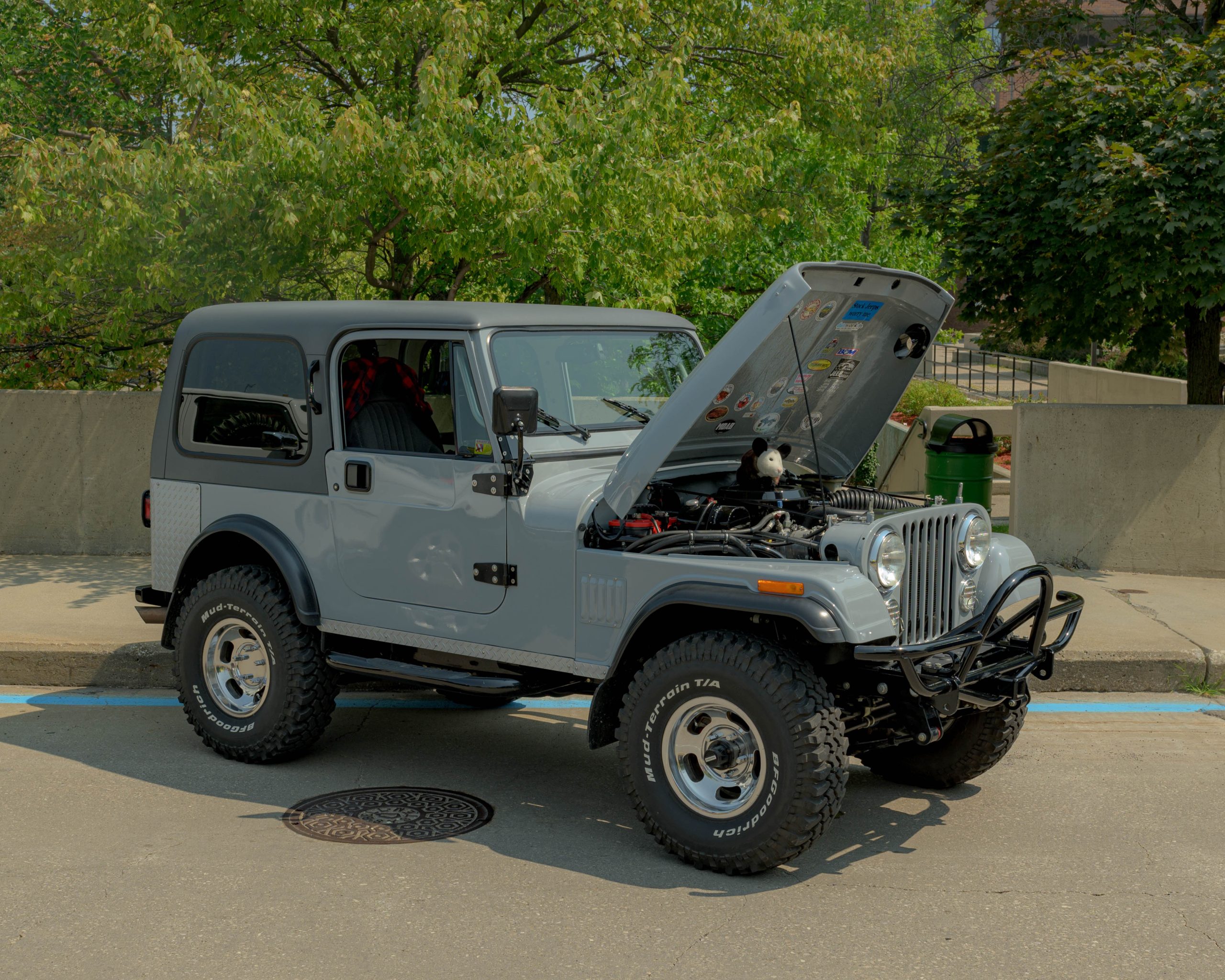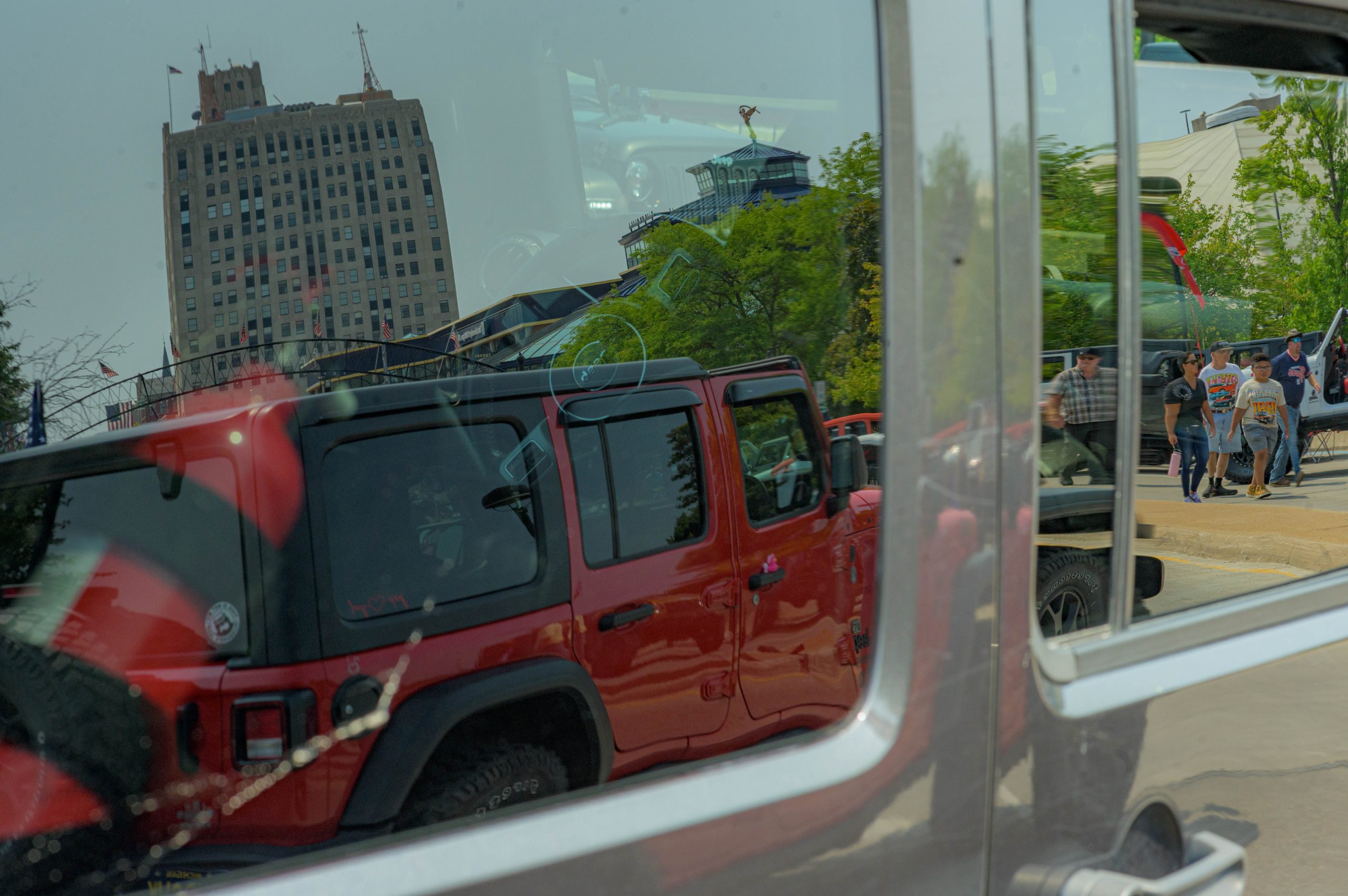Jeep owners line their vehicles up on the Saginaw Street bridge over the Flint River during the 19th annual Back to the Bricks car show in Flint, Mich. on Saturday, Aug. 19, 2023. (Michael Indriolo | Flint Beat)