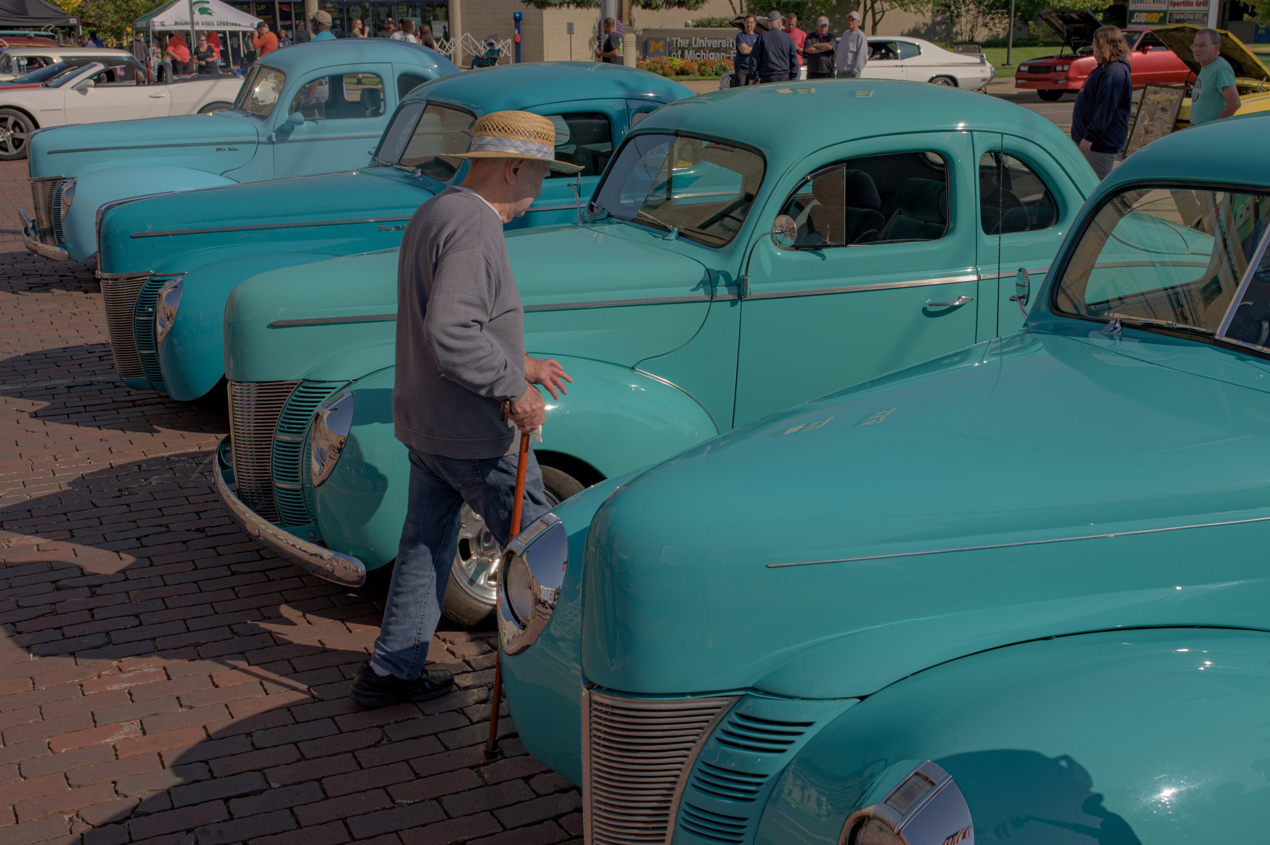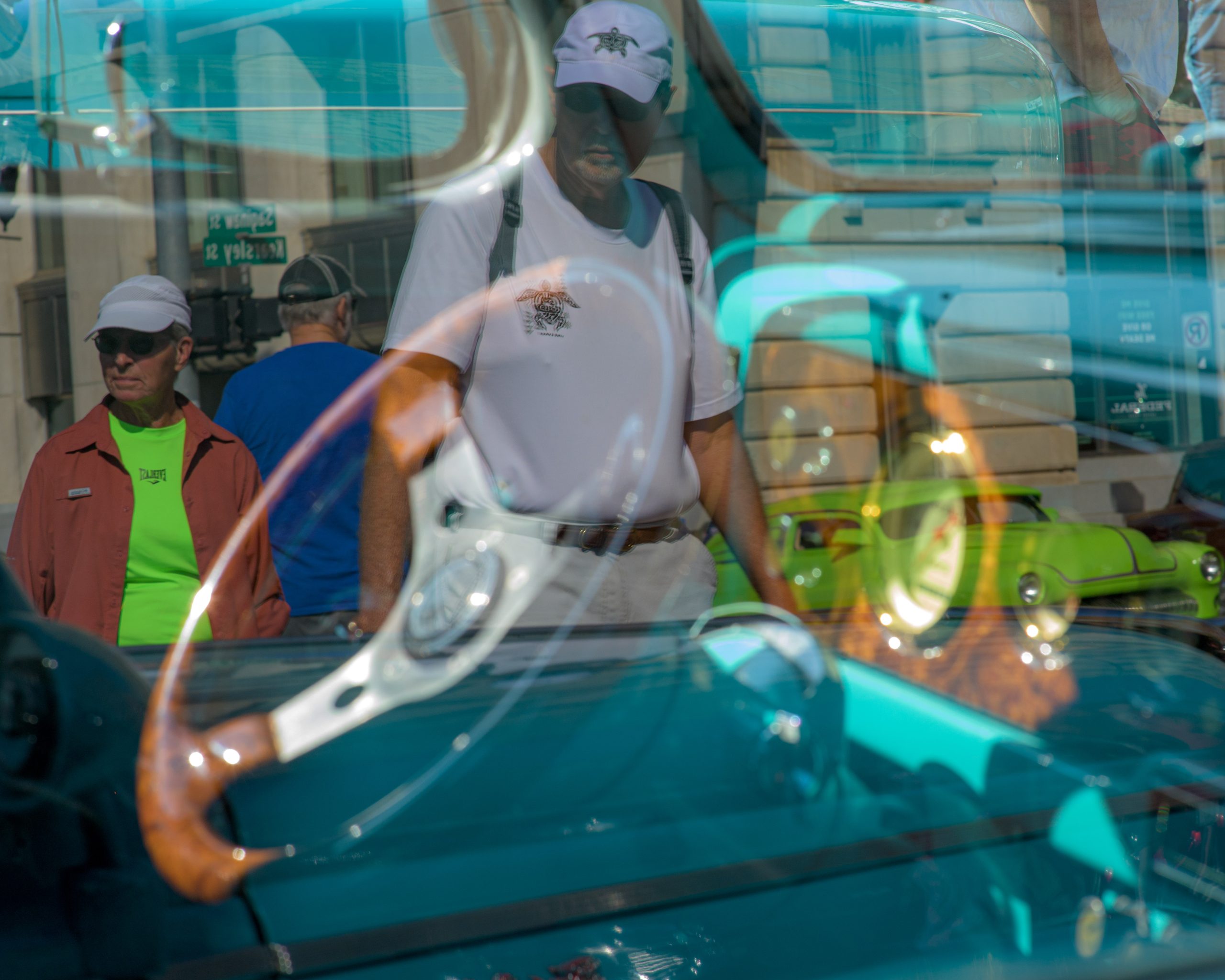 Show-goers walk past Jeeps lined up on the Saginaw Street bridge over the Flint River during the 19th annual Back to the Bricks car show in Flint, Mich. on Saturday, Aug. 19, 2023. (Michael Indriolo | Flint Beat)Show-goers walk past a line of vintage Ford Deluxes during the 19th annual Back to the Bricks car show in Flint, Mich. on Saturday, Aug. 19, 2023. (Michael Indriolo | Flint Beat)