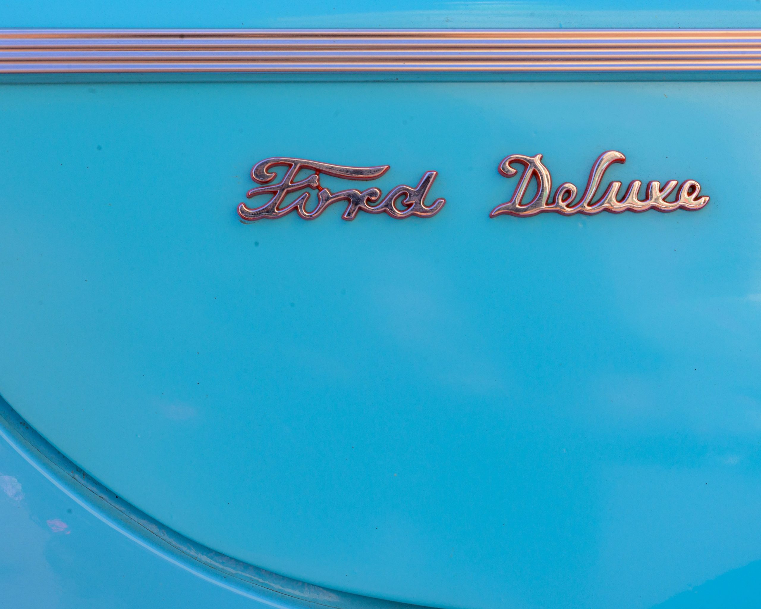 A vintage Ford Deluxe badge shines in the sun during the 19th annual Back to the Bricks car show in Flint, Mich. on Saturday, Aug. 19, 2023. (Michael Indriolo | Flint Beat)