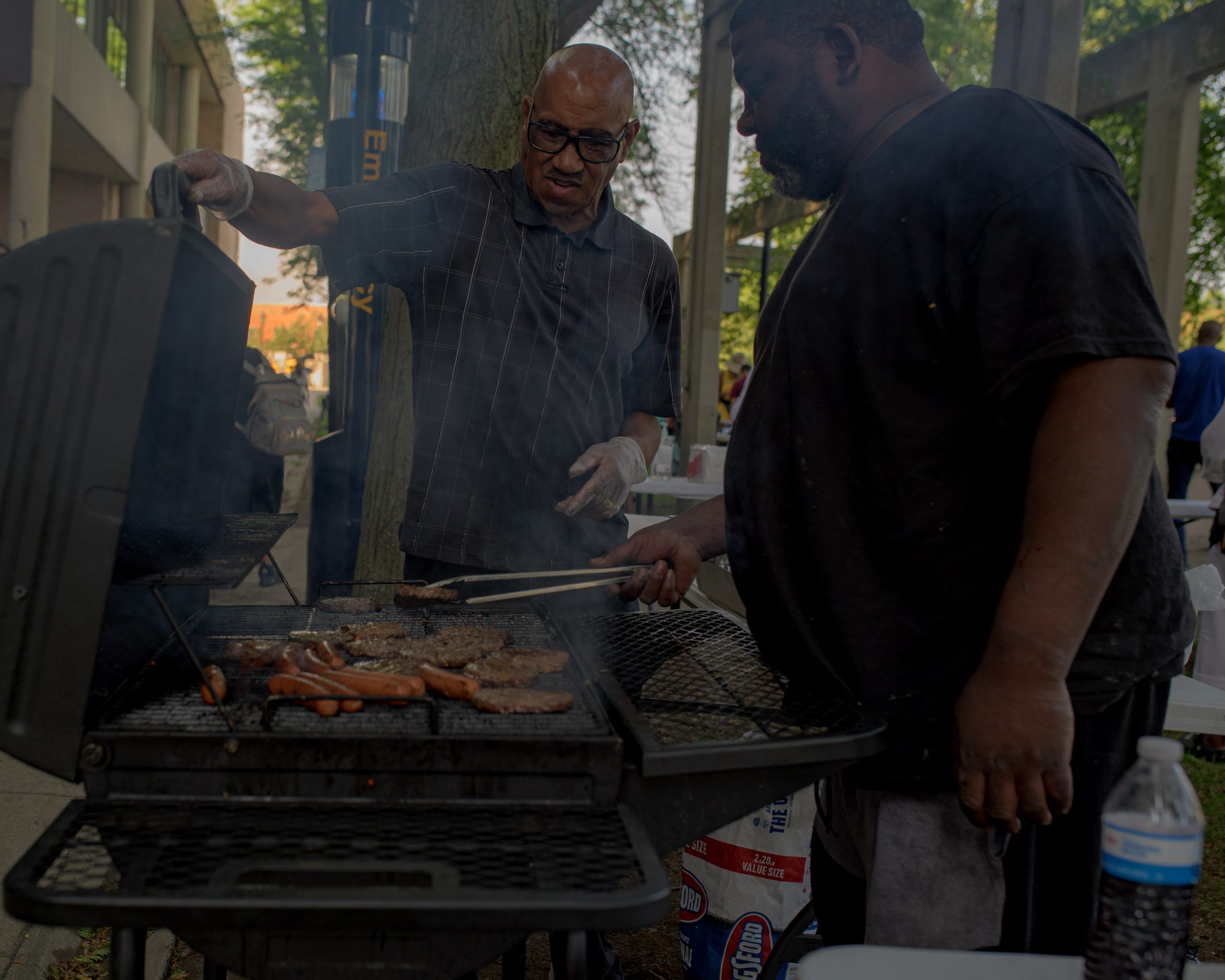 Vintage Ford Deluxes line up on the bricks of Saginaw Street during the 19th annual Back to the Bricks car show in Flint, Mich. on Saturday, Aug. 19, 2023. (Michael Indriolo | Flint Beat)McKinley Tipton and Swahetti Lewis, members of the Saints of God church, grill burgers and hot dogs during the 19th annual Back to the Bricks car show in Flint, Mich. on Saturday, Aug. 19, 2023. (Michael Indriolo | Flint Beat)Vintage Buicks line the bricks of Water Street outside the historic Durant-Dort Factory One during the 19th annual Back to the Bricks car show in Flint, Mich. on Saturday, Aug. 19, 2023. (Michael Indriolo | Flint Beat)