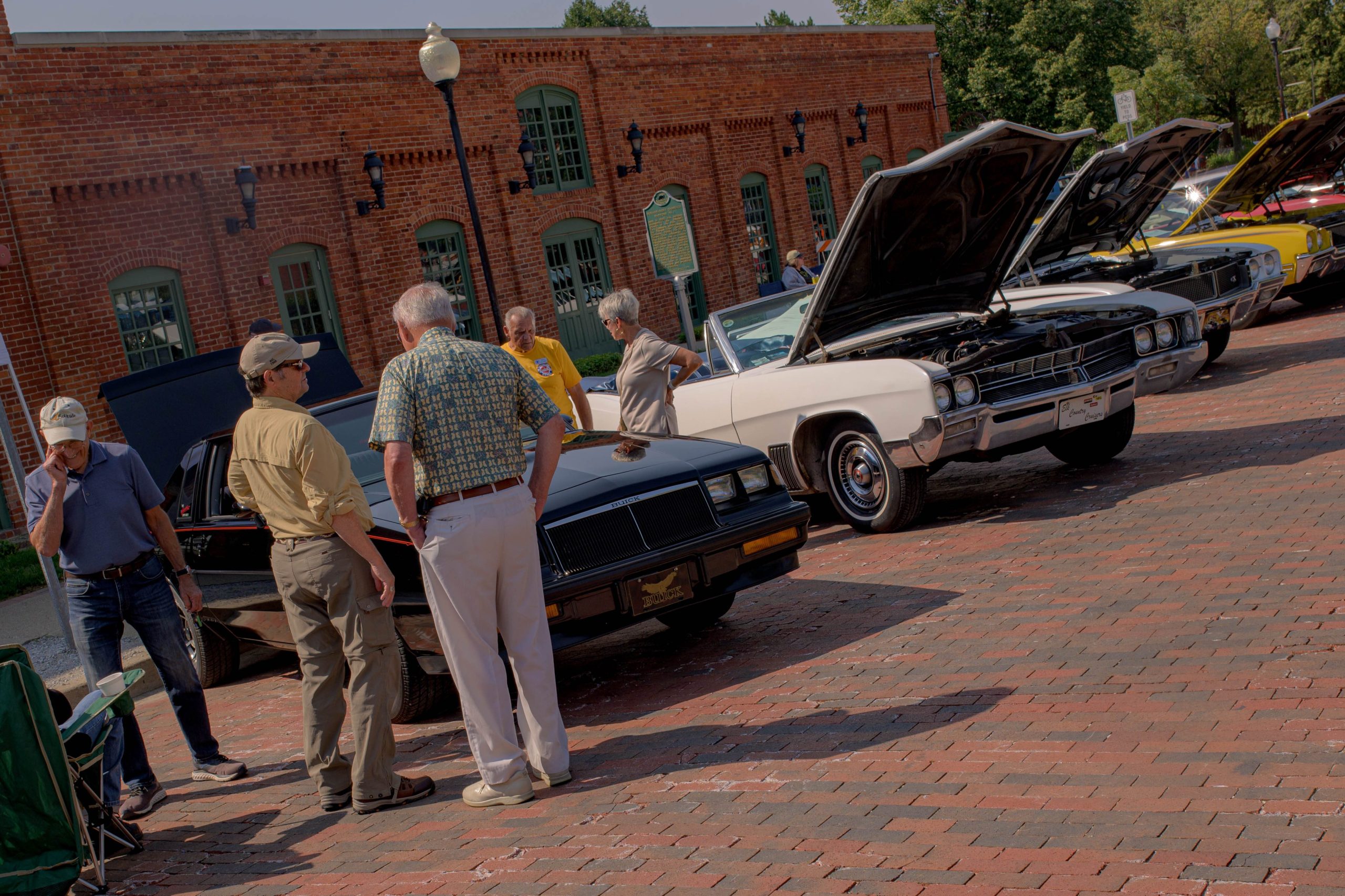Vintage Buicks line the bricks of Water Street outside the historic Durant-Dort Factory One during the 19th annual Back to the Bricks car show in Flint, Mich. on Saturday, Aug. 19, 2023. (Michael Indriolo | Flint Beat)