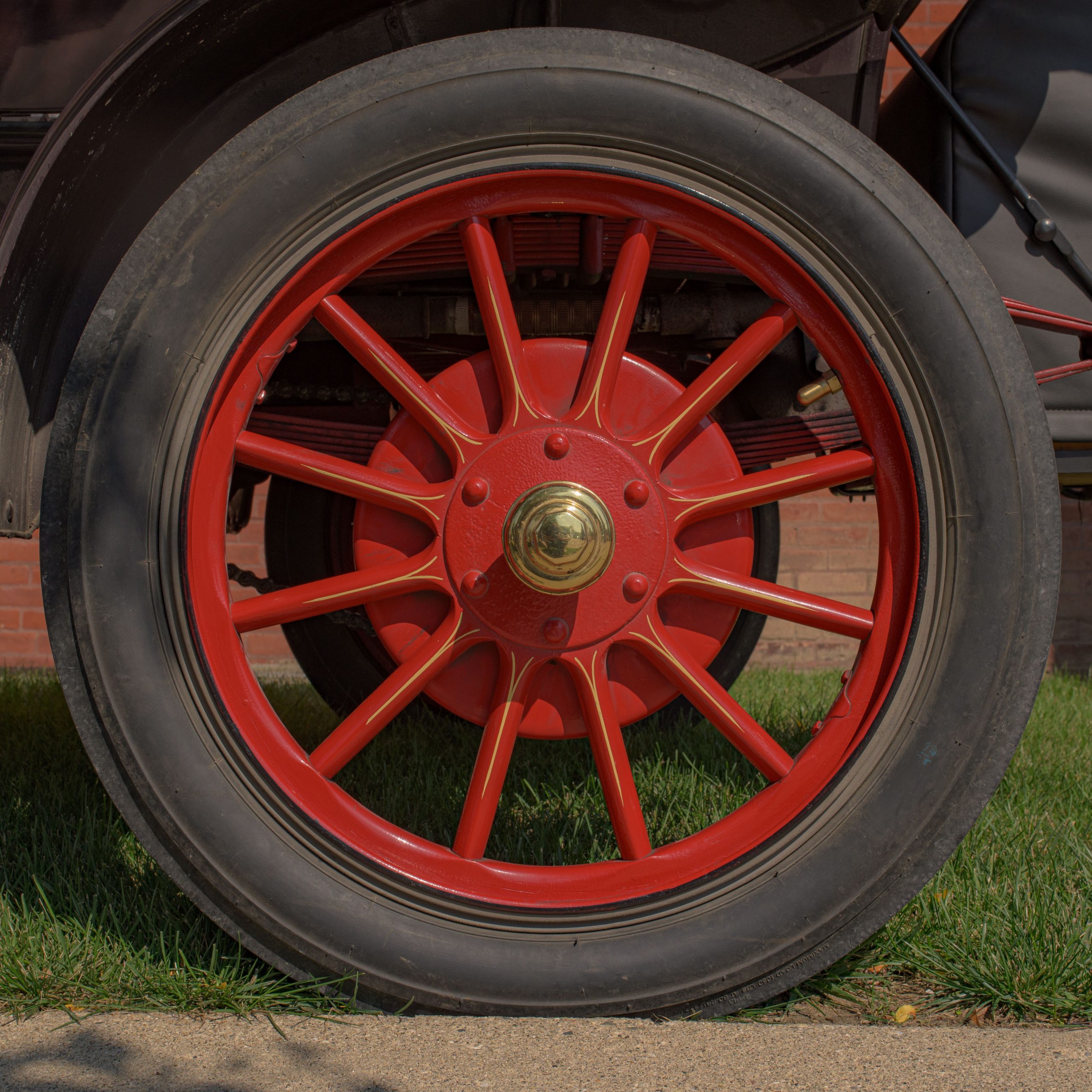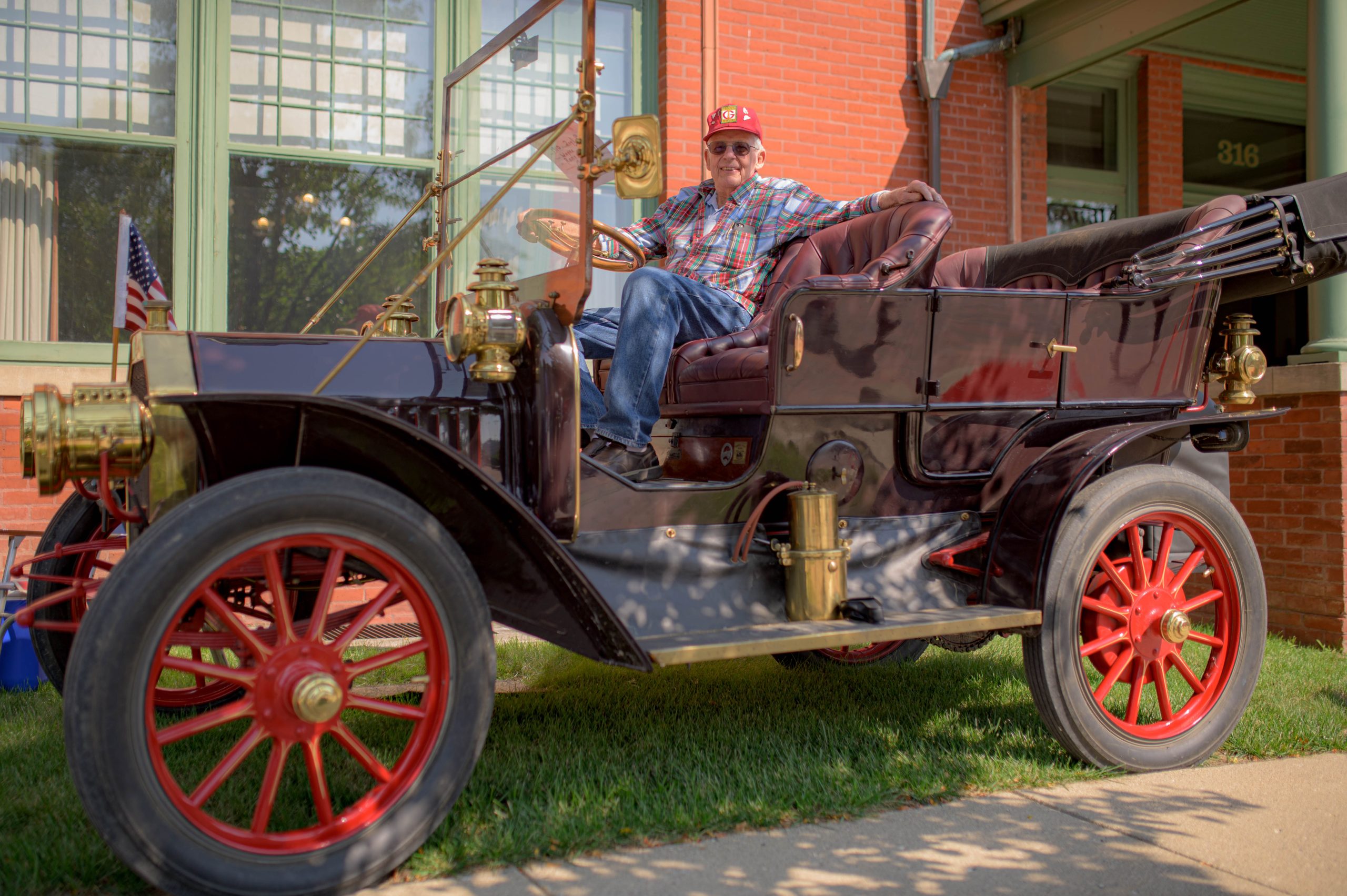 A vintage Buick steering wheel shines in the sun at the historic Durant-Dort Factory One during the 19th annual Back to the Bricks car show in Flint, Mich. on Saturday, Aug. 19, 2023. (Michael Indriolo | Flint Beat)The painted wheels of Wayne Funk’s 1910 2-cylinder Buick shine in the sun near the historic Durant-Dort Factory One during the 19th annual Back to the Bricks car show in Flint, Mich. on Saturday, Aug. 19, 2023. (Michael Indriolo | Flint Beat)Wayne Funk poses for a portrait in his 1910 2-cylinder Buick near the historic Durant-Dort Factory One during the 19th annual Back to the Bricks car show in Flint, Mich. on Saturday, Aug. 19, 2023. (Michael Indriolo | Flint Beat)