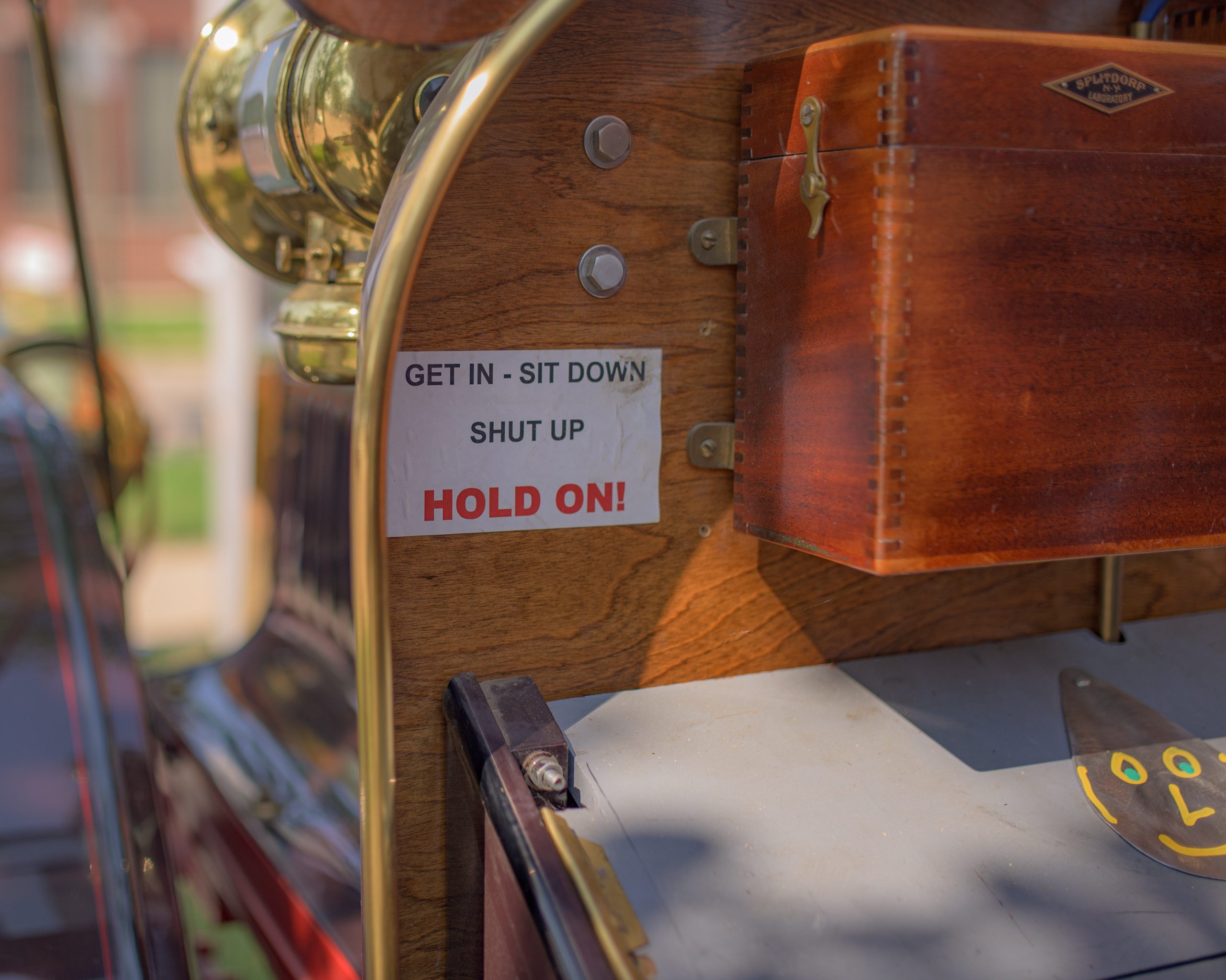 Wayne Funk decorated the inside of his 1910 2-cylinder Buick with a sticker near the historic Durant-Dort Factory One during the 19th annual Back to the Bricks car show in Flint, Mich. on Saturday, Aug. 19, 2023. (Michael Indriolo | Flint Beat)