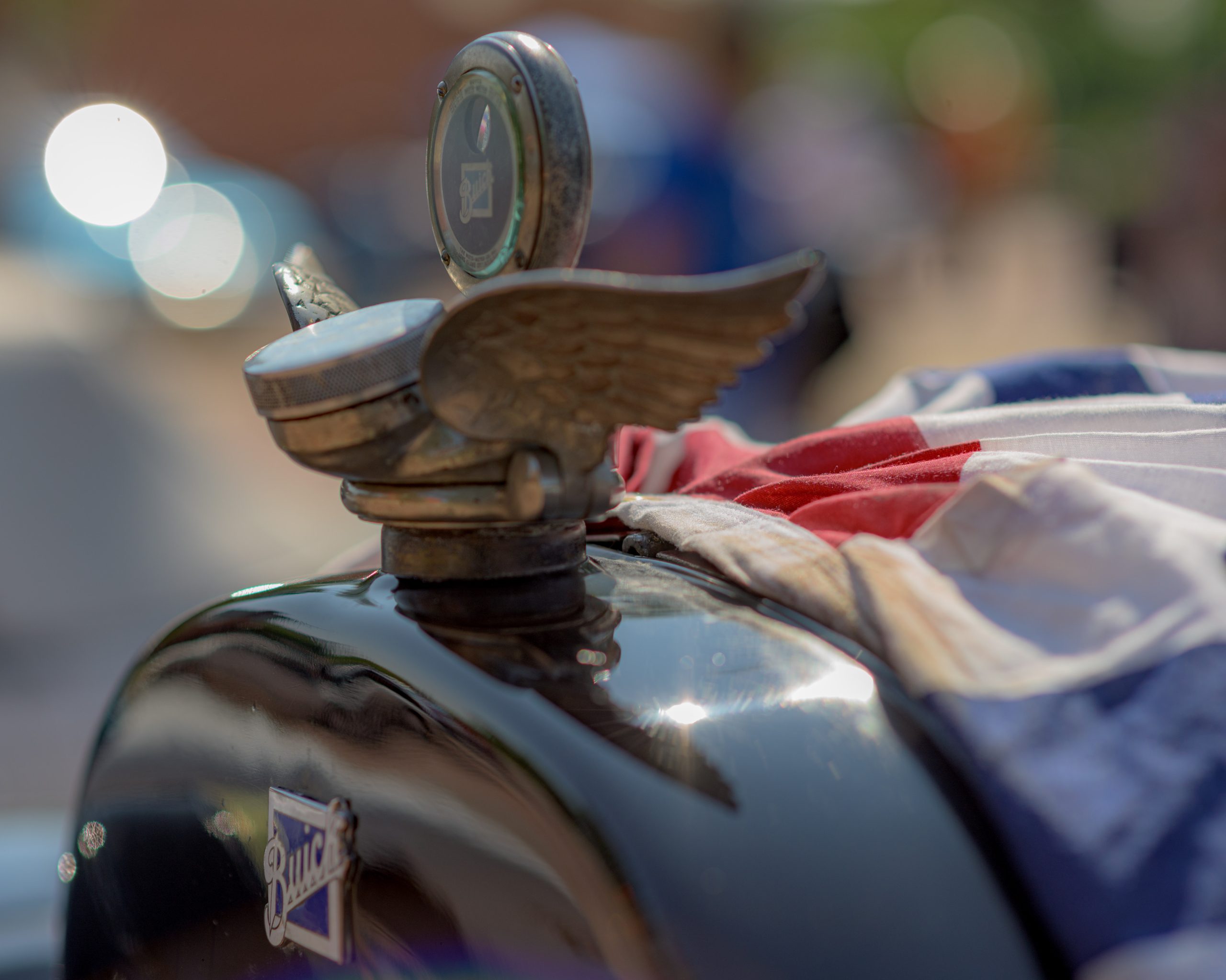 A vintage Buick hood ornament shines in the sun at the historic Durant-Dort Factory One during the 19th annual Back to the Bricks car show in Flint, Mich. on Saturday, Aug. 19, 2023. (Michael Indriolo | Flint Beat)