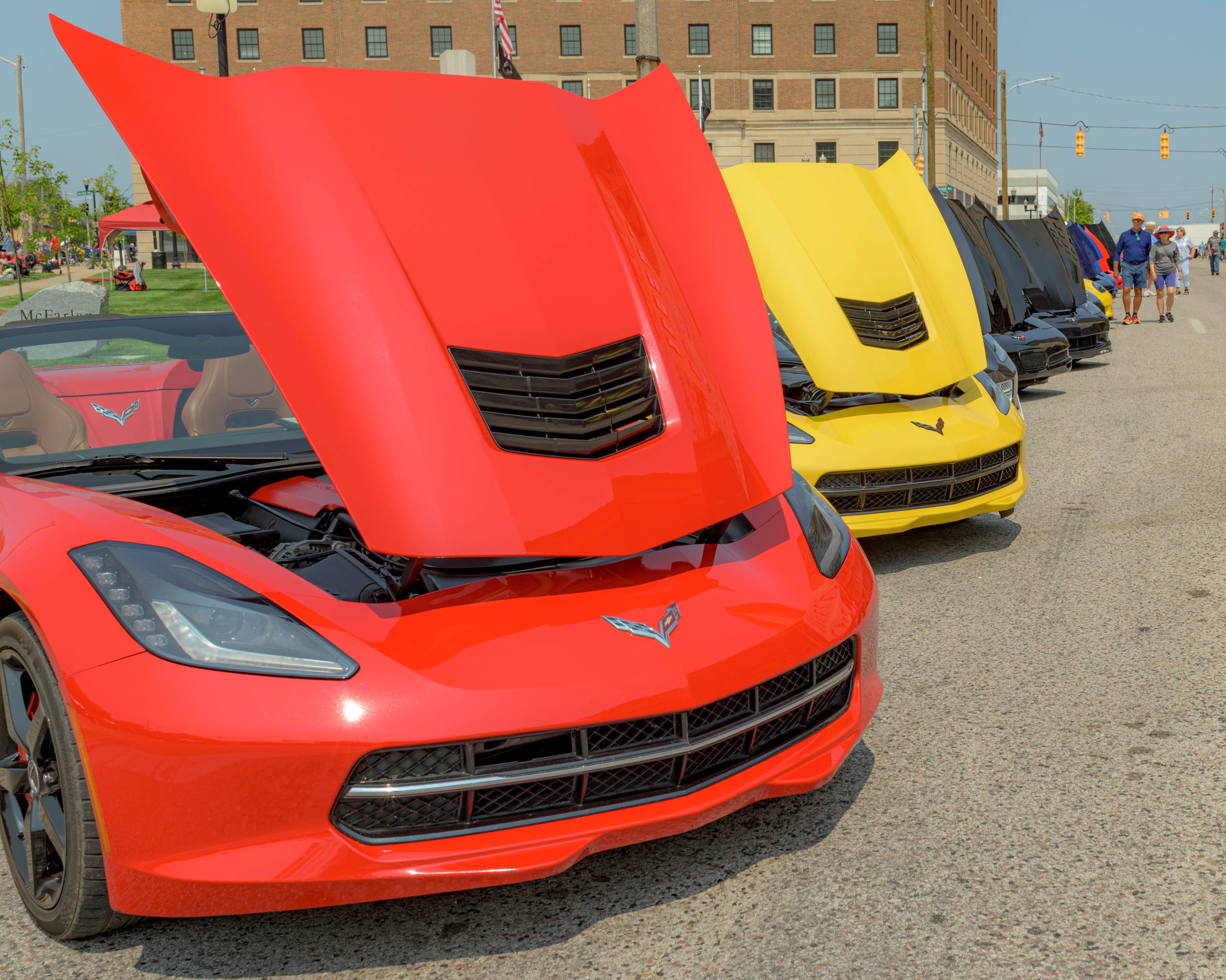 Corvette owners from all across the country line up their cars on North Saginaw Street for the “Corvette Reunion” during the 19th annual Back to the Bricks car show in Flint, Mich. on Saturday, Aug. 19, 2023. (Michael Indriolo | Flint Beat)