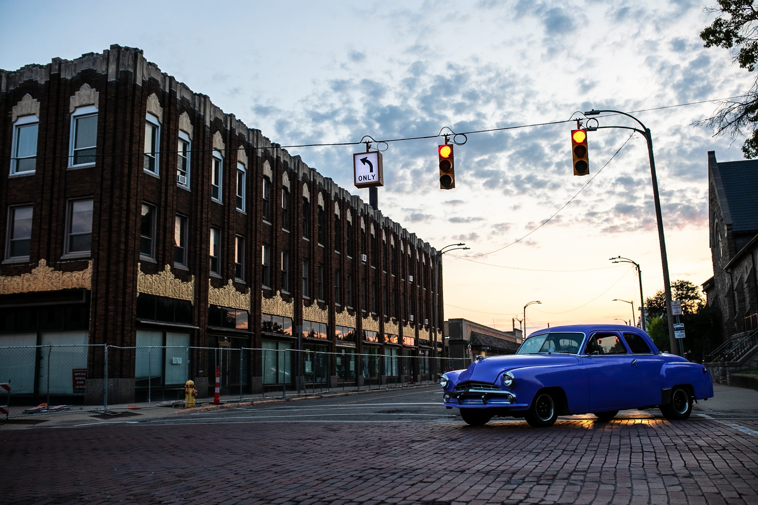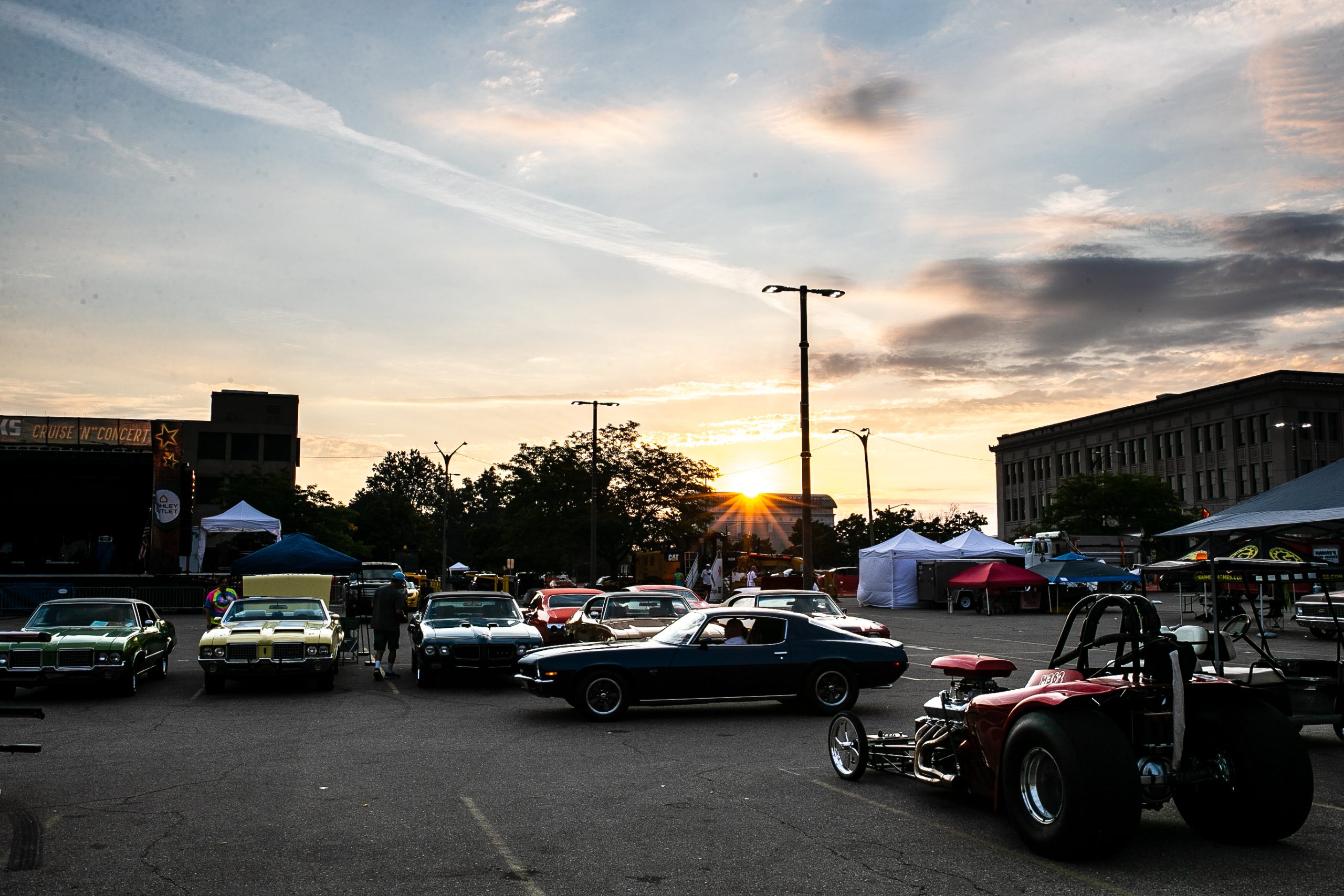 The sun rises behind a vintage car sitting on display on the bricks of Saginaw Street during the 18th annual Back to the Bricks car show & cruise in Downtown Flint on Saturday, Aug. 20, 2022. (Jenifer Veloso | Flint Beat)