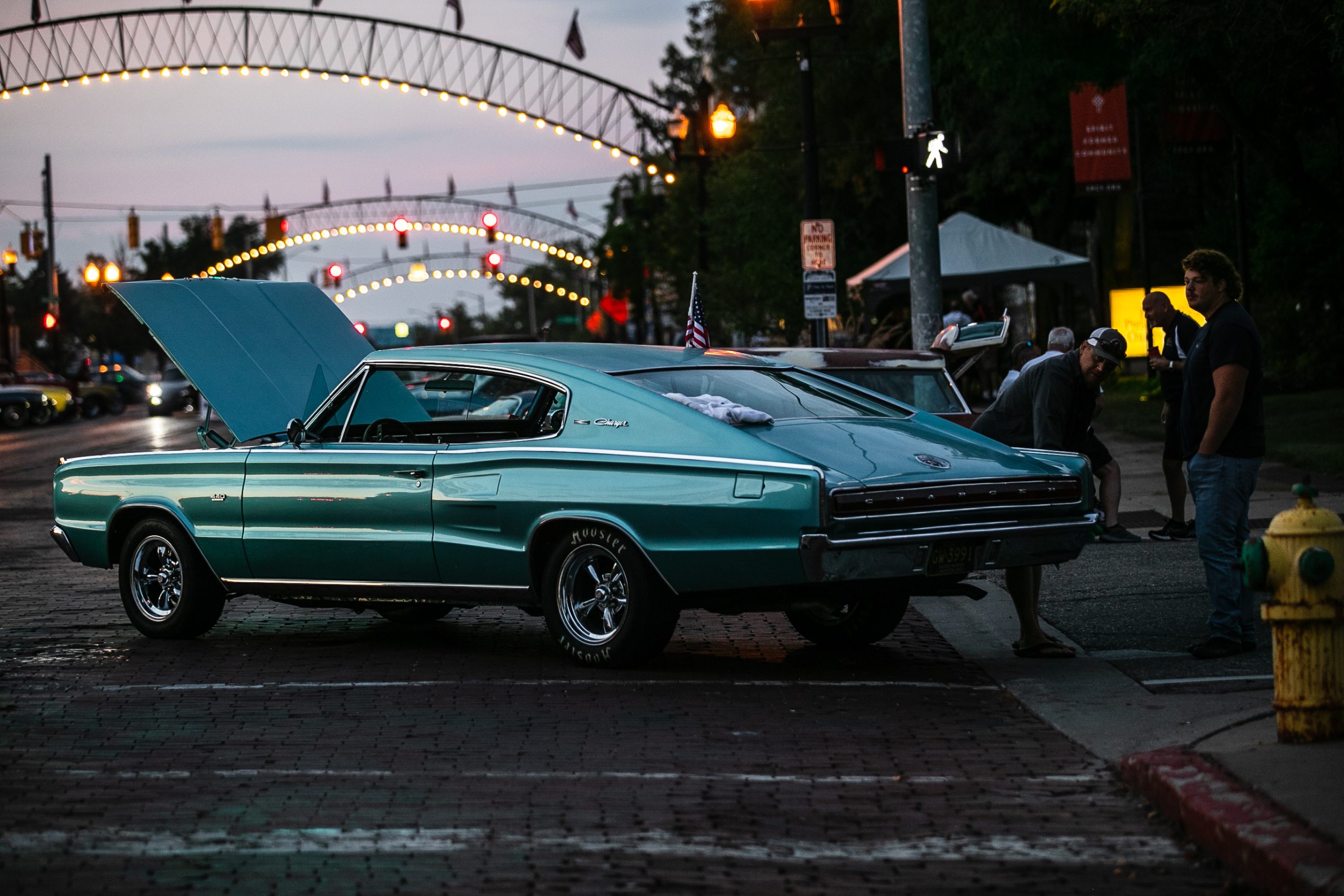 In the early hours of the morning, vintage car owners prepare their vehicles to sit on display on the bricks of Saginaw Street during the 18th annual Back to the Bricks car show & cruise in Downtown Flint on Saturday, Aug. 20, 2022. (Jenifer Veloso | Flint Beat)