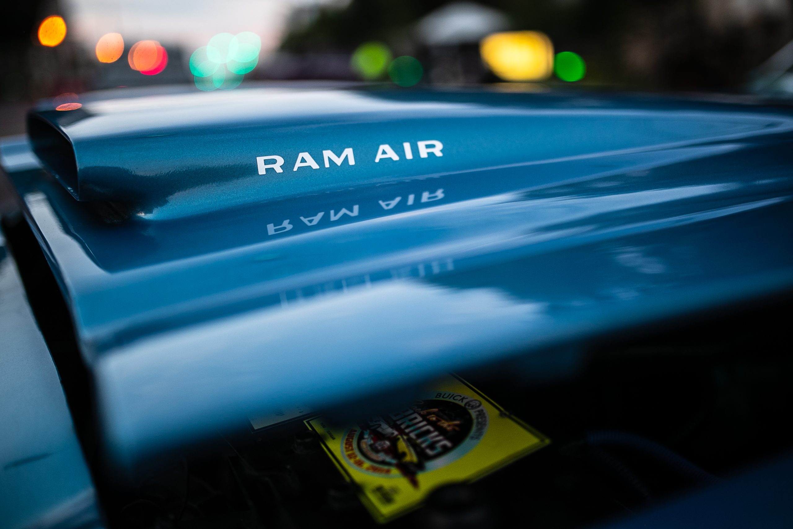 The hood scoop of a vintage Dodge muscle car reads, ‘RAM AIR’ during the 18th annual Back to the Bricks car show & cruise in Downtown Flint on Saturday, Aug. 20, 2022. (Jenifer Veloso | Flint Beat)