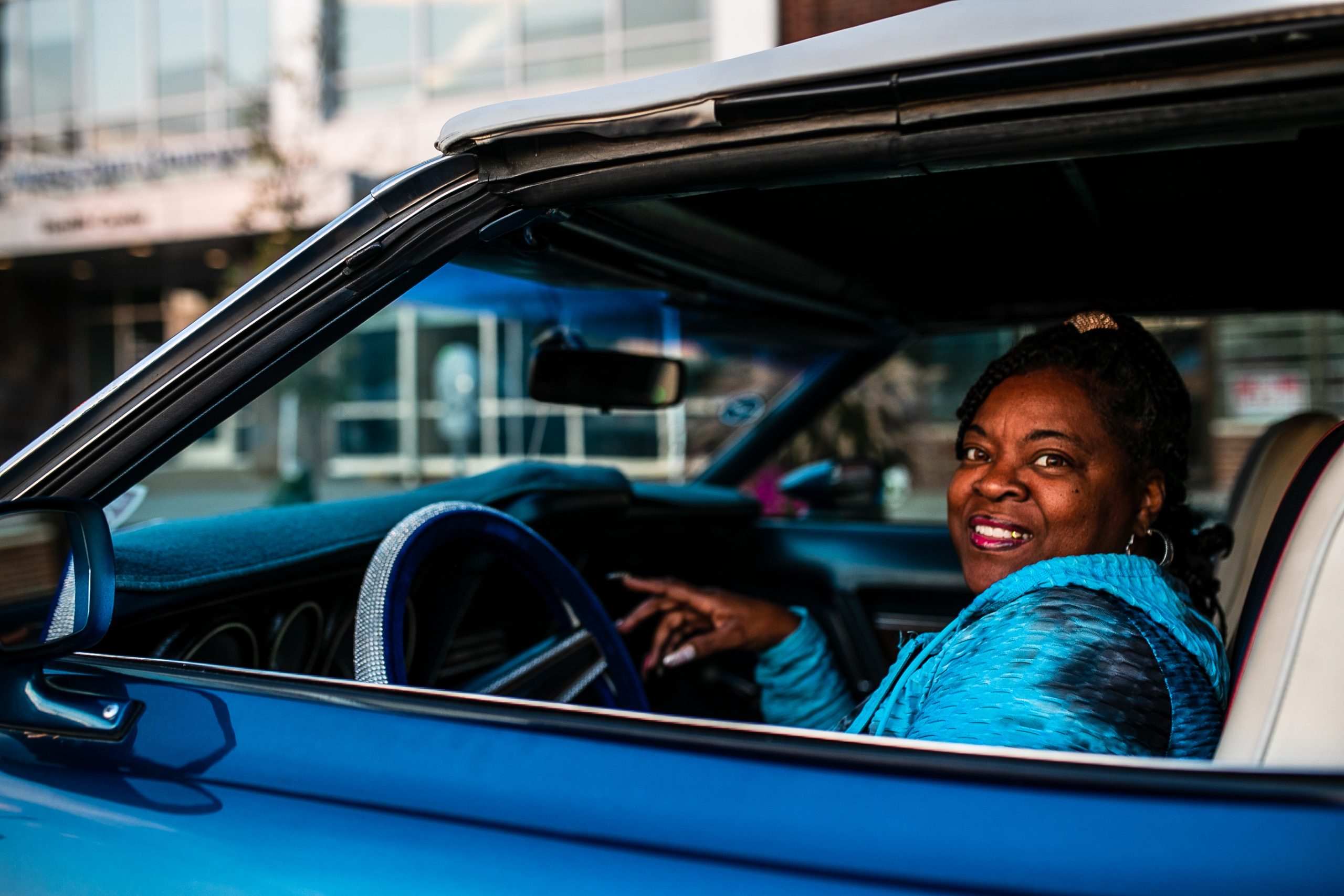 A classic car owner drives her vehicle to park it for display on the bricks of Saginaw Street during the 18th annual Back to the Bricks car show & cruise in Downtown Flint on Saturday, Aug. 20, 2022. (Jenifer Veloso | Flint Beat)In the early hours of the morning, vintage car owners drive and park their vehicles to sit on display on the bricks of Saginaw Street during the 18th annual Back to the Bricks car show & cruise in Downtown Flint on Saturday, Aug. 20, 2022. (Jenifer Veloso | Flint Beat)