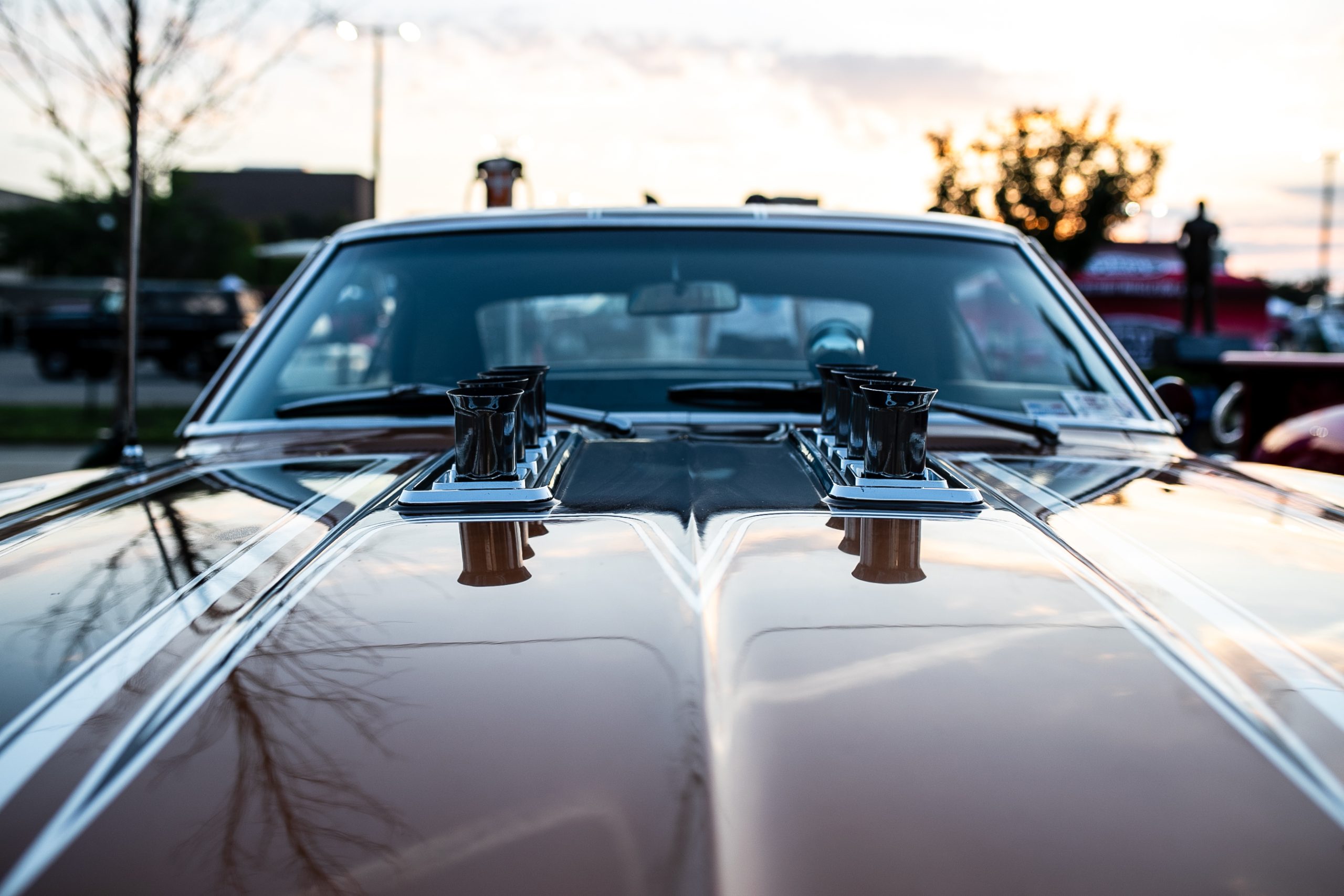 A custom hood scoop of a vintage Chevrolet sparkles in the sunlight during the 18th annual Back to the Bricks car show & cruise in Downtown Flint on Saturday, Aug. 20, 2022. (Jenifer Veloso | Flint Beat)