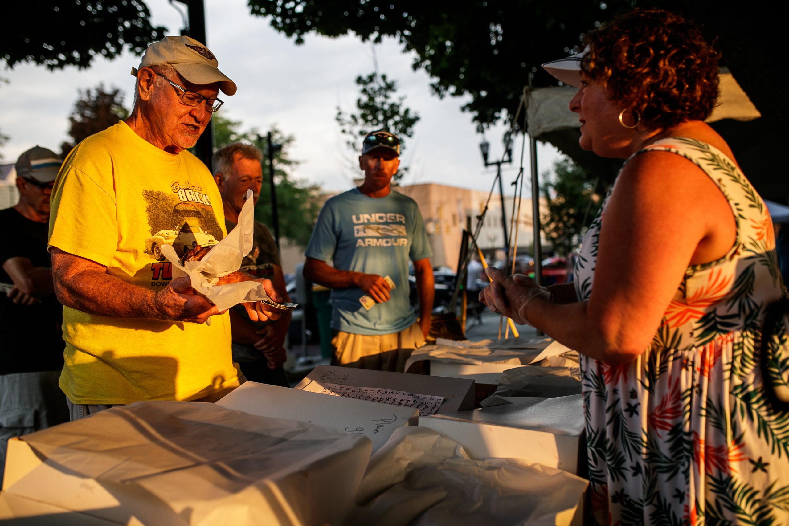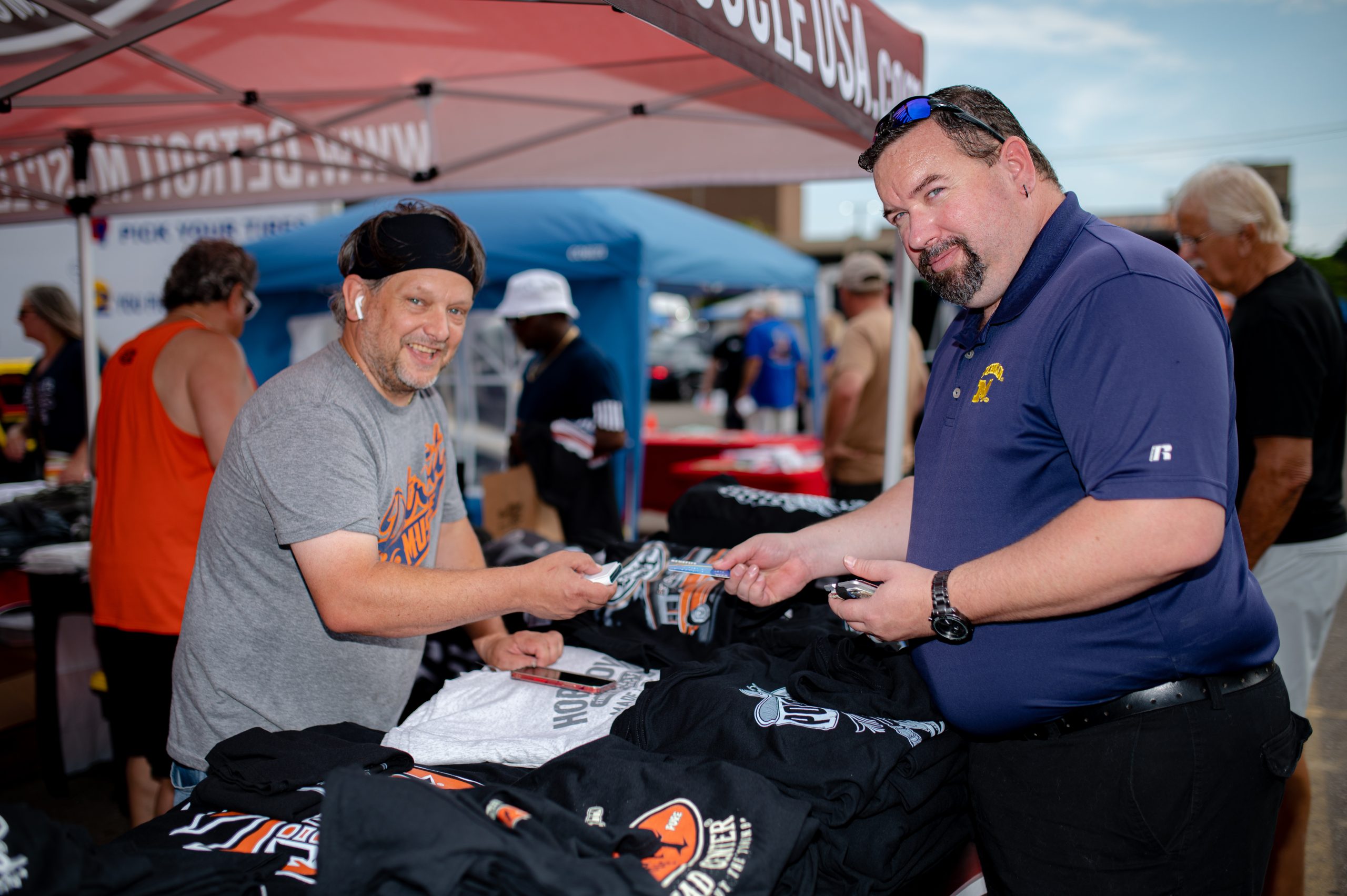 David Myers, from Swartz Creek, Mich., buys a shirt from Darren Hamilton of the lifestyle company Detroit Muscle, during Back to the Bricks in Downtown Flint, Mich. on Saturday, Aug. 20, 2022. (Michael Indriolo | Flint Beat)