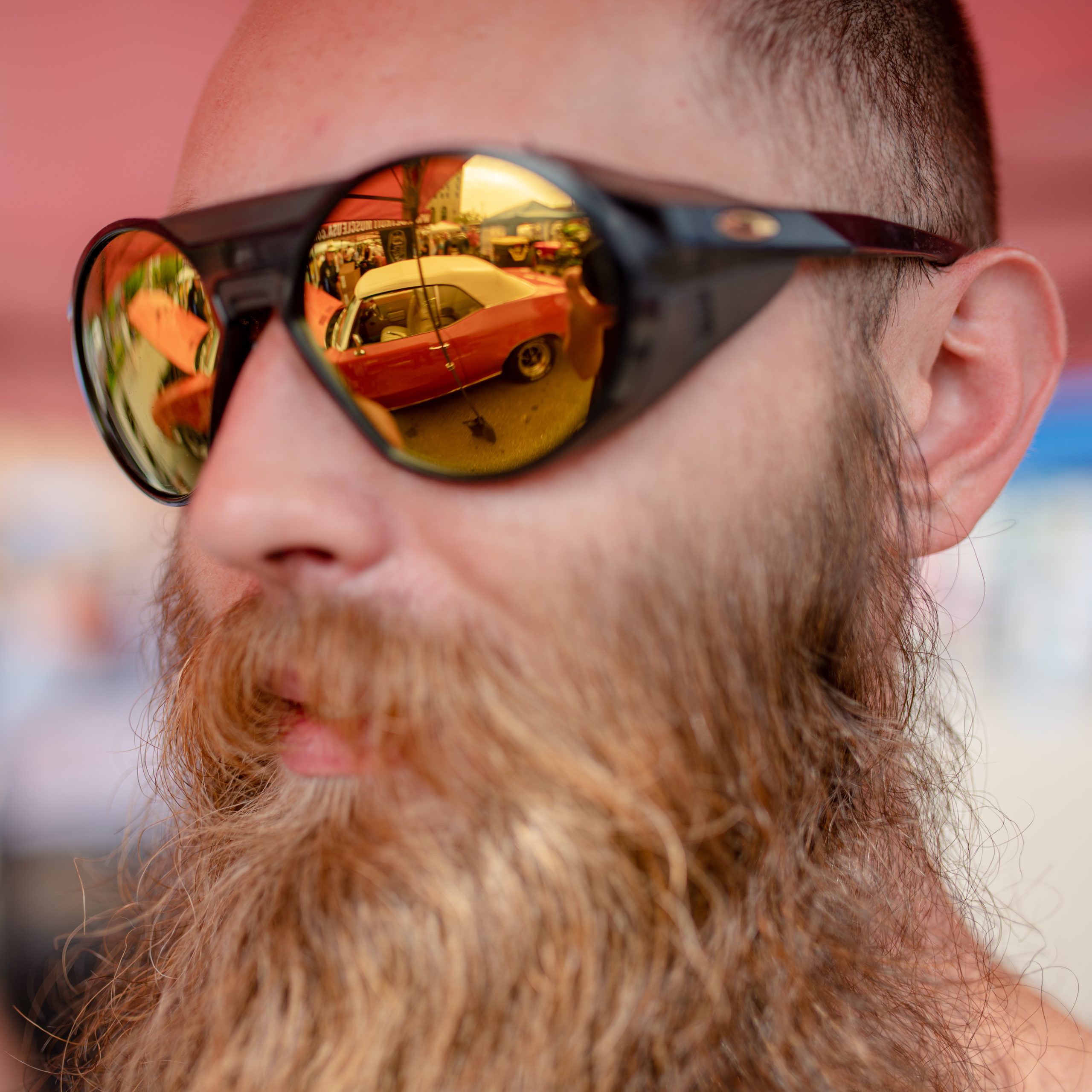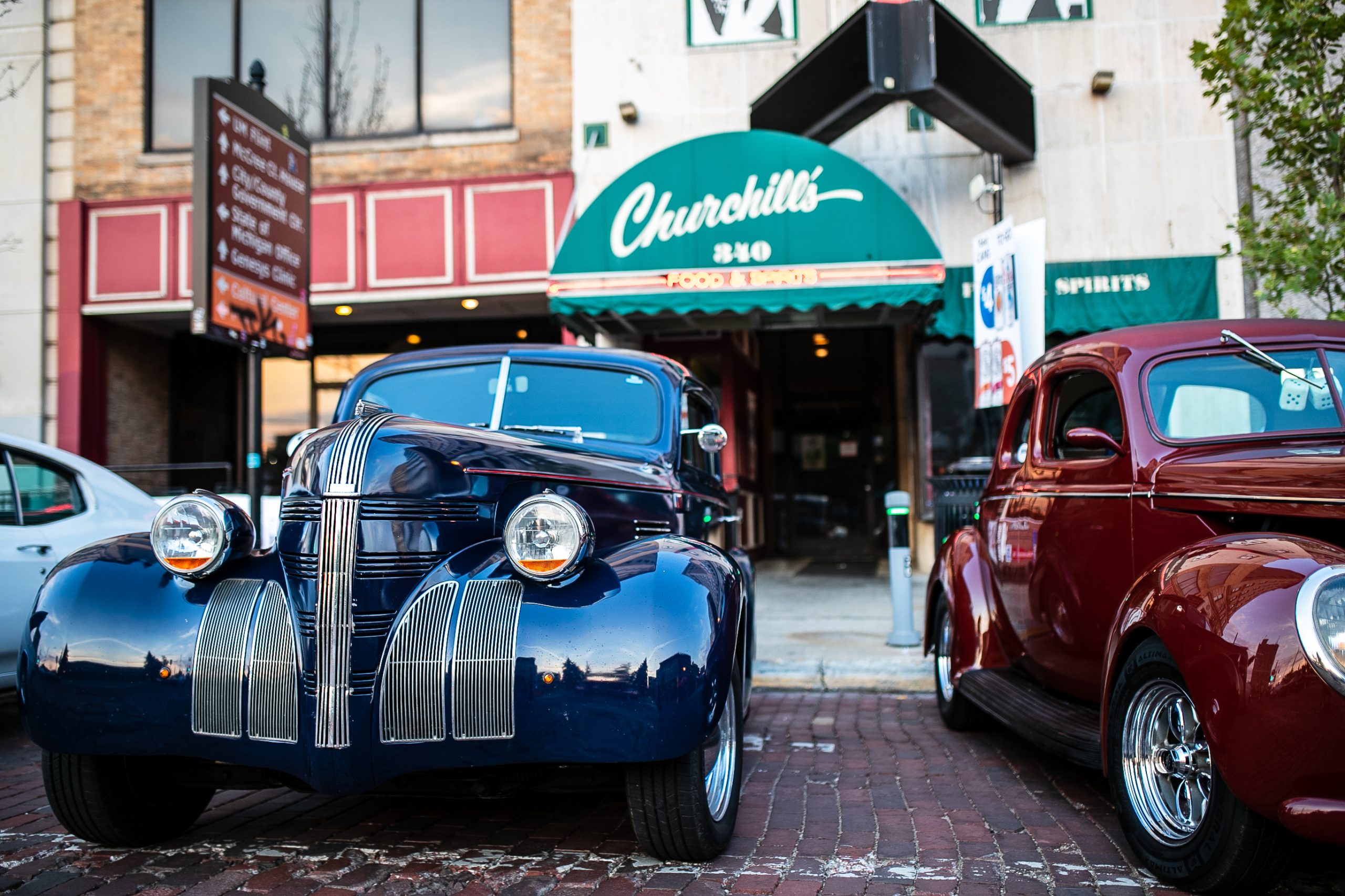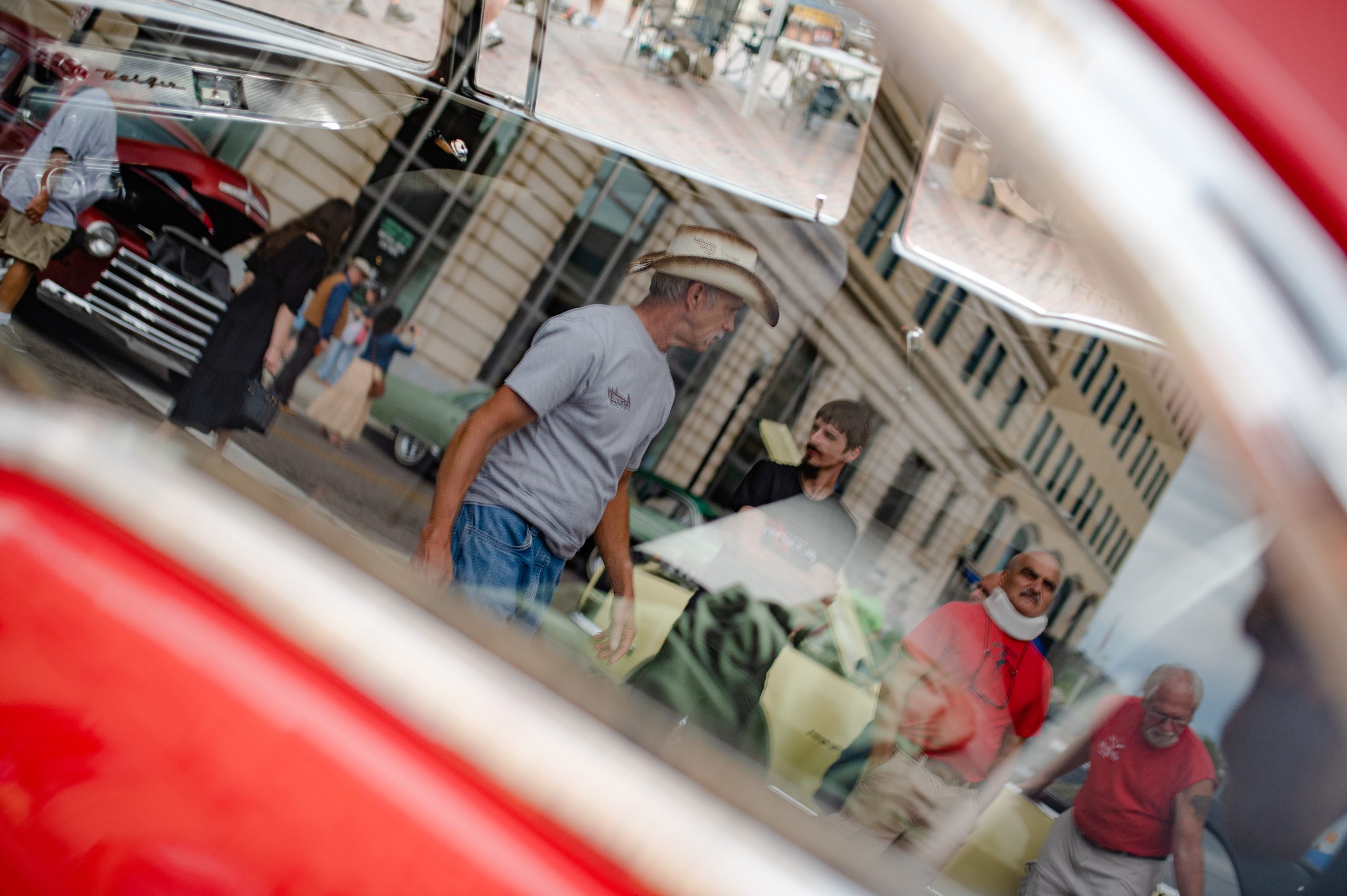 The iconic bricks of Saginaw Street are reflected in Norton Stadler’s 1937 Ford Club Cabriolet during Back to the Bricks in Downtown Flint, Mich. on Saturday, Aug. 20, 2022. (Michael Indriolo | Flint Beat)
