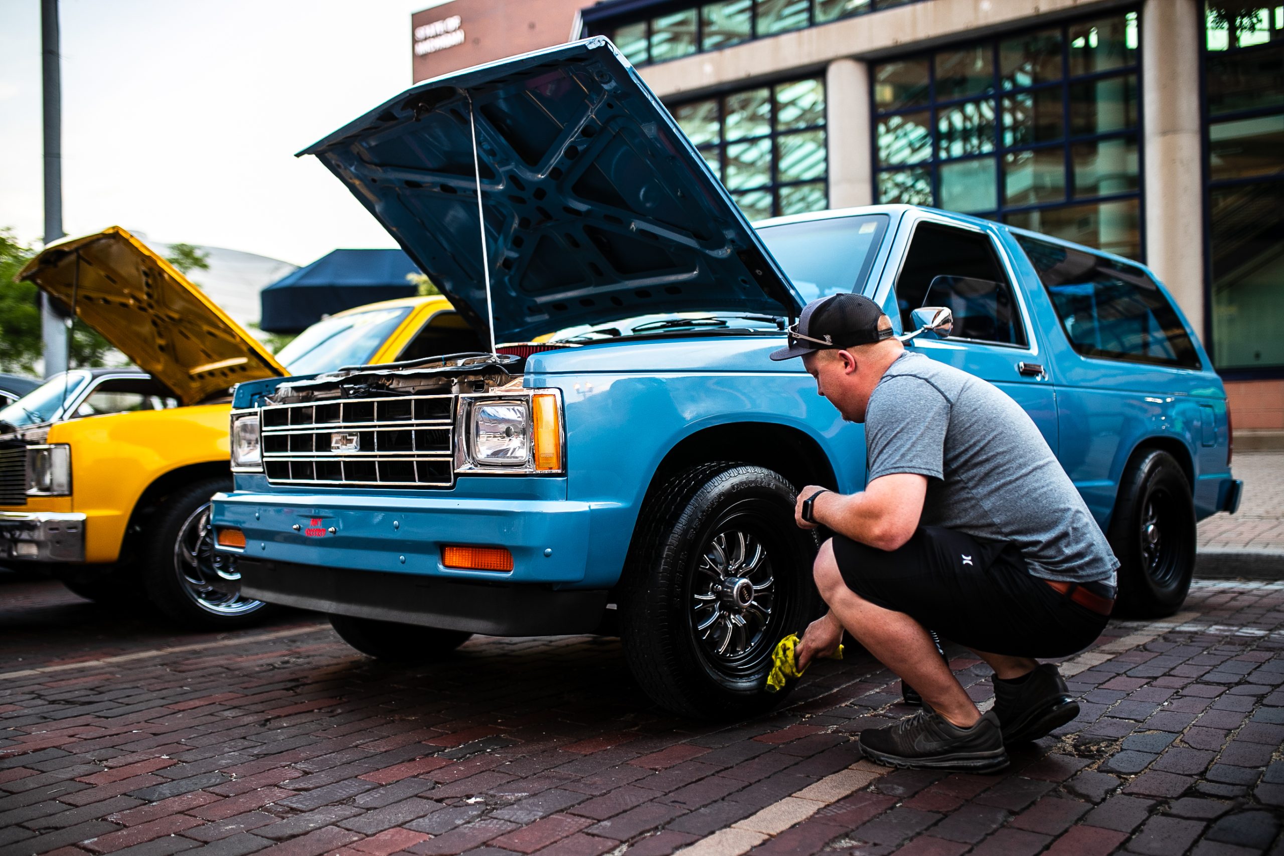A classic car owner shines the tires of his vintage Chevrolet Blazer to sit on display on the bricks of Saginaw Street during the 18th annual Back to the Bricks car show & cruise in Downtown Flint on Saturday, Aug. 20, 2022. (Jenifer Veloso | Flint Beat)