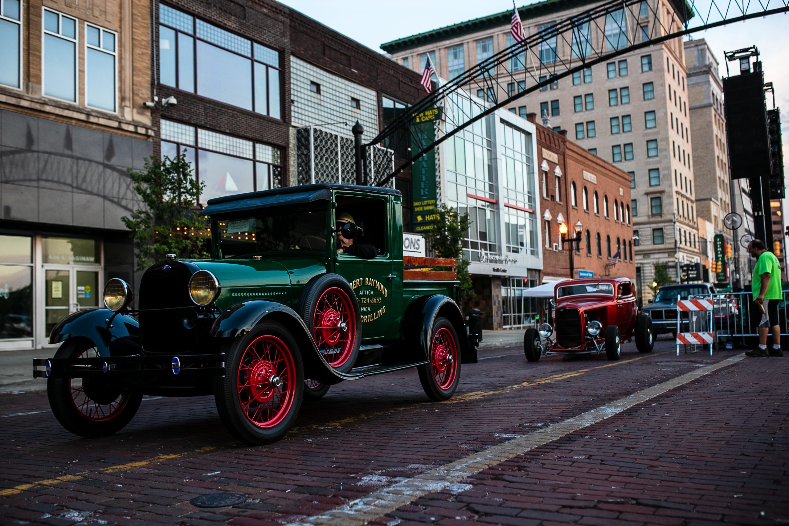 In the early hours of the morning, classic car owners drive their vehicles down the bricks of Saginaw Street during the 18th annual Back to the Bricks car show & cruise in Downtown Flint on Saturday, Aug. 20, 2022. (Jenifer Veloso | Flint Beat)