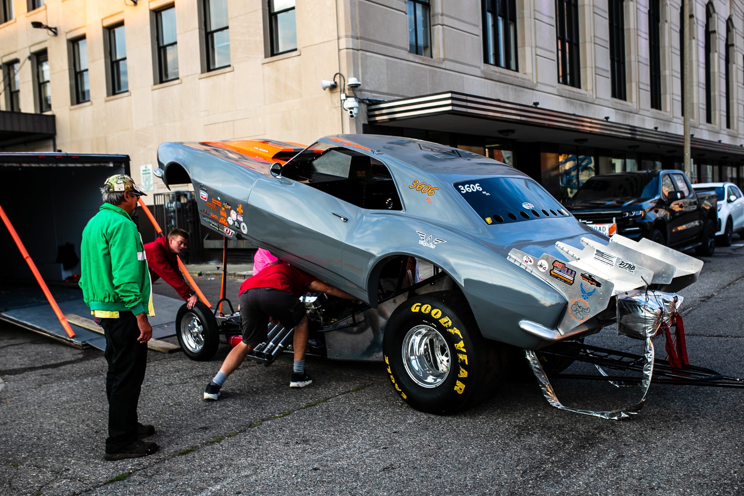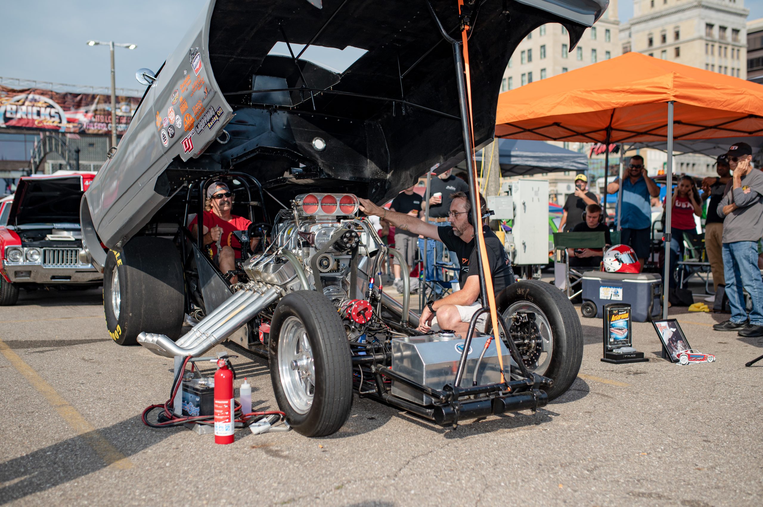 Phil Landrum prepares his 1967 Camaro Funny Car to sit on display during the 18th annual Back to the Bricks car show & cruise in Downtown Flint on Saturday, Aug. 20, 2022. (Jenifer Veloso | Flint Beat)
